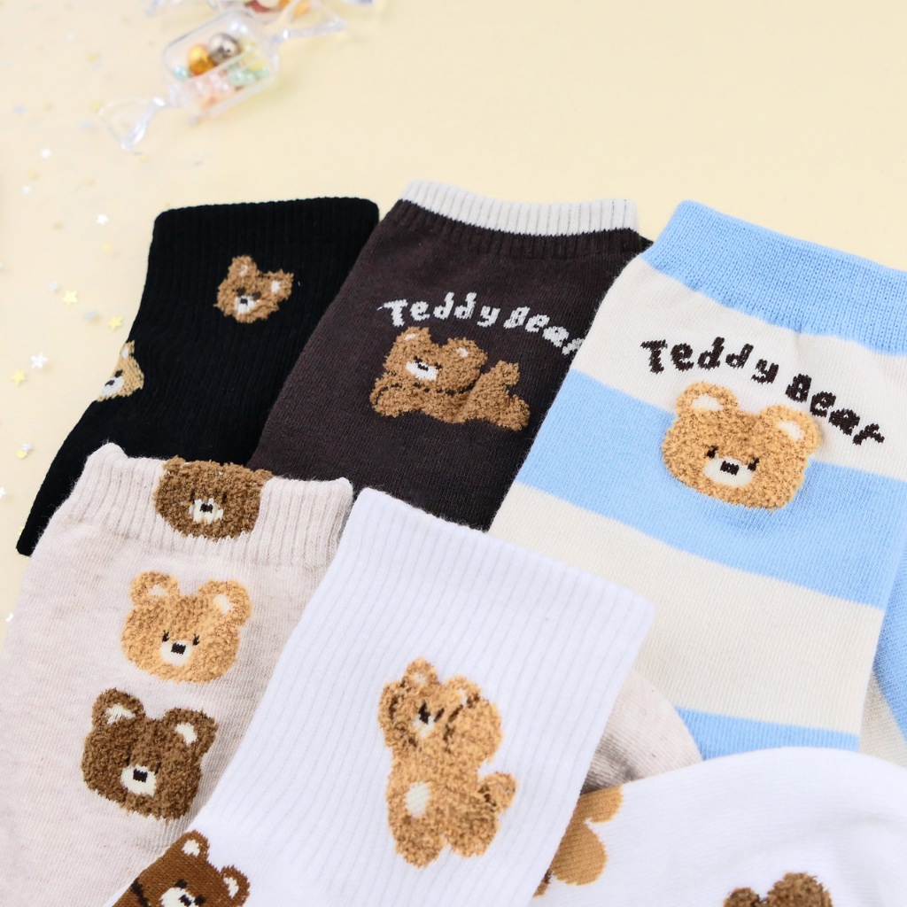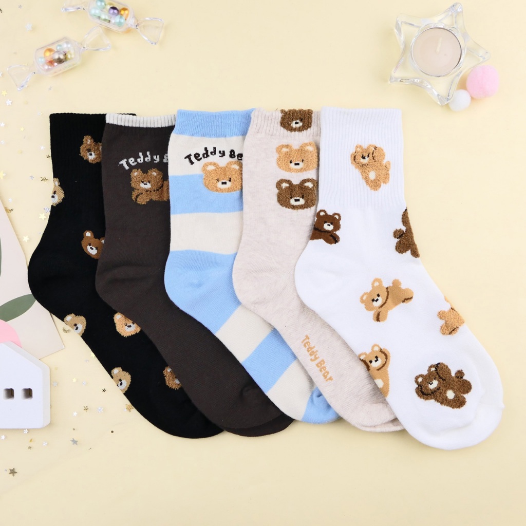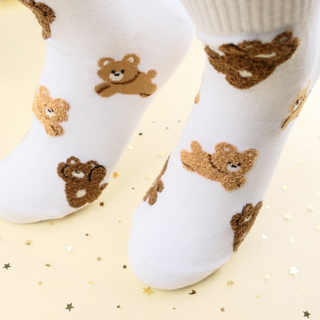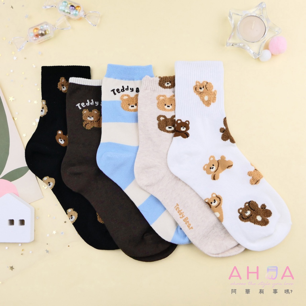 AHUA 阿華有事嗎 立體毛毛泰迪熊熊系列中筒襪 K2333 正韓襪子 百搭純棉襪 韓系必備 少女襪黑底滿版小頭|深咖底米白襪口|藍底米黃條紋|米白底立體耳朵三隻熊熊|白底滿版飛奔熊熊SocksAHUA 韓國襪子品牌旗艦店