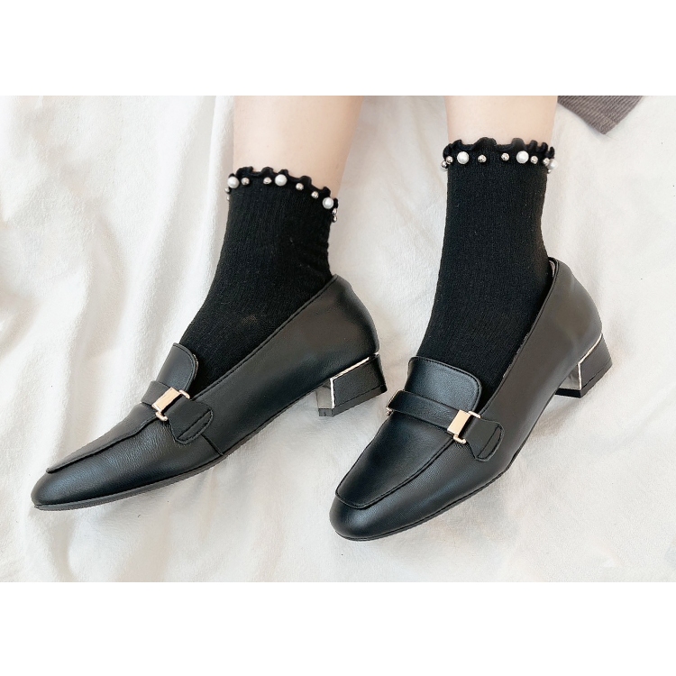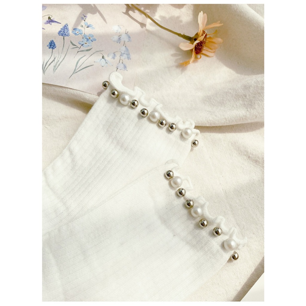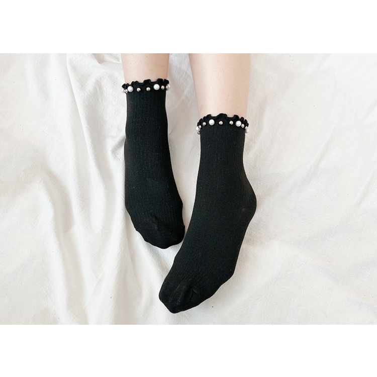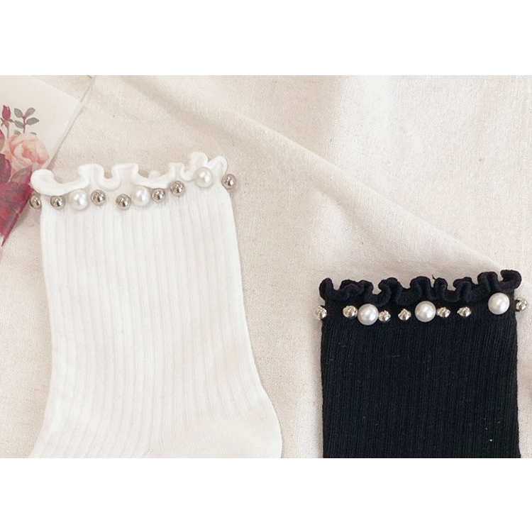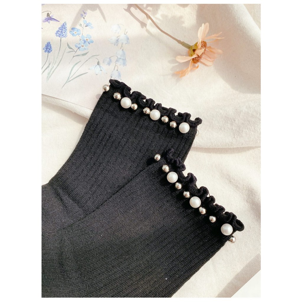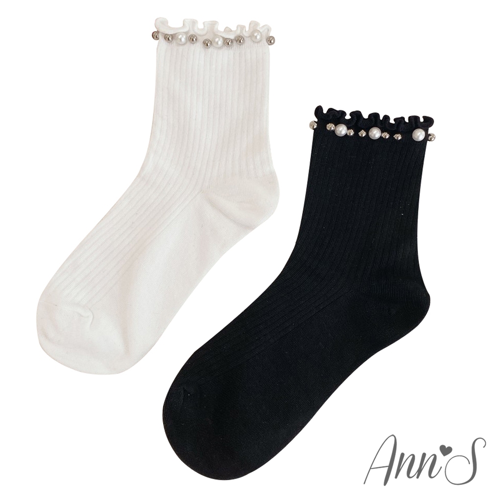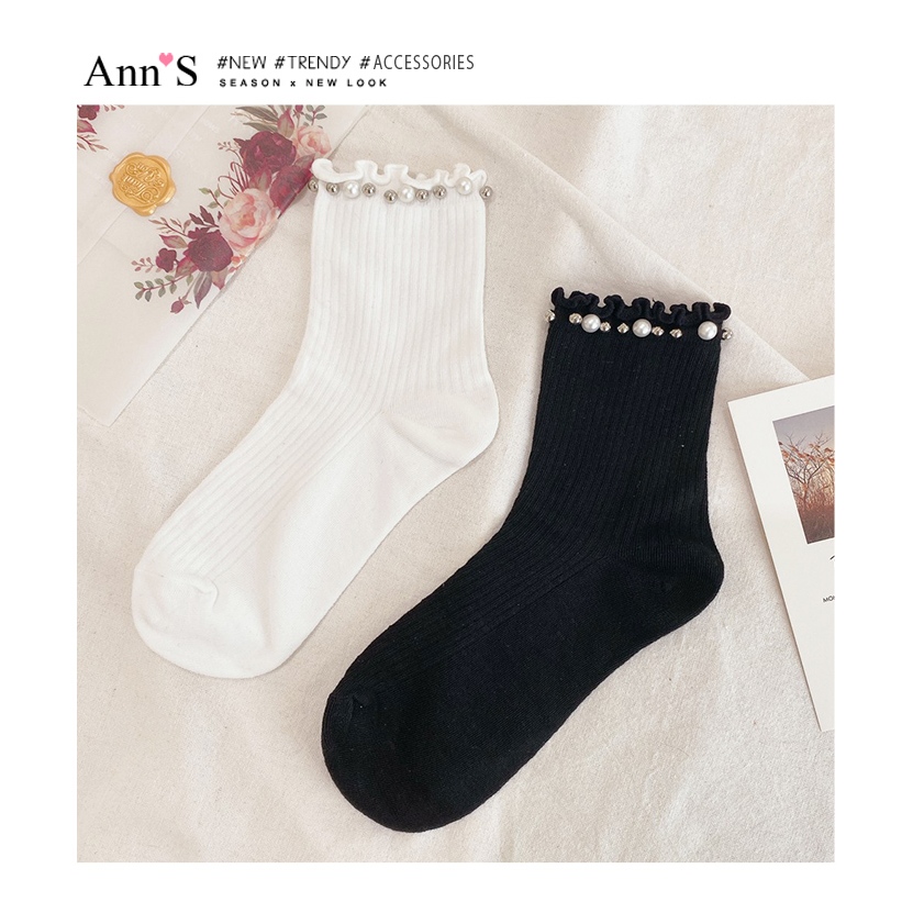 Ann’S 木耳花邊珍珠學院風直紋中筒襪-2色黑|白SocksAnn’S 女鞋官方旗艦店