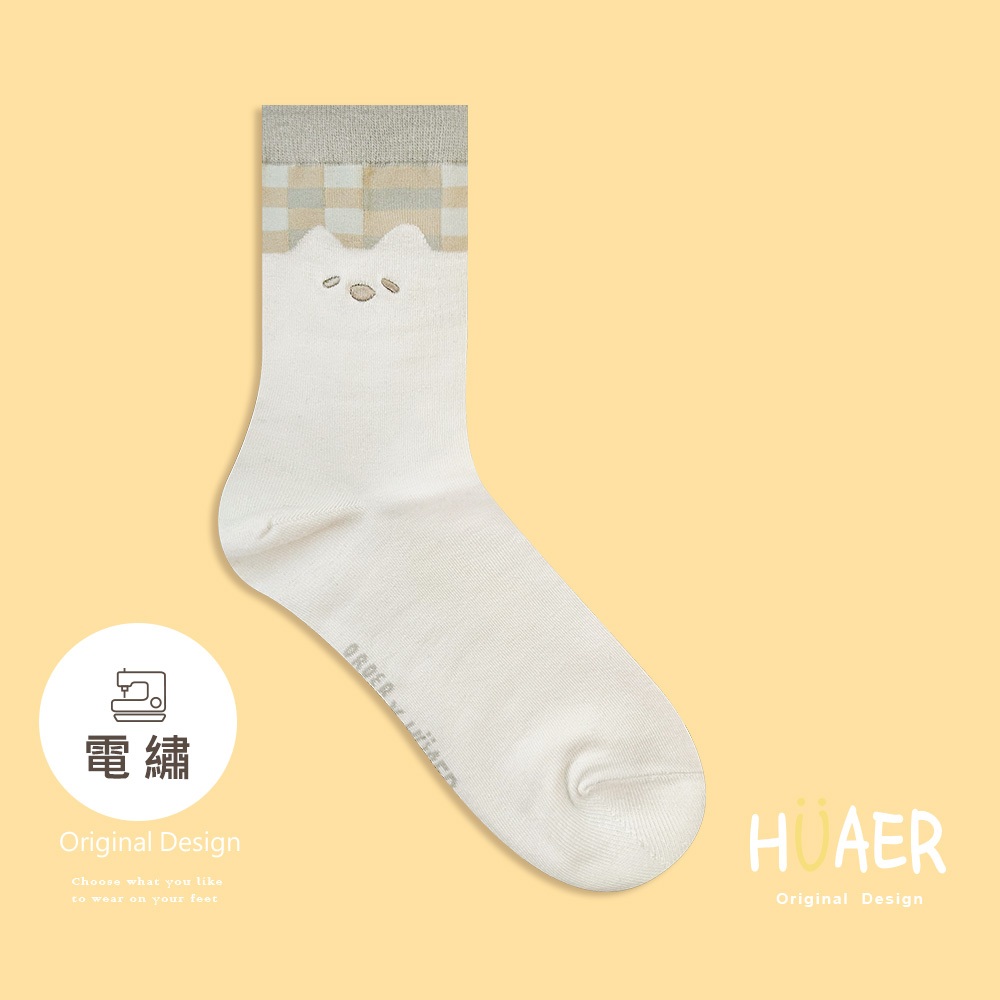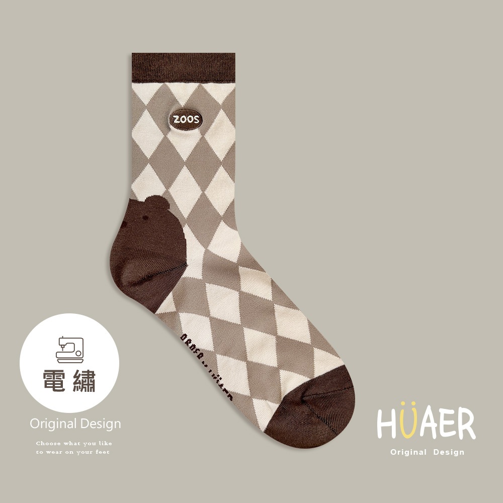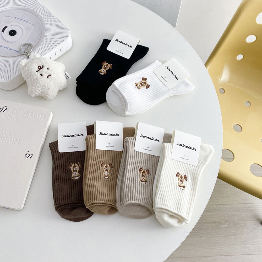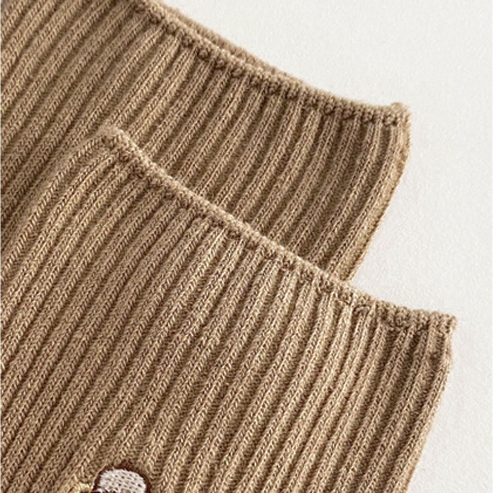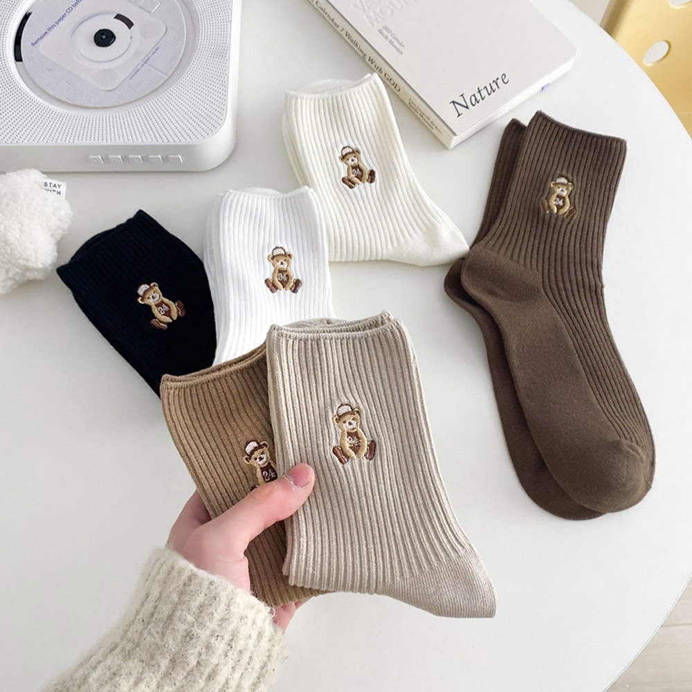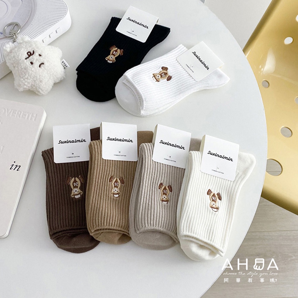 AUHA 日系襪子 戴帽子小熊刺繡坑條中筒襪 女襪 襪子推薦 熊熊襪子 S0425 中筒純棉襪 阿華有事嗎黑色|白底|米黃底|奶茶底|卡其底|深咖底SocksAHUA 韓國襪子品牌旗艦店