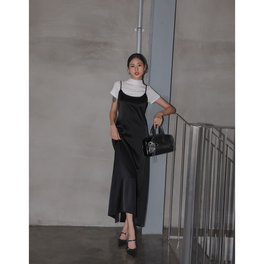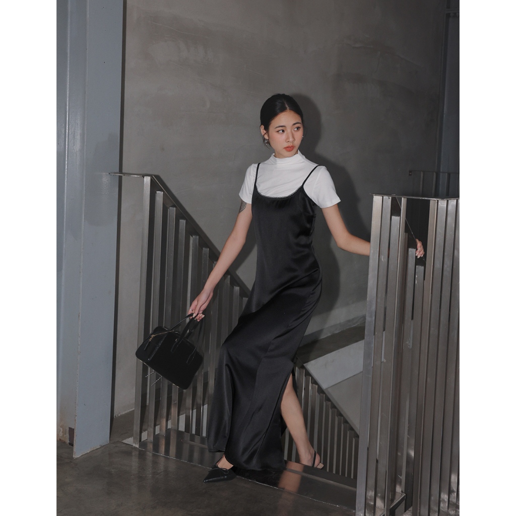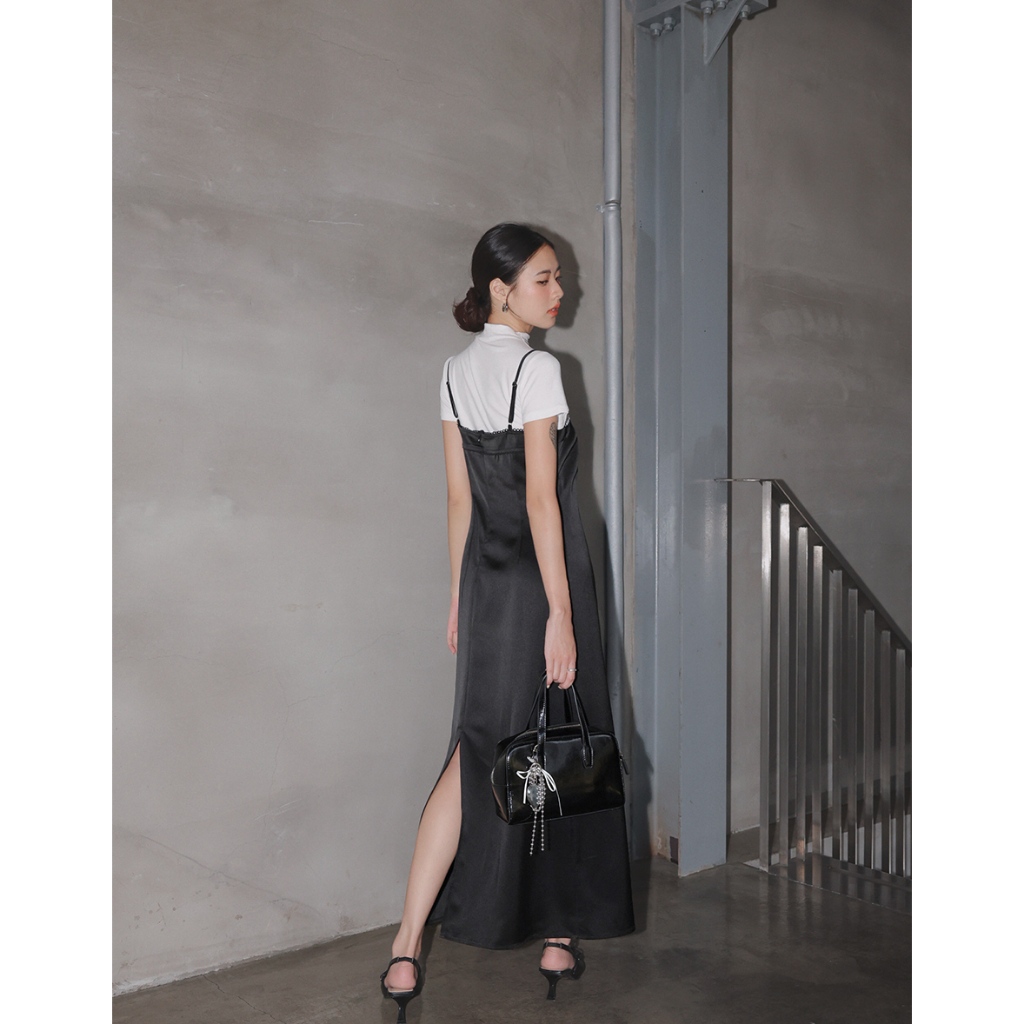 AIR SPACE LADY 蕾絲滾邊緞面開衩長洋裝(黑/灰) 女裝 現貨黑,S|黑,M|黑,L|灰,S|灰,M|灰,LAIR SPACE