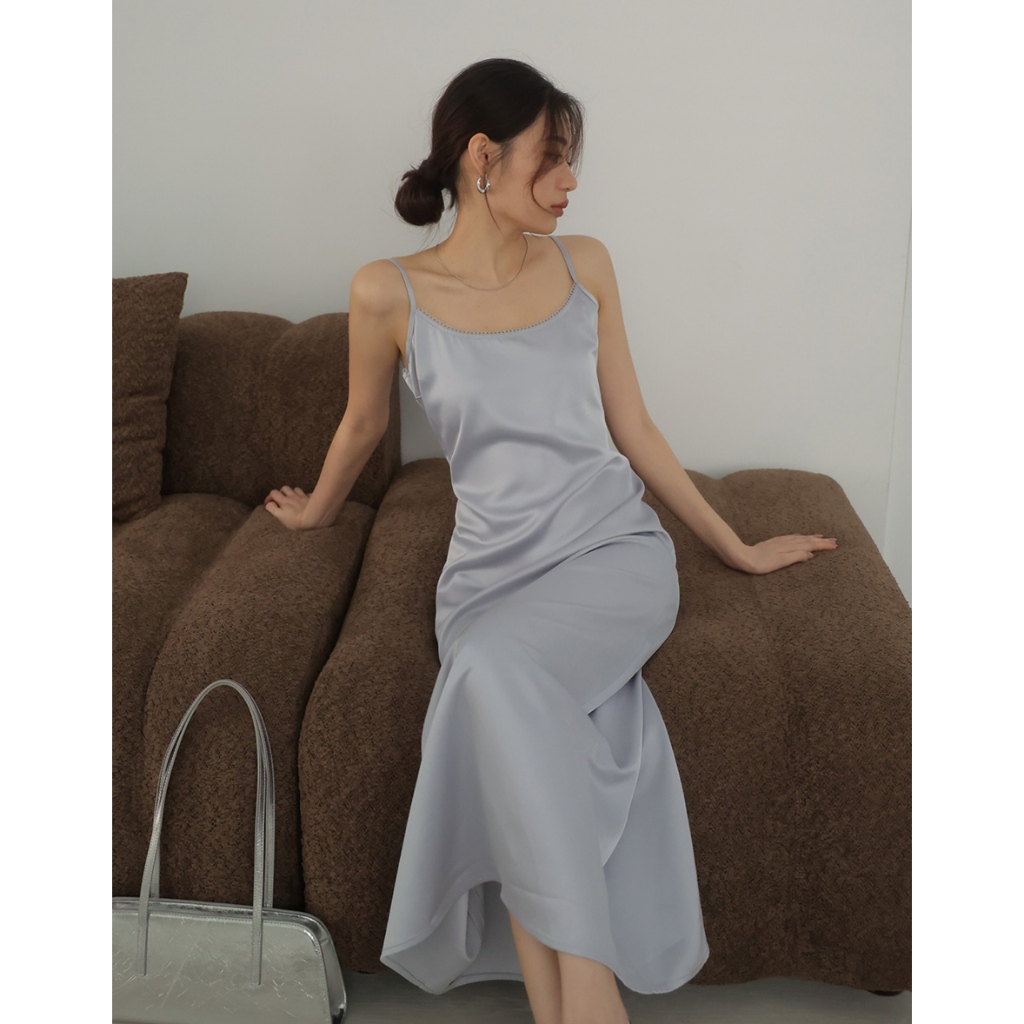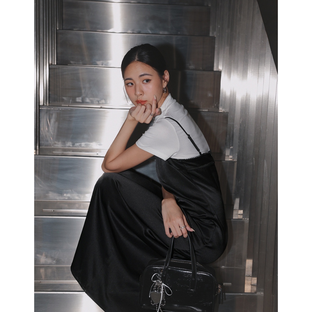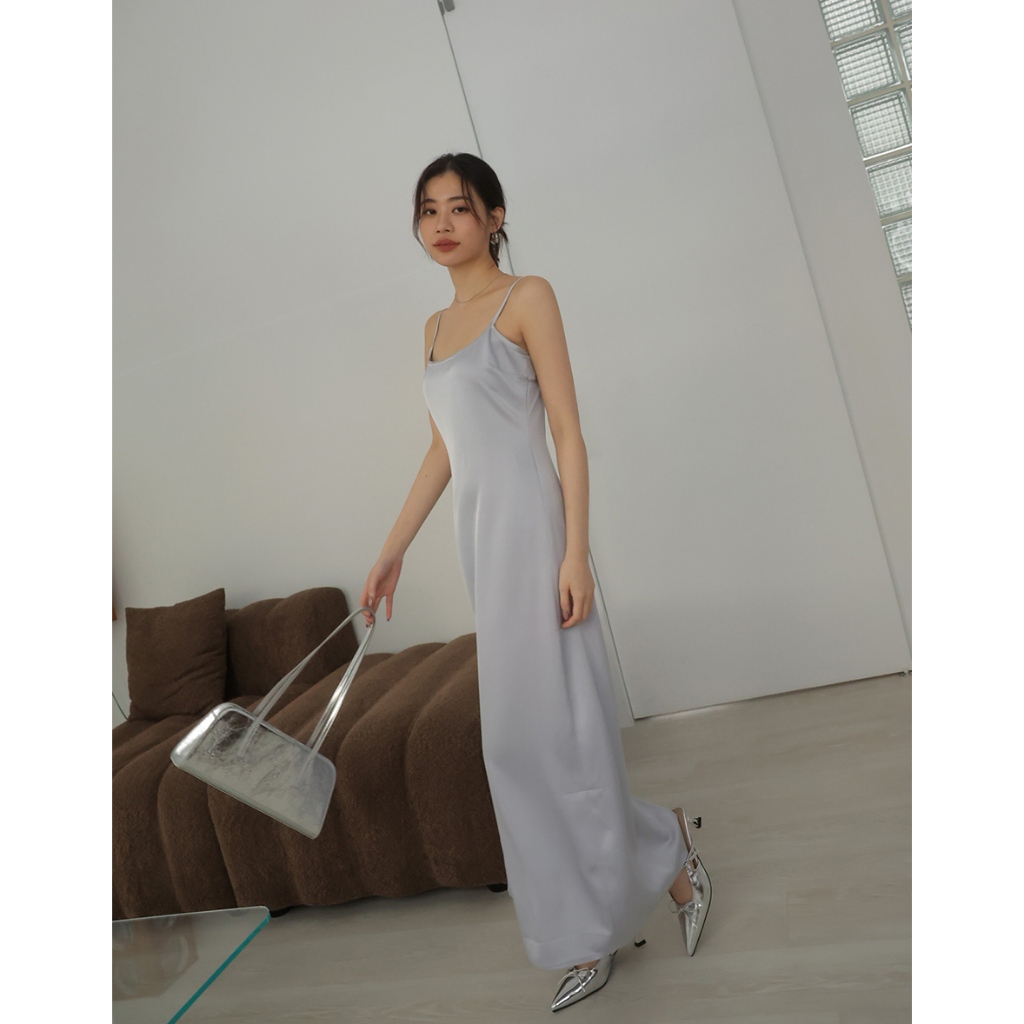 AIR SPACE LADY 蕾絲滾邊緞面開衩長洋裝(黑/灰) 女裝 現貨黑,S|黑,M|黑,L|灰,S|灰,M|灰,LAIR SPACE