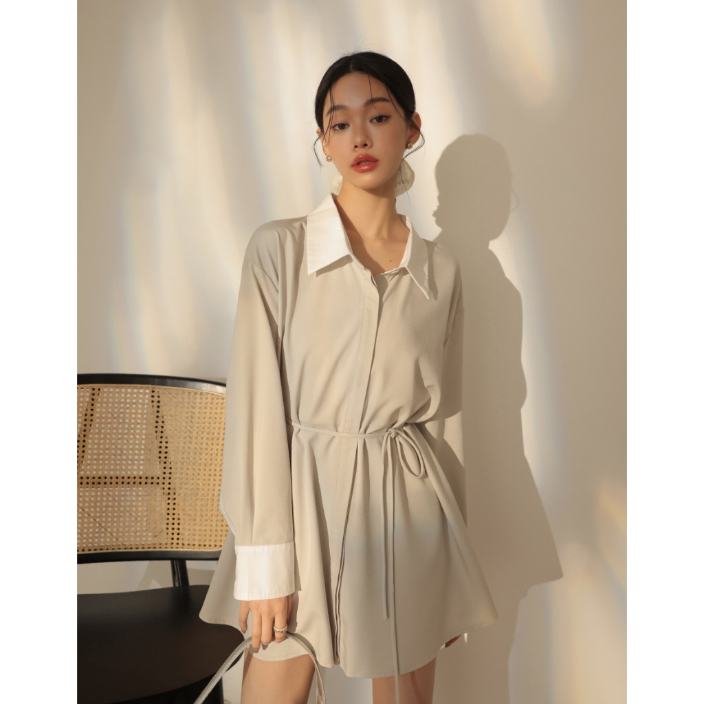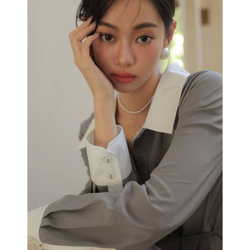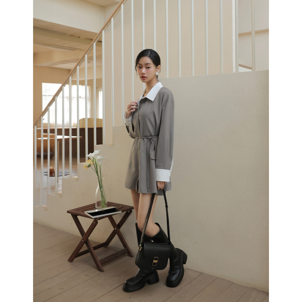 CHIC A SPACE 尖領暗門襟配色襯衫短洋裝(杏/灰) 女裝 現貨杏,F|灰,FAIR SPACE