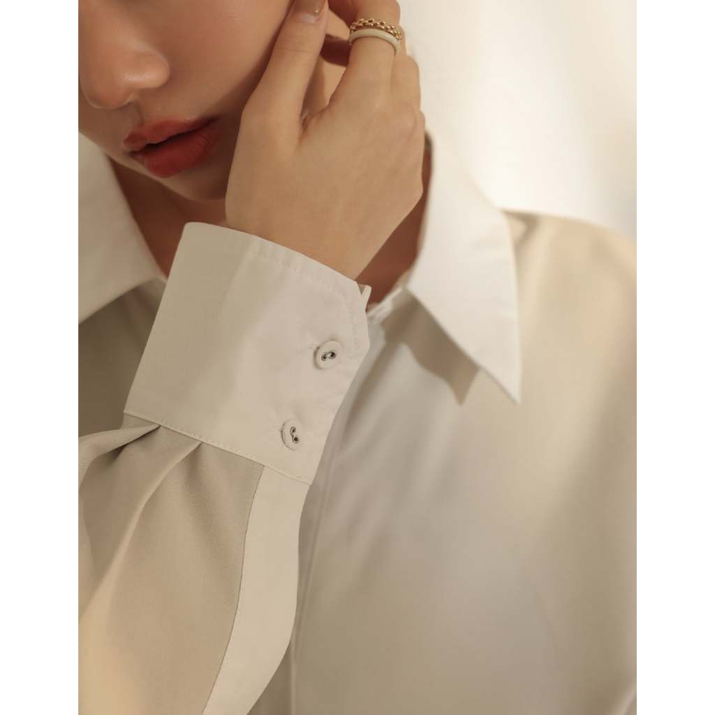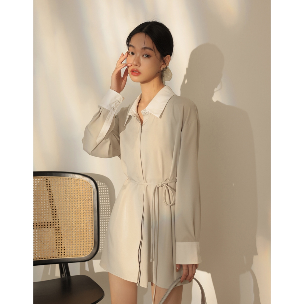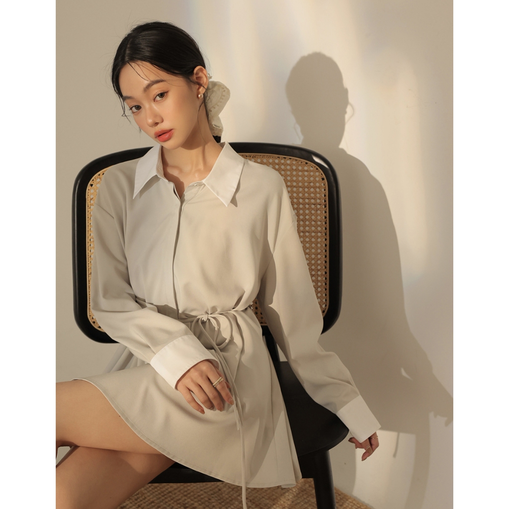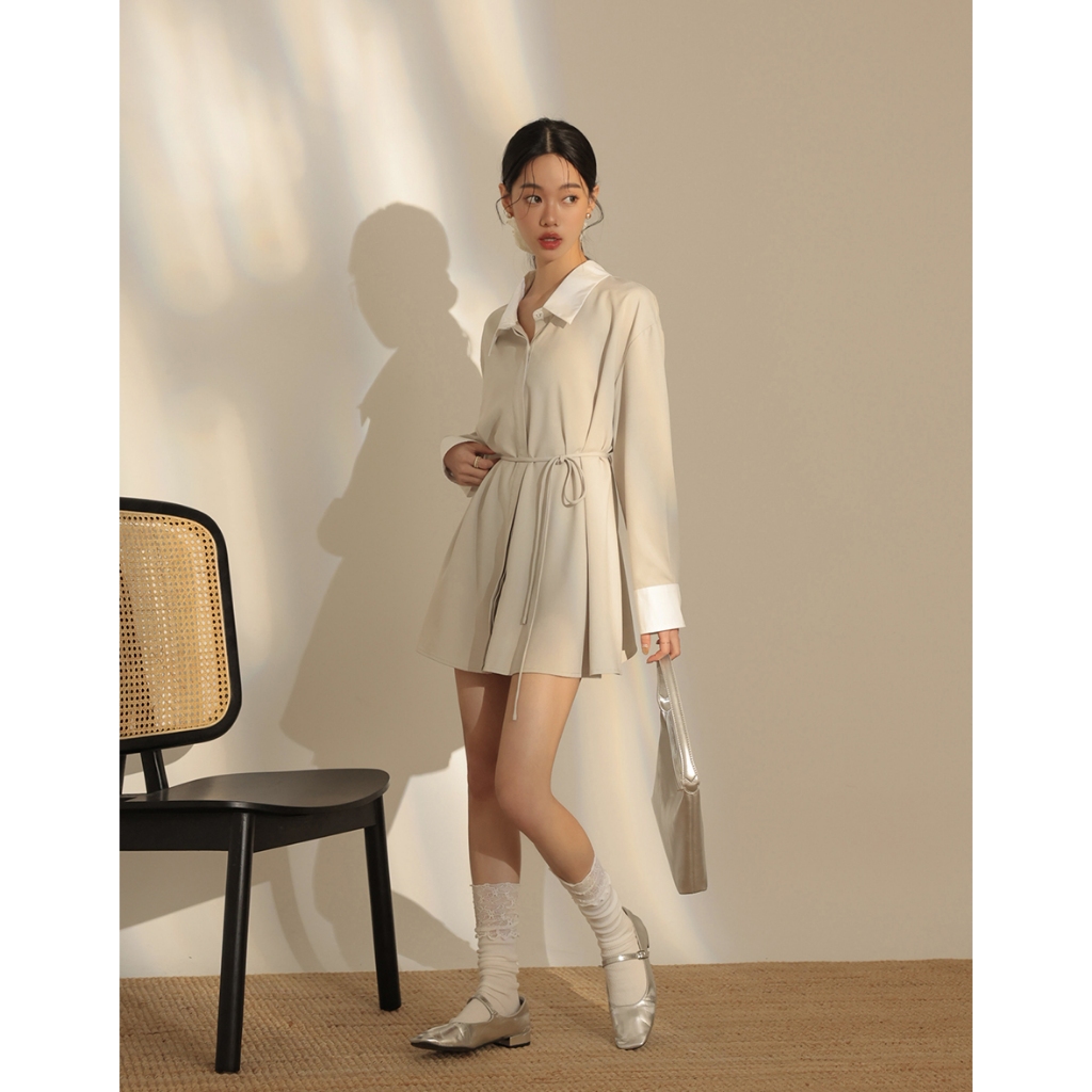 CHIC A SPACE 尖領暗門襟配色襯衫短洋裝(杏/灰) 女裝 現貨杏,F|灰,FAIR SPACE