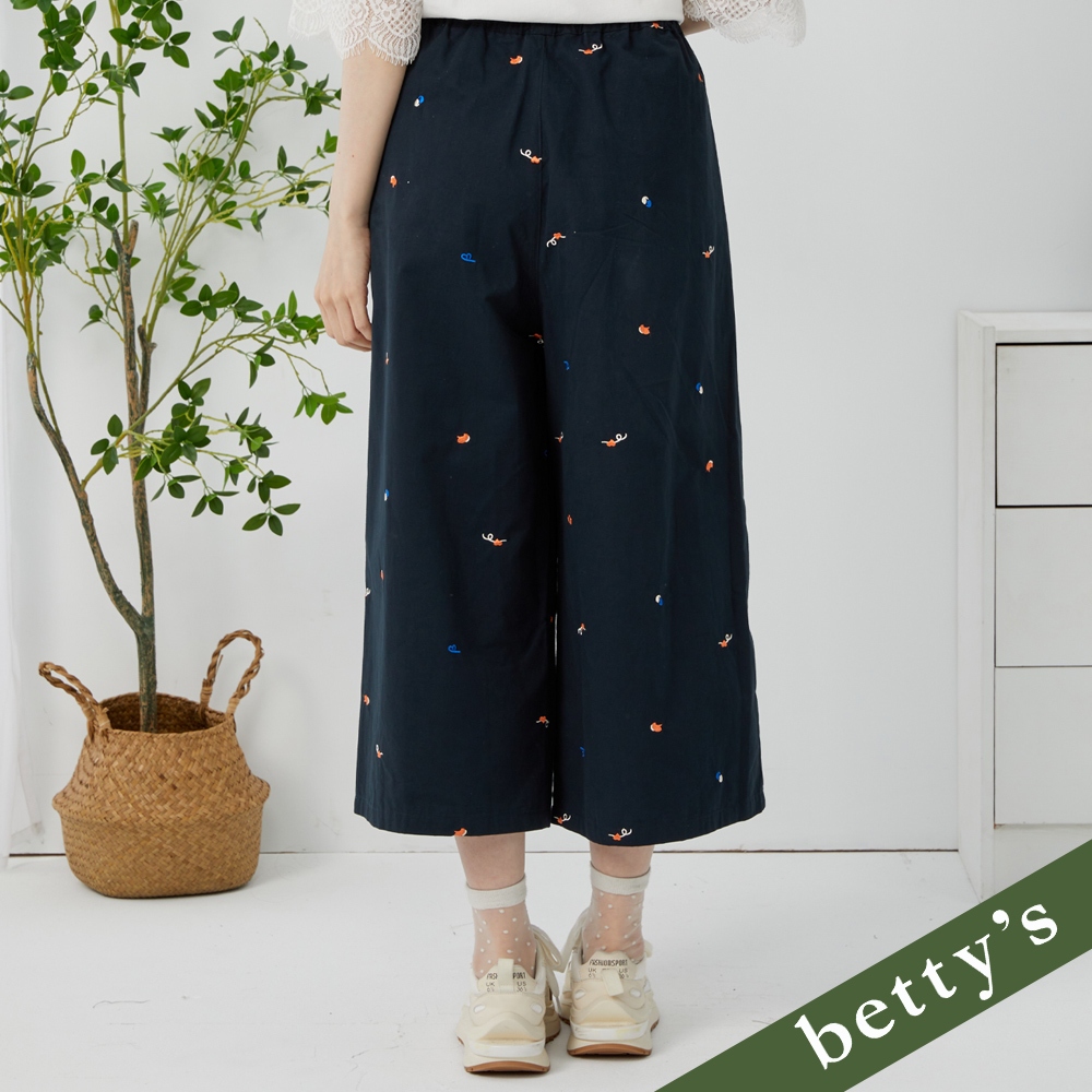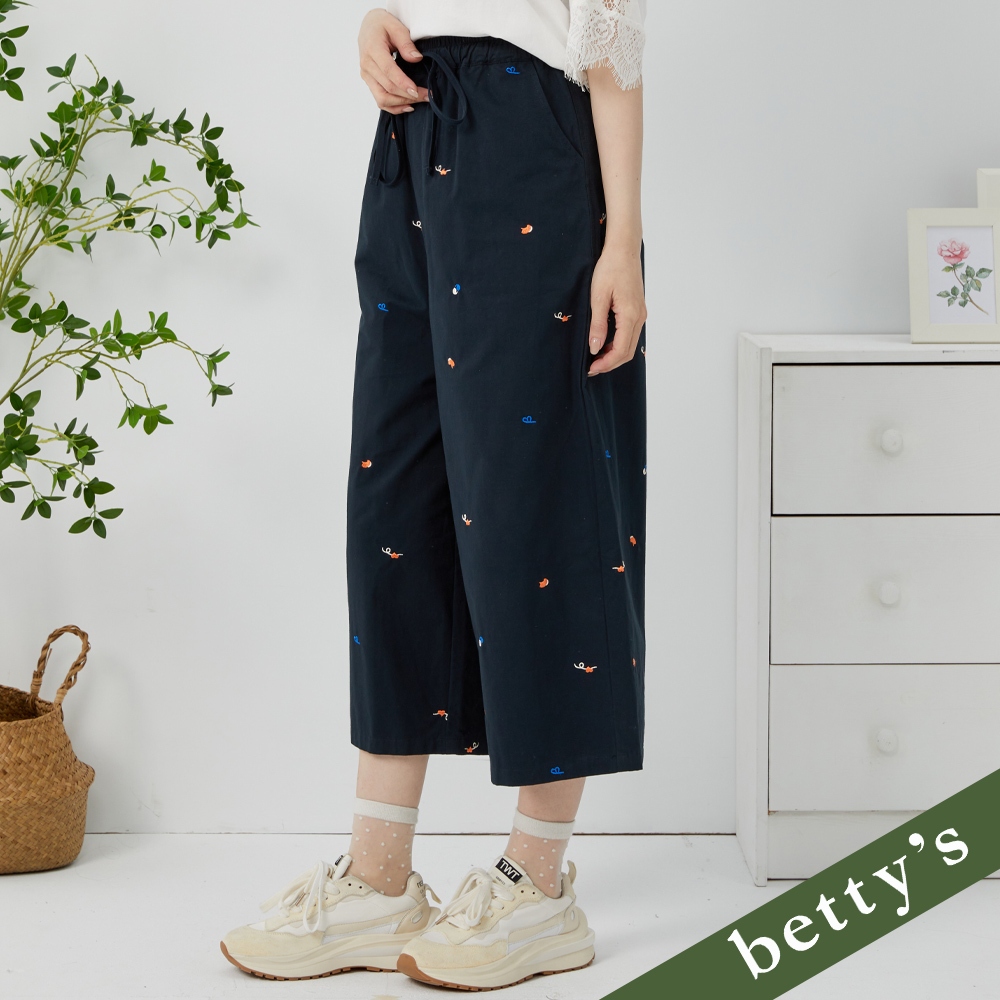 betty’s貝蒂思(35) 腰鬆緊抽繩迷你刺繡休閒寬褲(深藍)