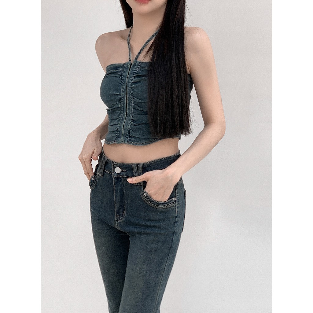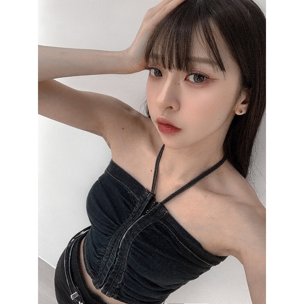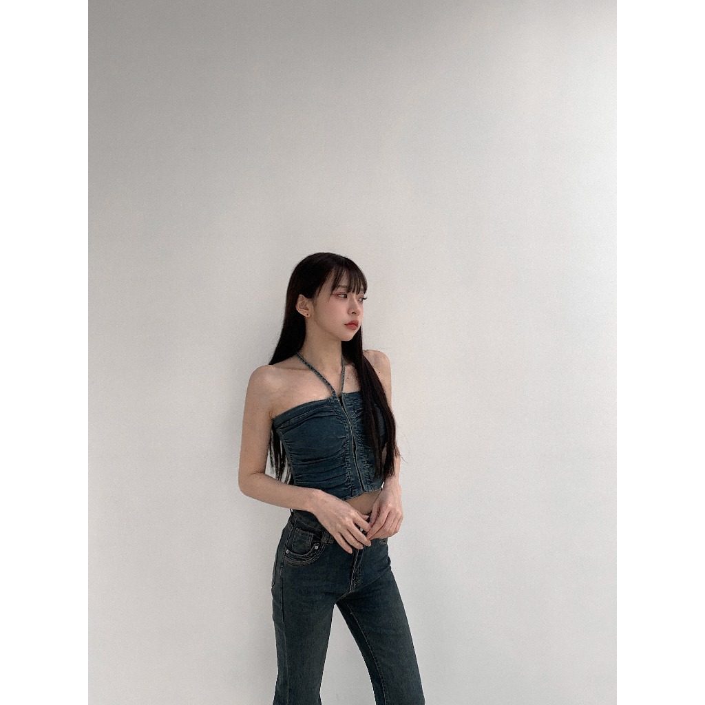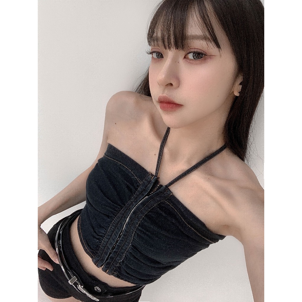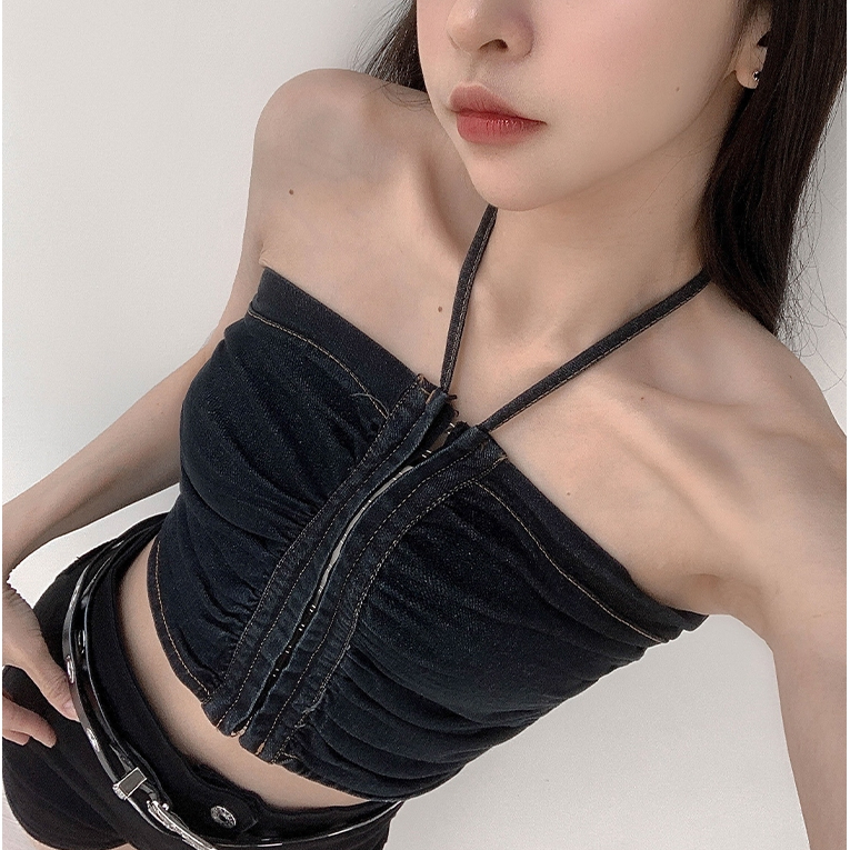 【Aa.chic熱賣商品】酷辣抓皺牛仔掛脖背心(兩色).女裝/牛仔/背心/掛脖/酷辣/夏日/穿搭【C220061】黑(現貨)|藍(預購)Tanks & CamisolesAa Chic