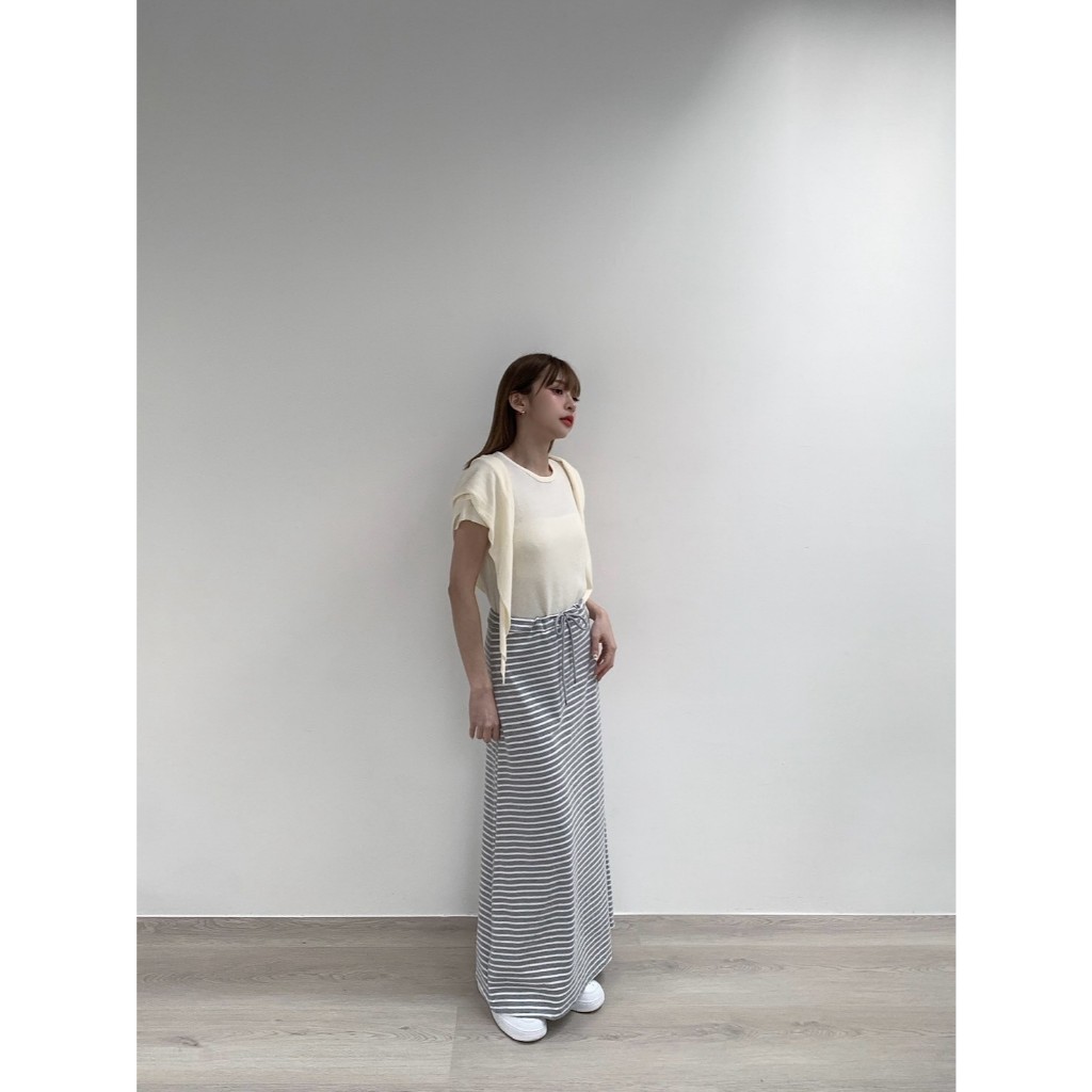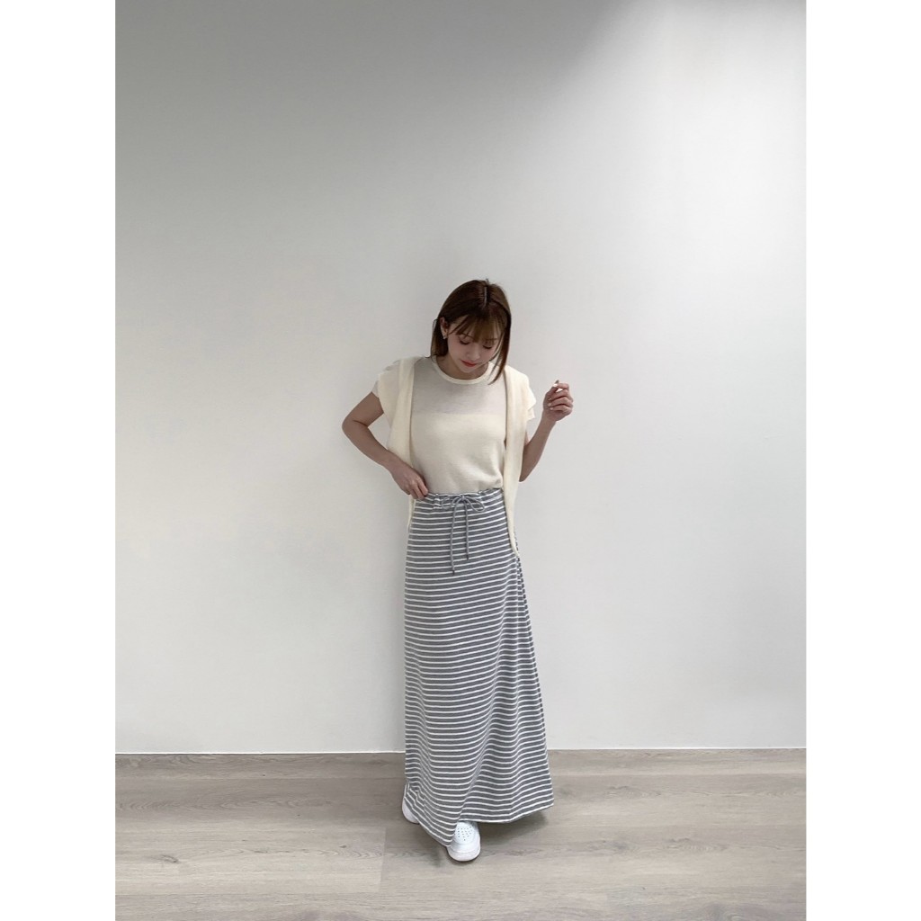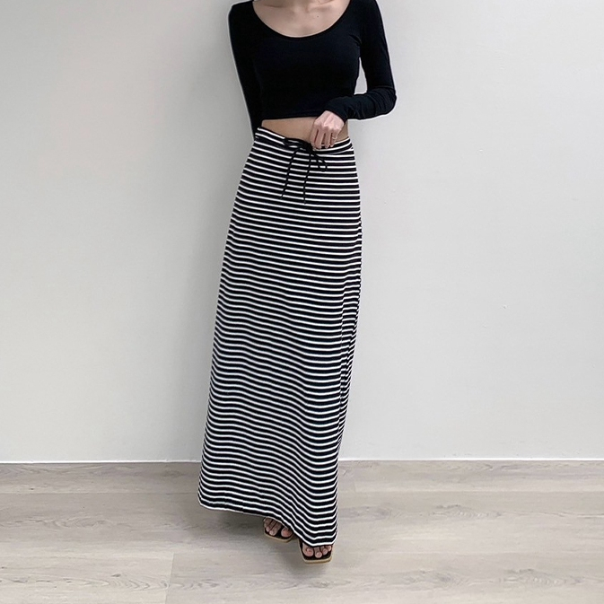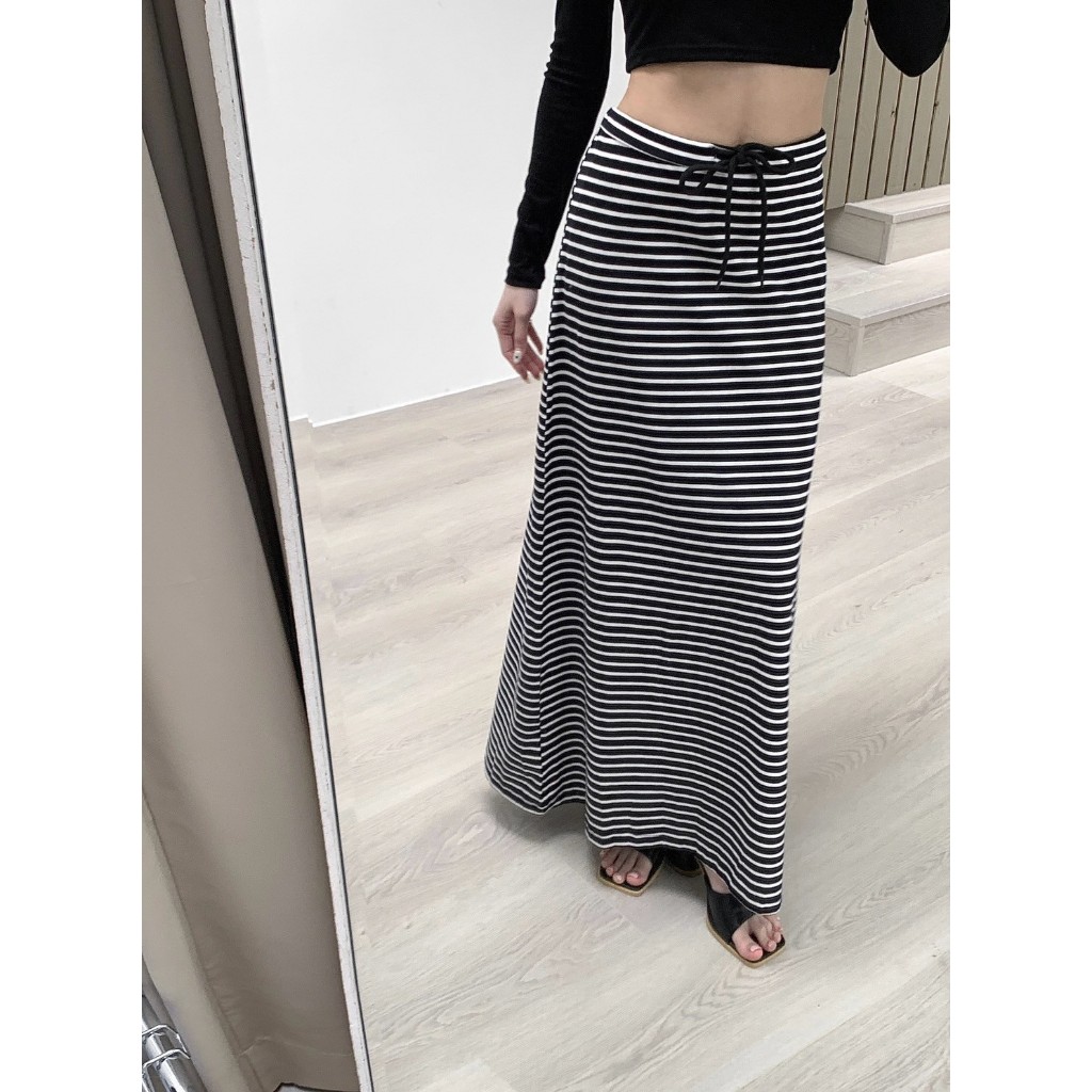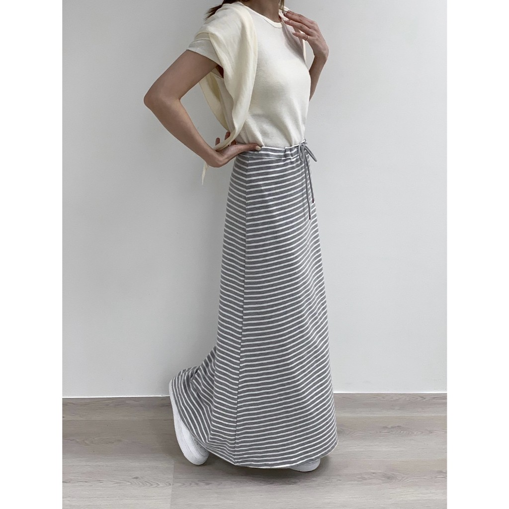 【Aa.chic】日常慵懶抽繩條紋長裙(兩色).女裝/下身/條紋/抽繩/慵懶/長裙/顯瘦/日常【C182331】黑(現貨)|淺灰(現貨)Aa Chic