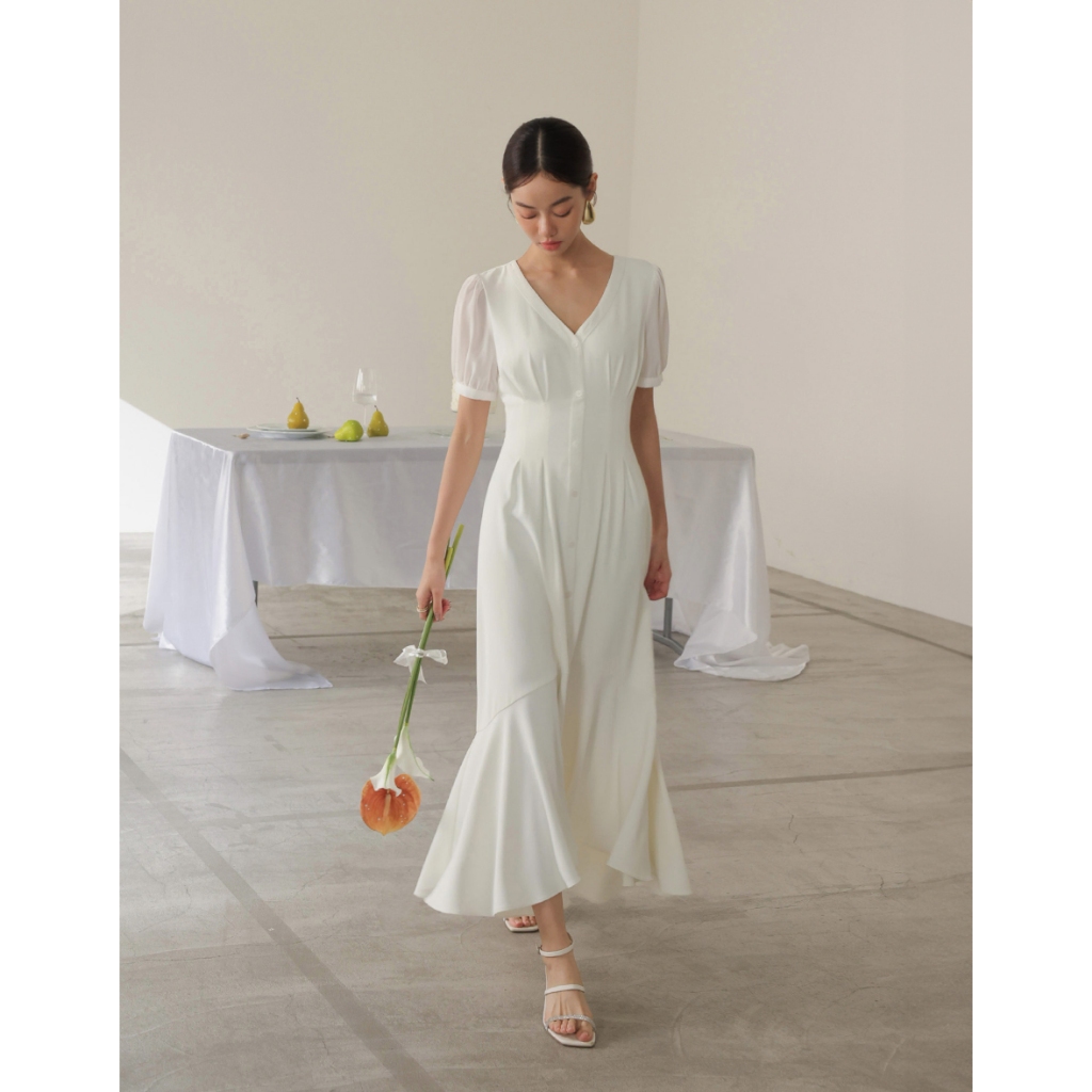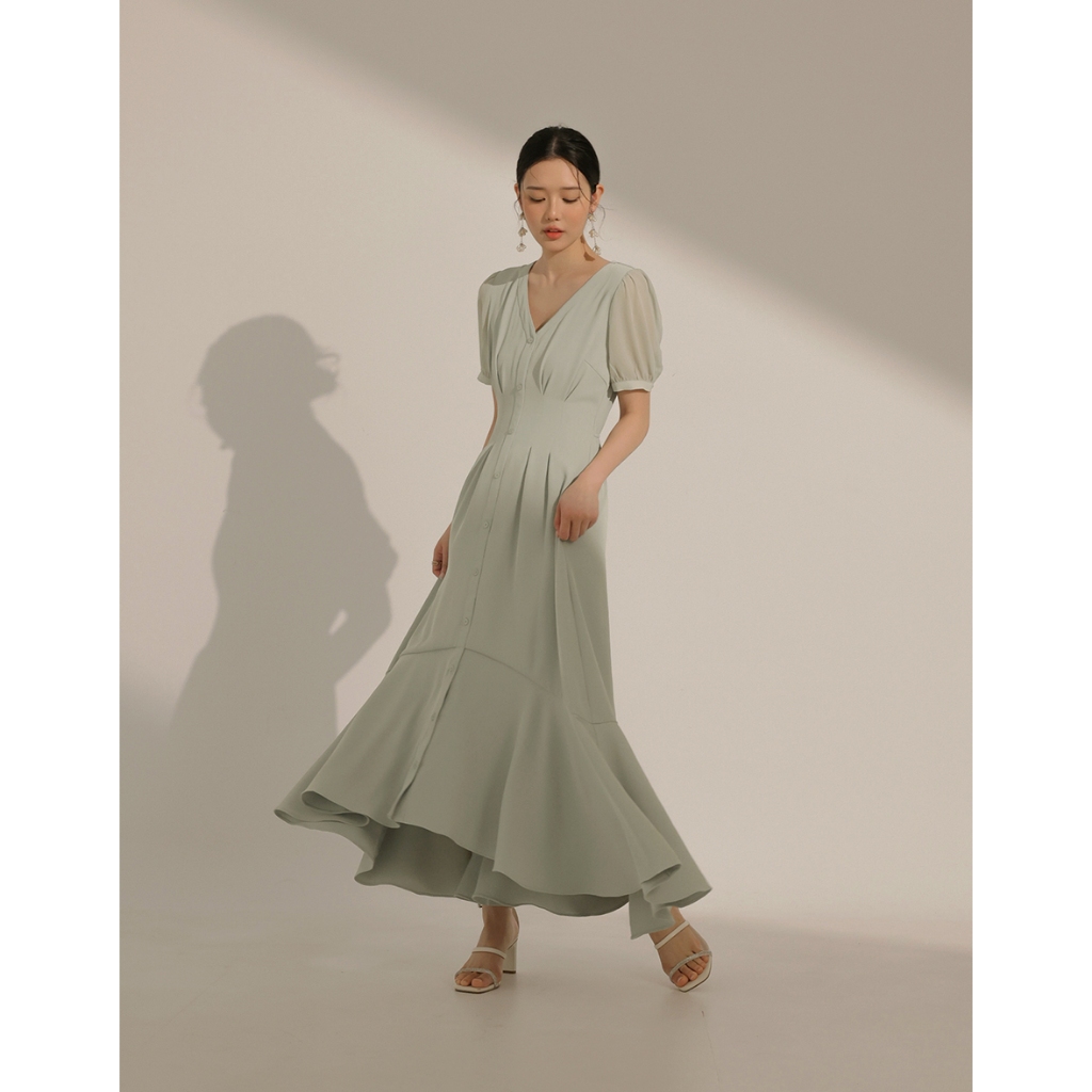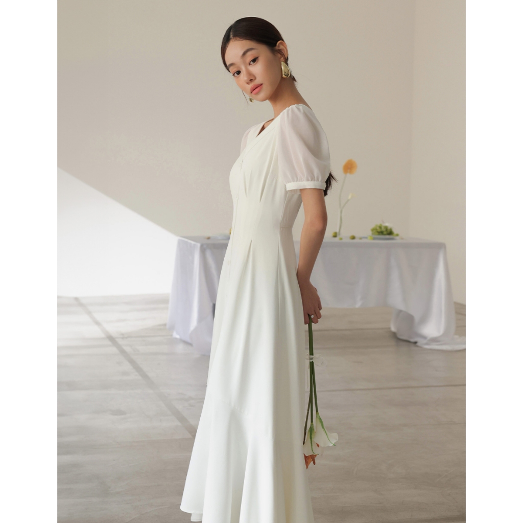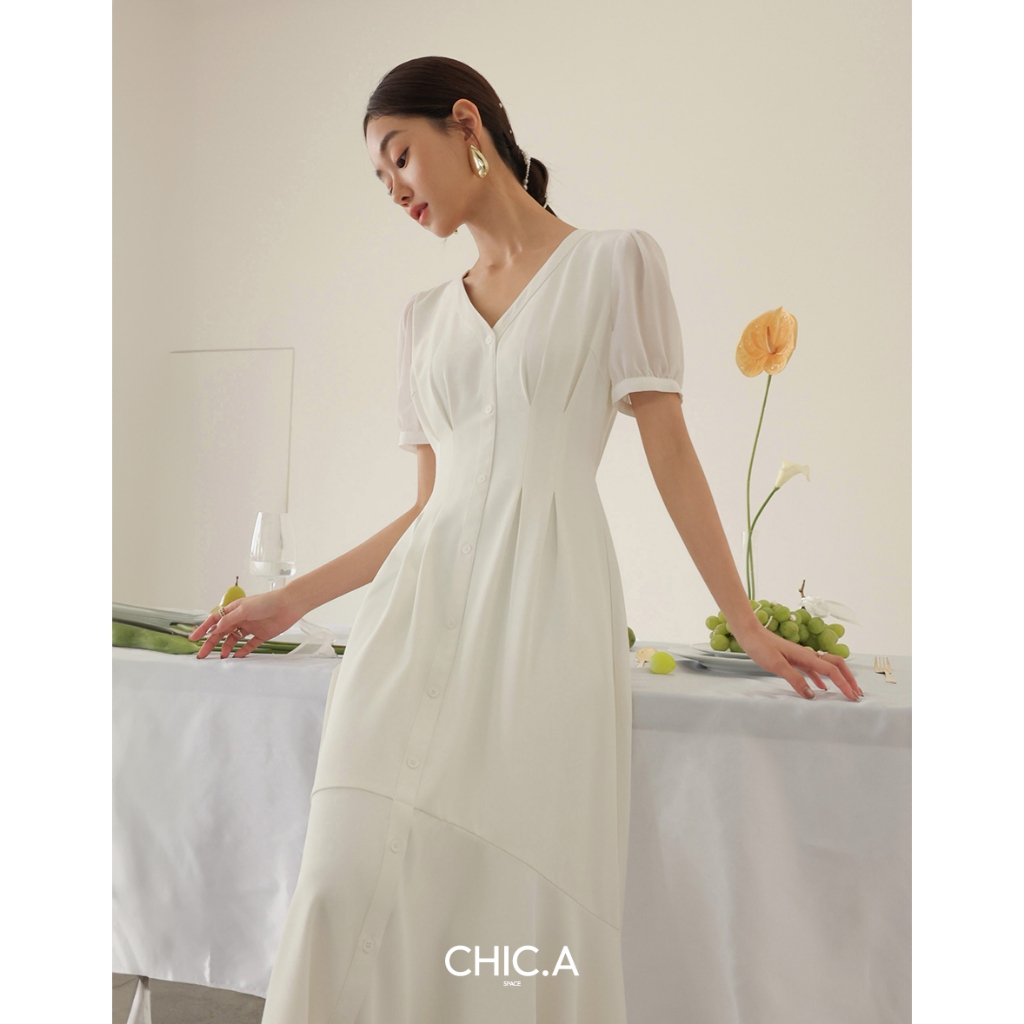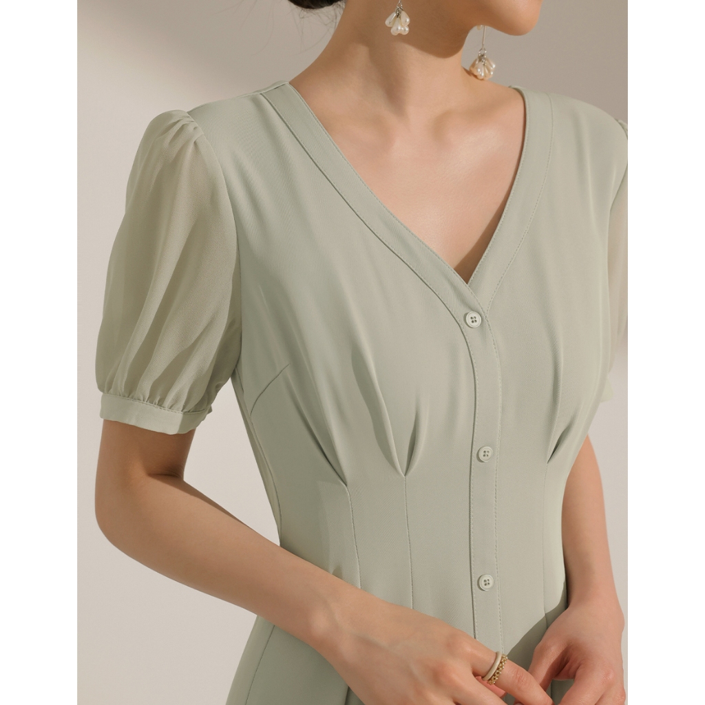 CHIC A SPACE V領排釦傘襬雪紡長洋裝(白/綠) 女裝 現貨綠,L|白,S|白,M|白,L|綠,S|綠,MAIR SPACE
