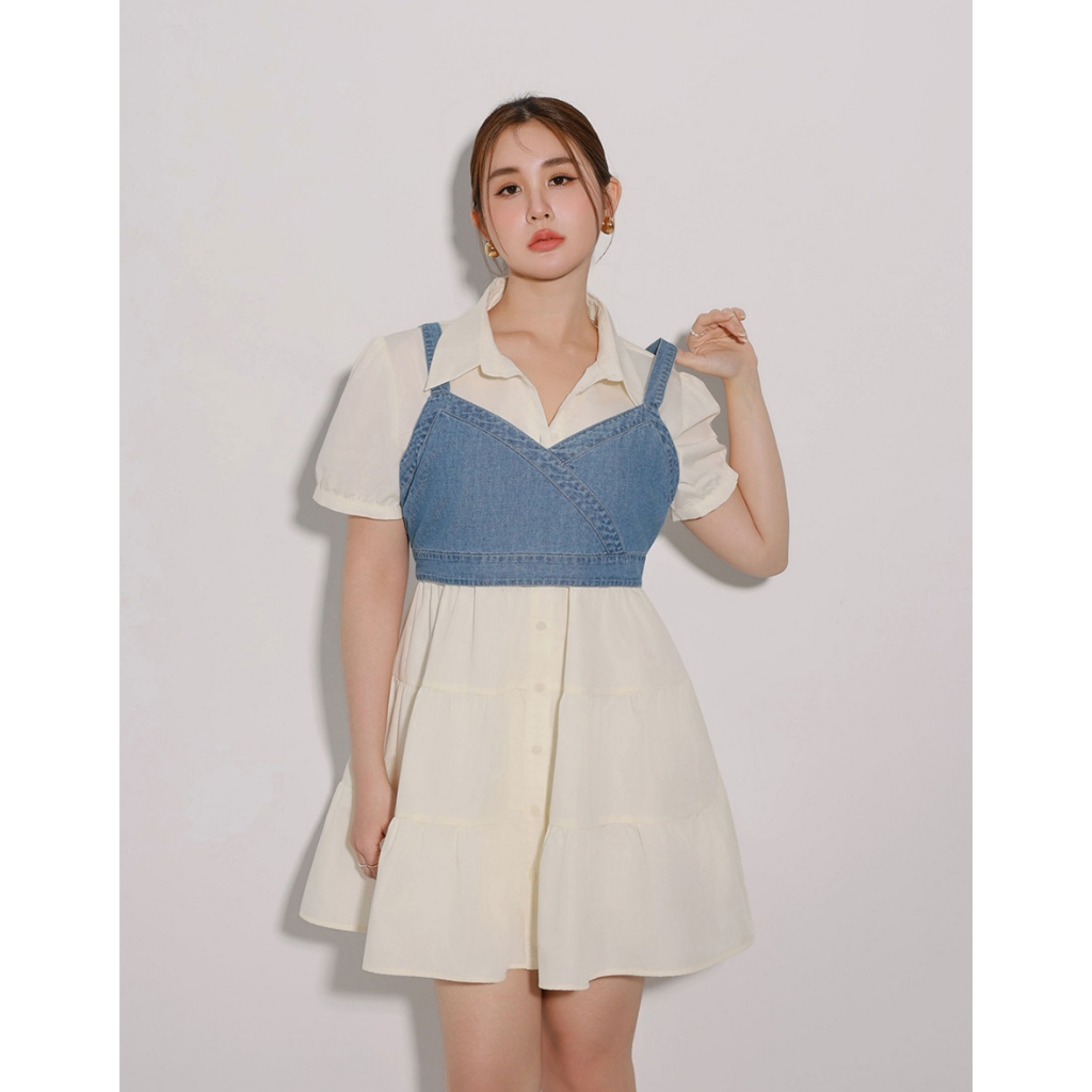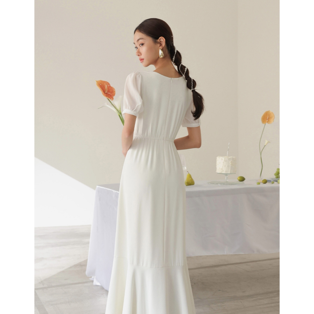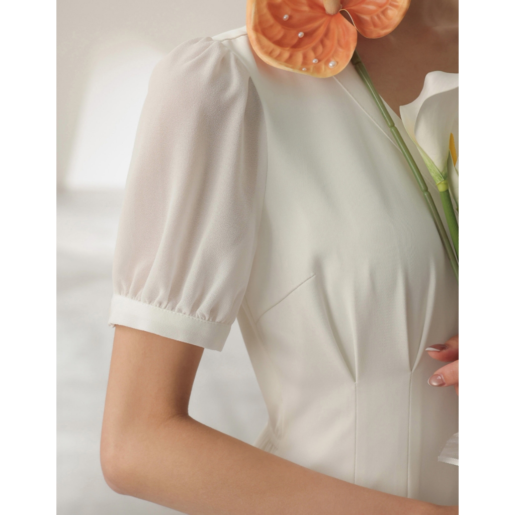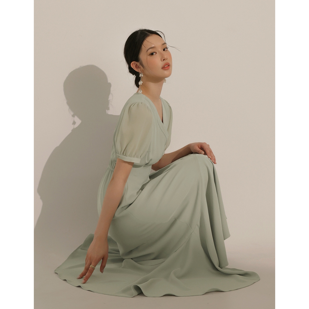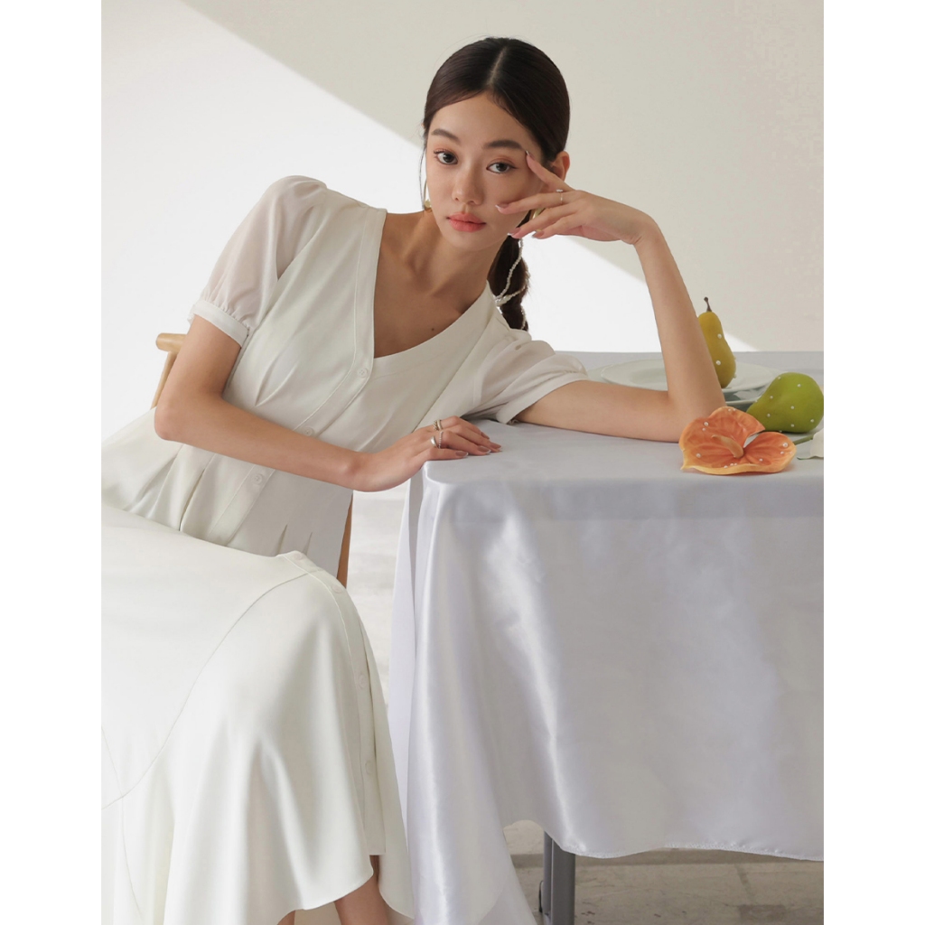CHIC A SPACE V領排釦傘襬雪紡長洋裝(白/綠) 女裝 現貨綠,L|白,S|白,M|白,L|綠,S|綠,MAIR SPACE