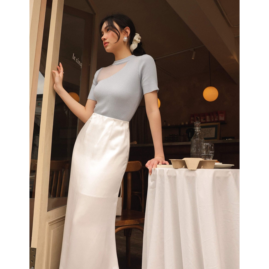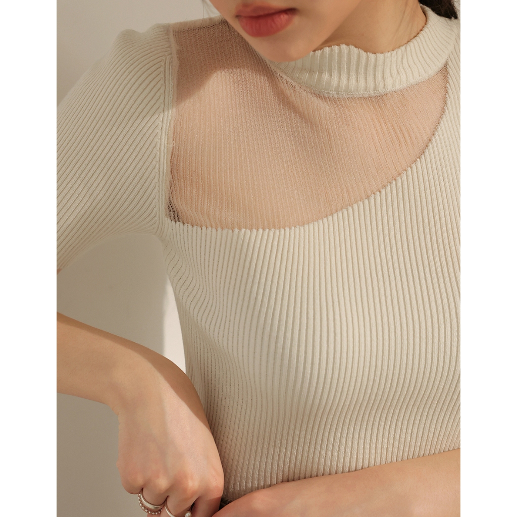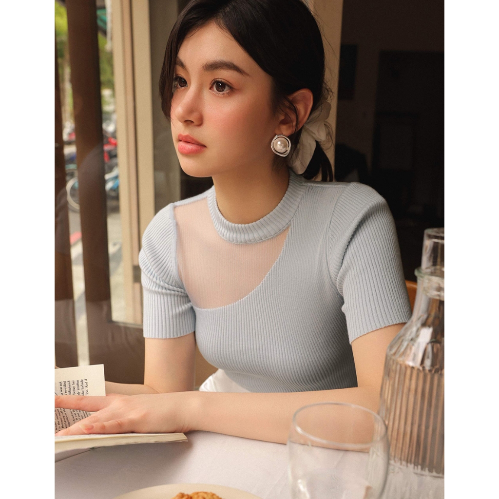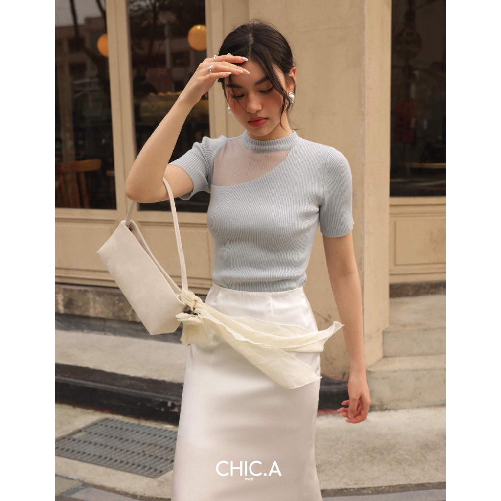 CHIC A SPACE 透膚拼接設計感針織上衣(藍/米白) 女裝 現貨
