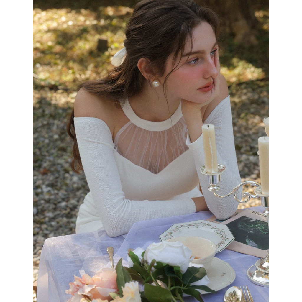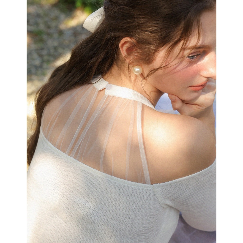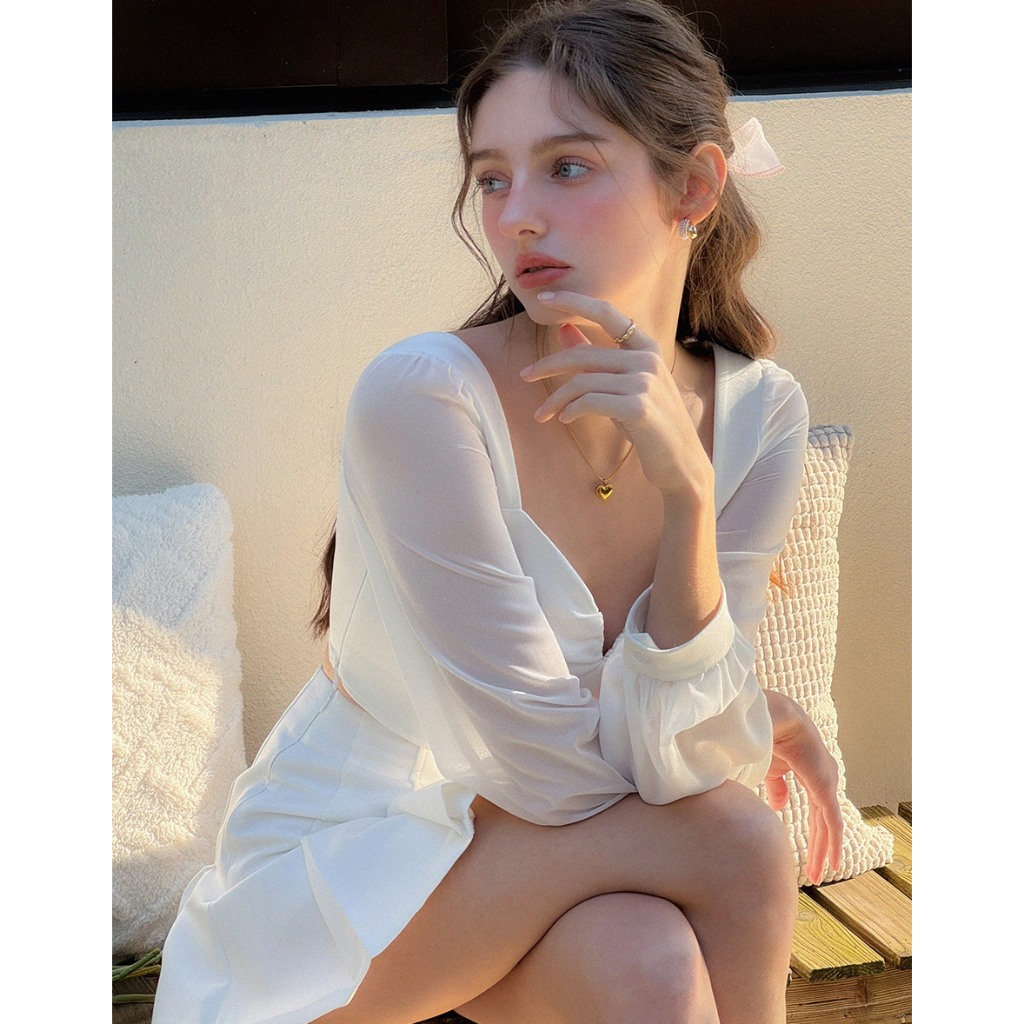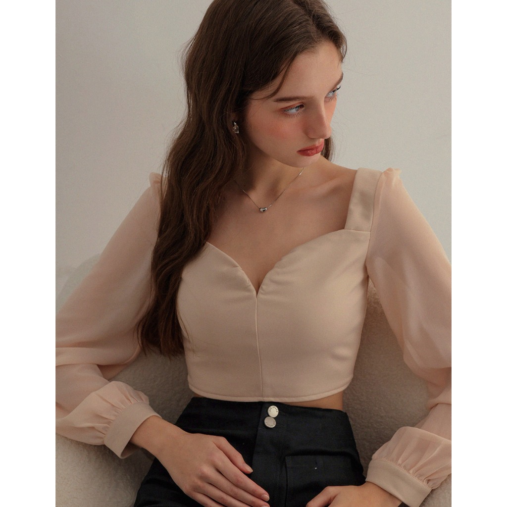 AIR SPACE 桃心領透膚拼接上衣(白/杏) 女裝 現貨白,S|白,M|白,L|杏,S|杏,M|杏,LOthersAIR SPACE