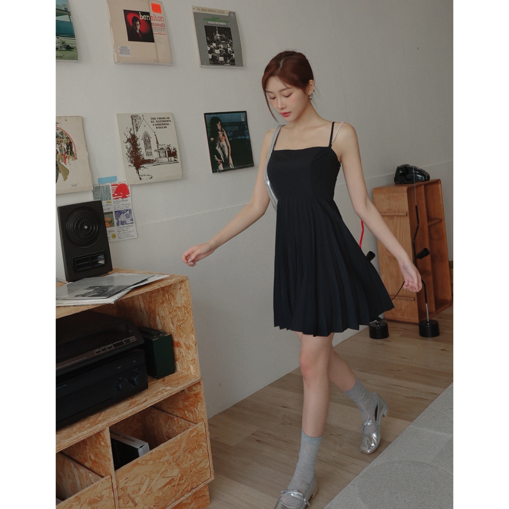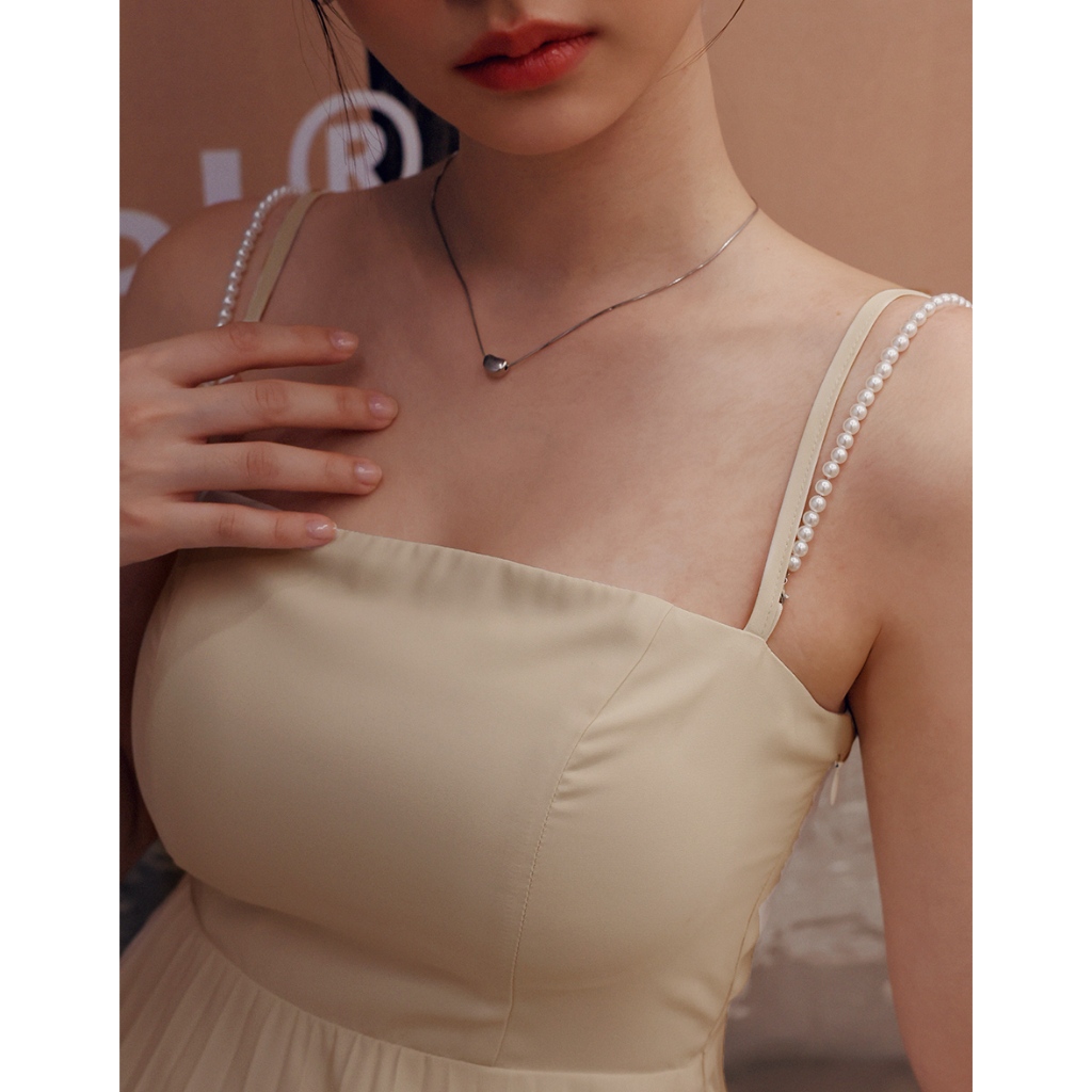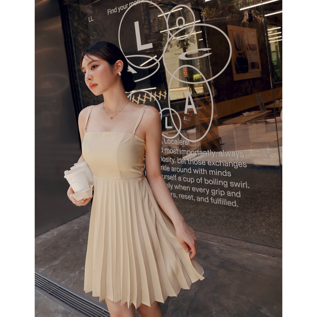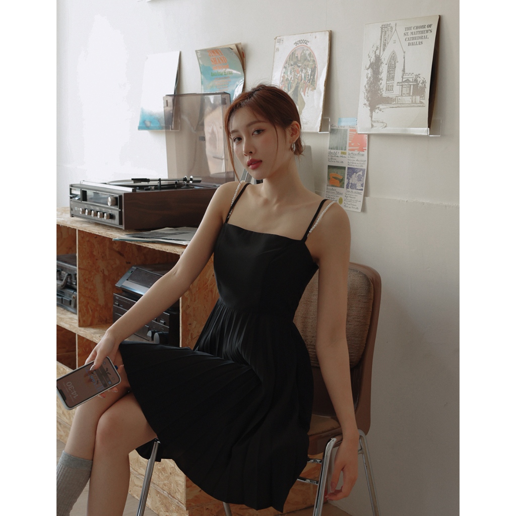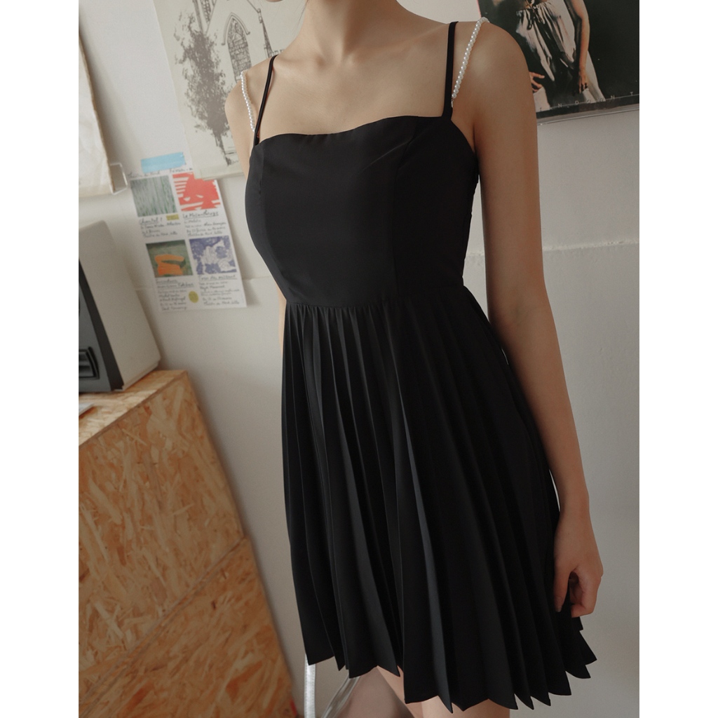 AIR SPACE LADY 珍珠綴飾細肩百褶短洋裝(附胸墊) (黑/淺杏) 女裝 現貨黑,S|黑,M|黑,L|淺杏,S|淺杏,M|淺杏,LAIR SPACE