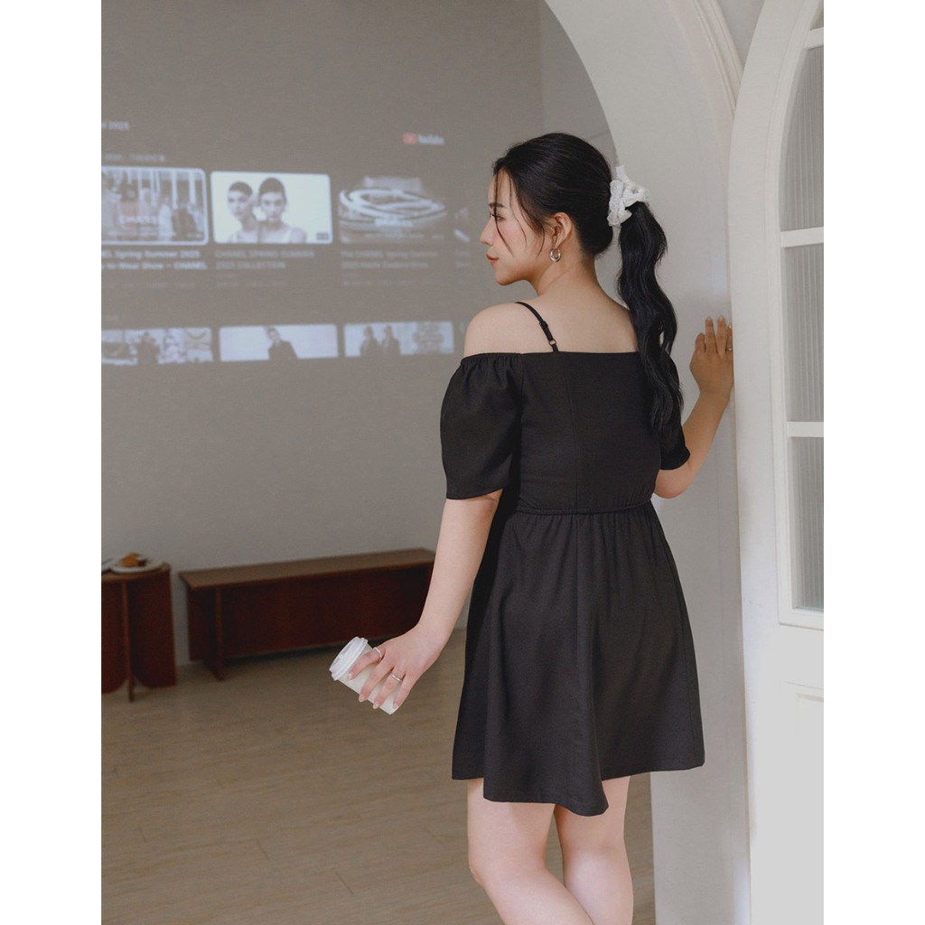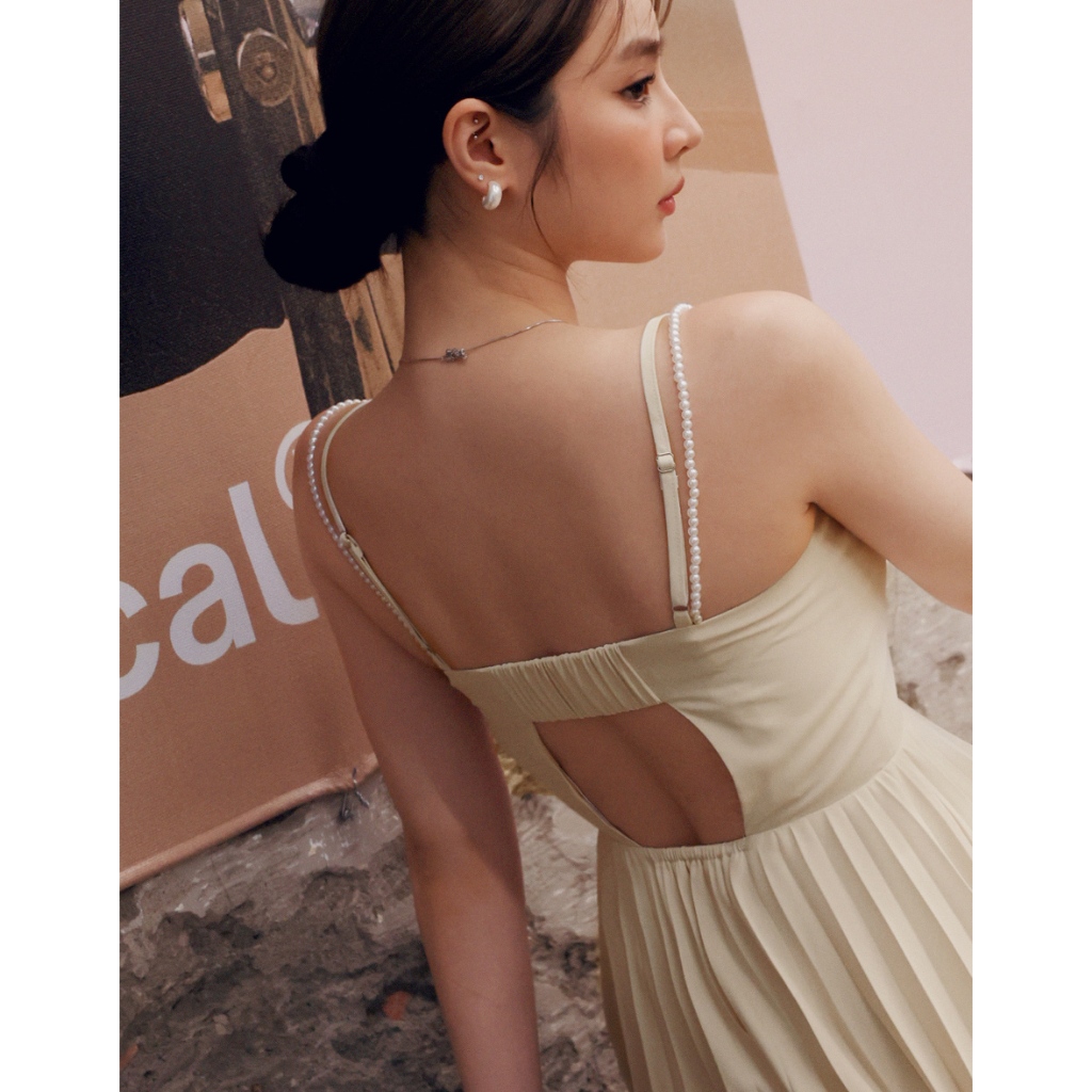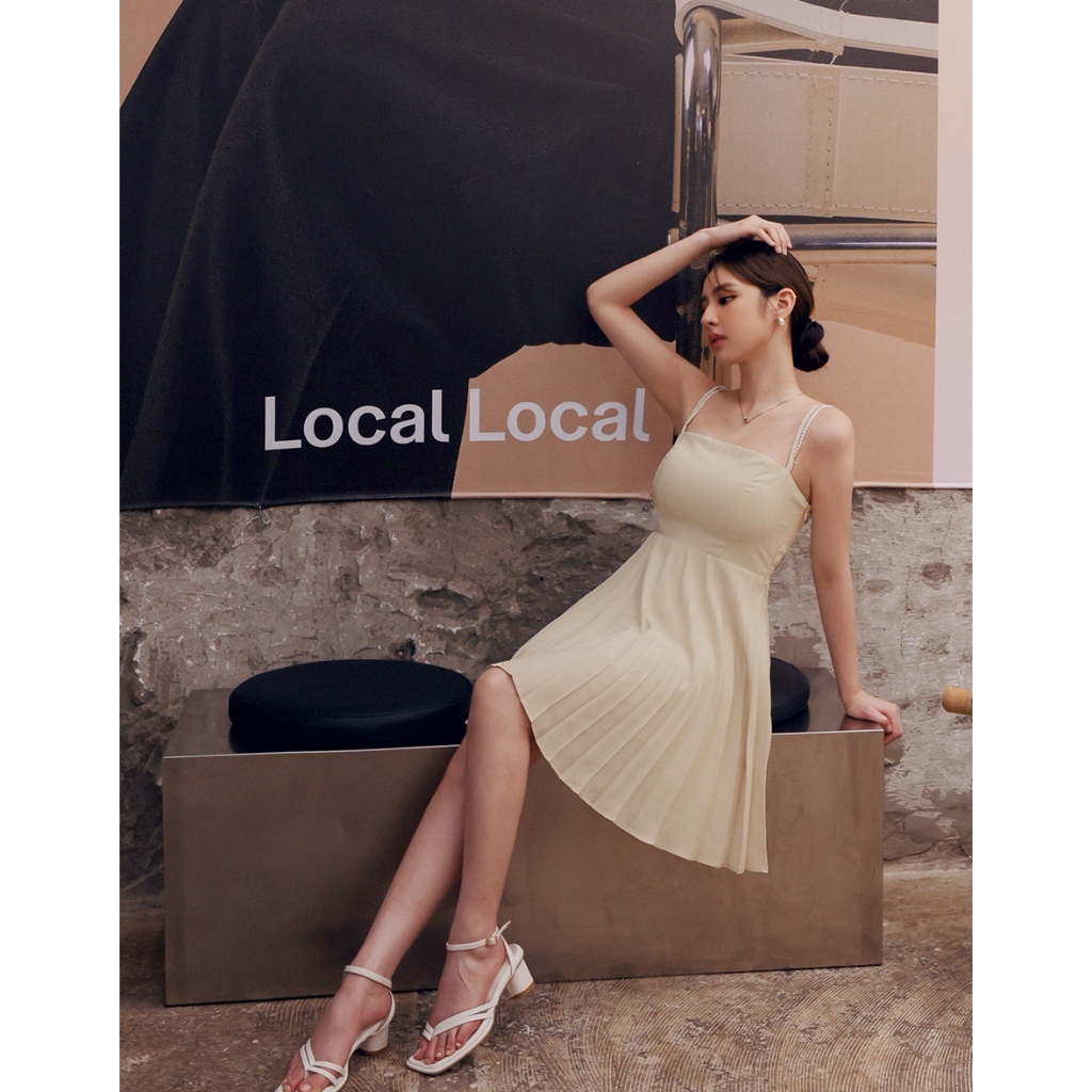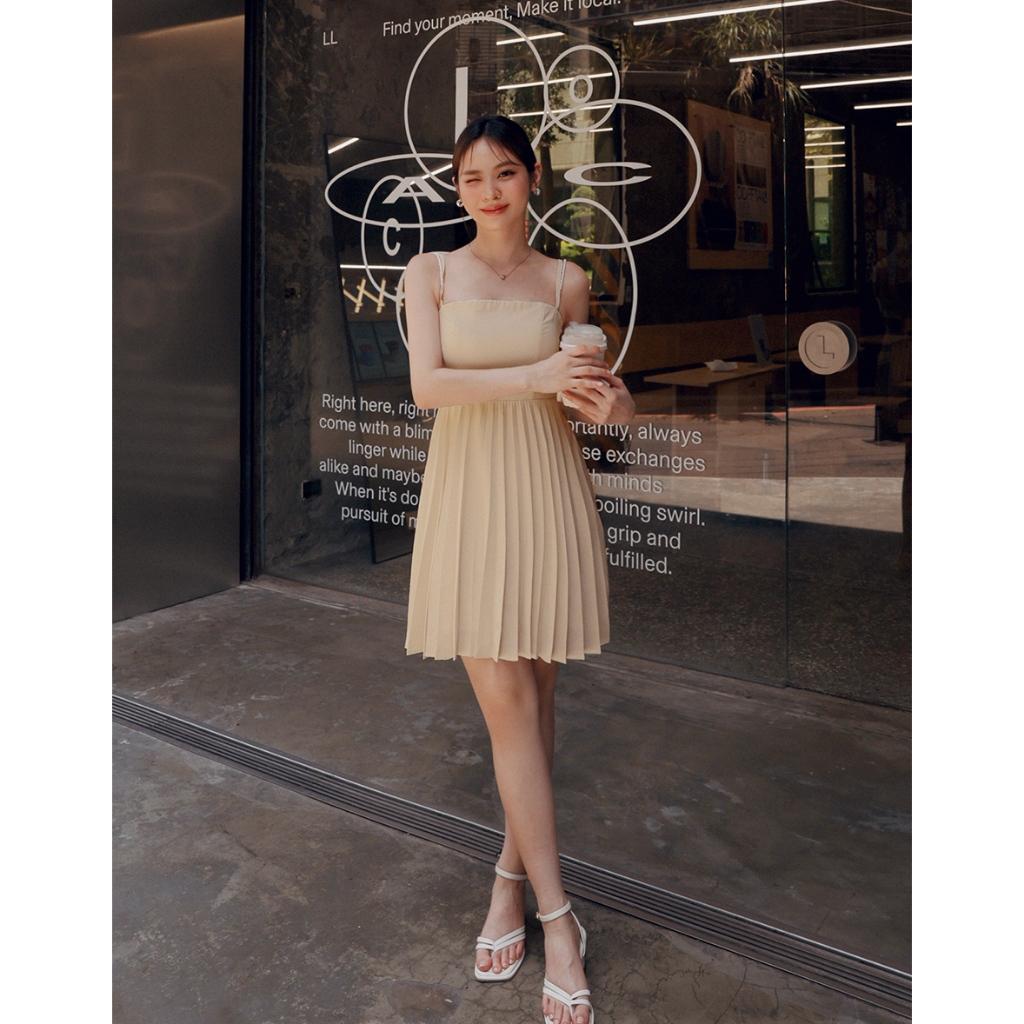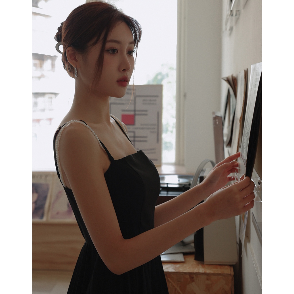 AIR SPACE LADY 珍珠綴飾細肩百褶短洋裝(附胸墊) (黑/淺杏) 女裝 現貨黑,S|黑,M|黑,L|淺杏,S|淺杏,M|淺杏,LAIR SPACE
