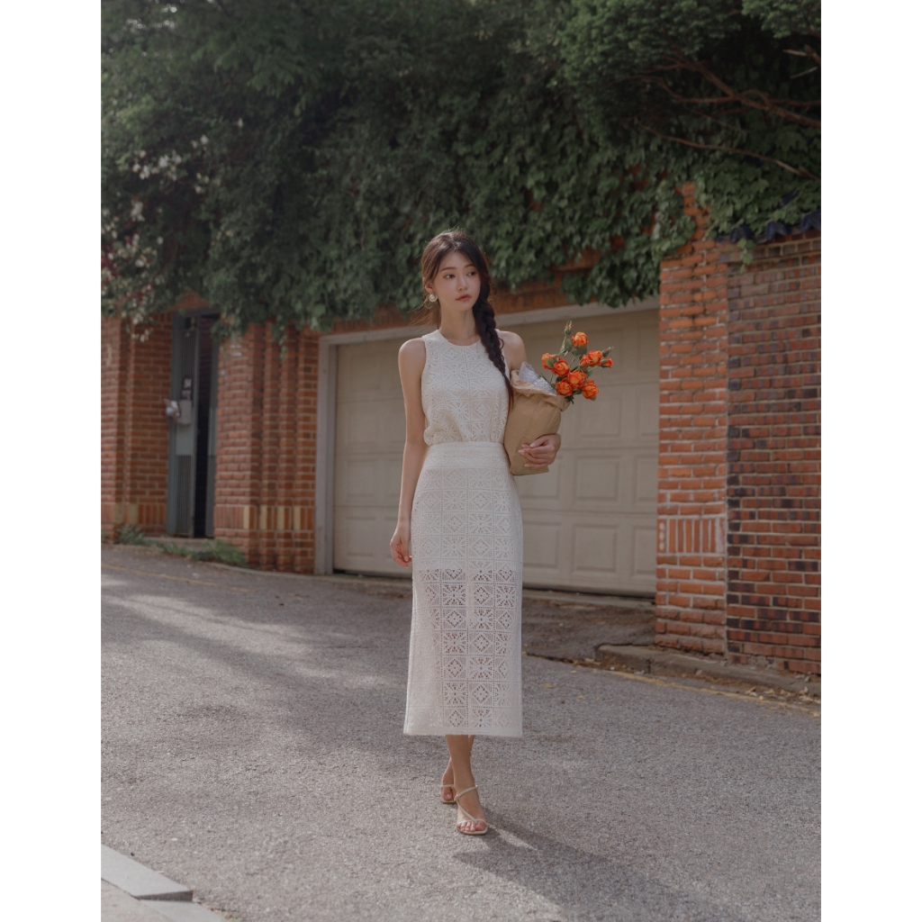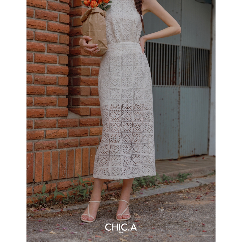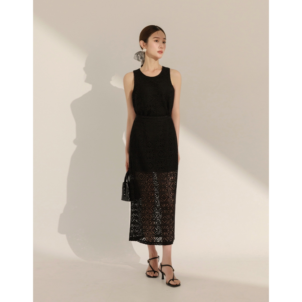 CHIC A SPACE 幾何鏤空蕾絲修身長裙(黑/杏) 女裝 現貨黑,S|黑,M|黑,L|杏,S|杏,M|杏,LAIR SPACE