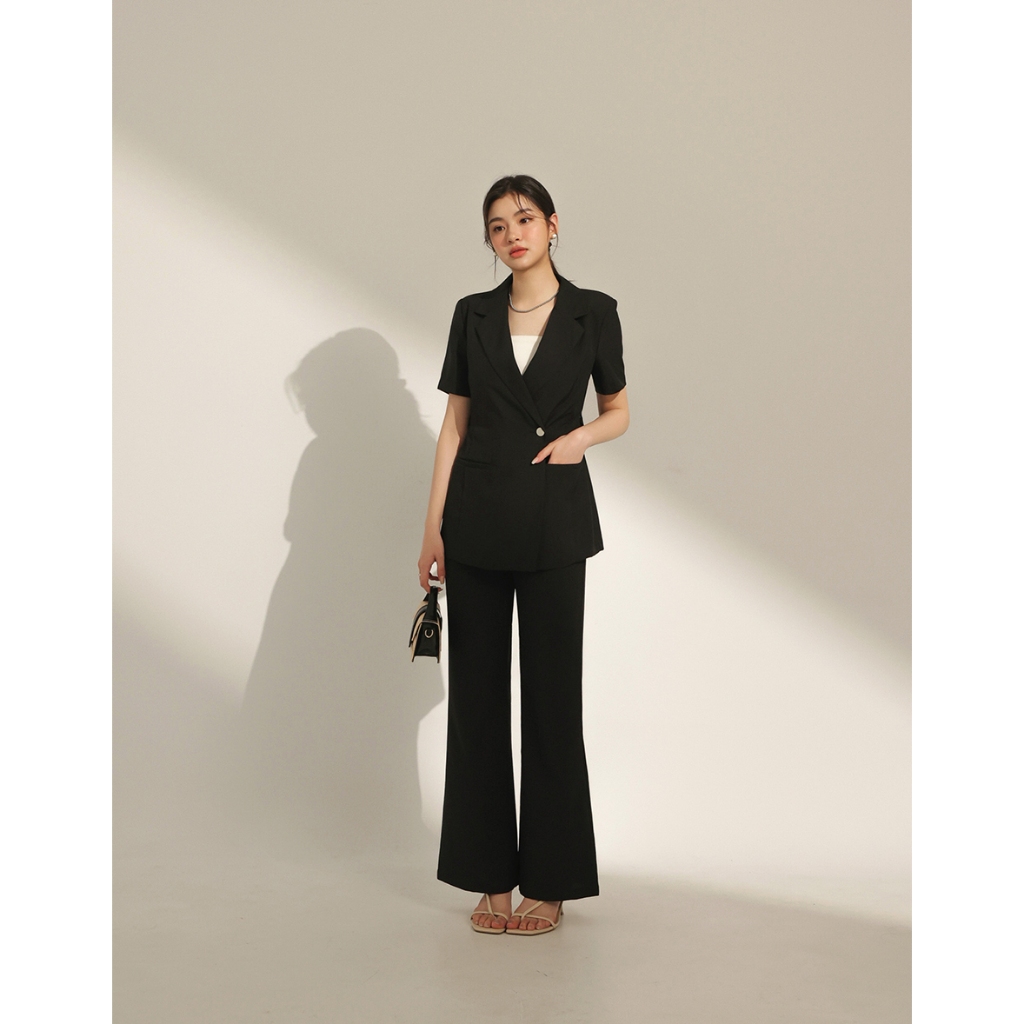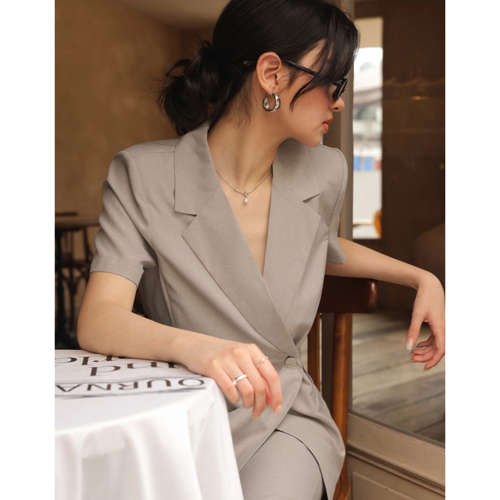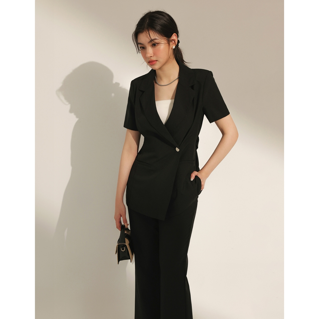 CHIC A SPACE 側釦綁帶短袖西裝外套(附墊肩)(黑/卡其) 女裝 現貨黑,S|黑,M|黑,L|卡其,S|卡其,M|卡其,LBlazersAIR SPACE