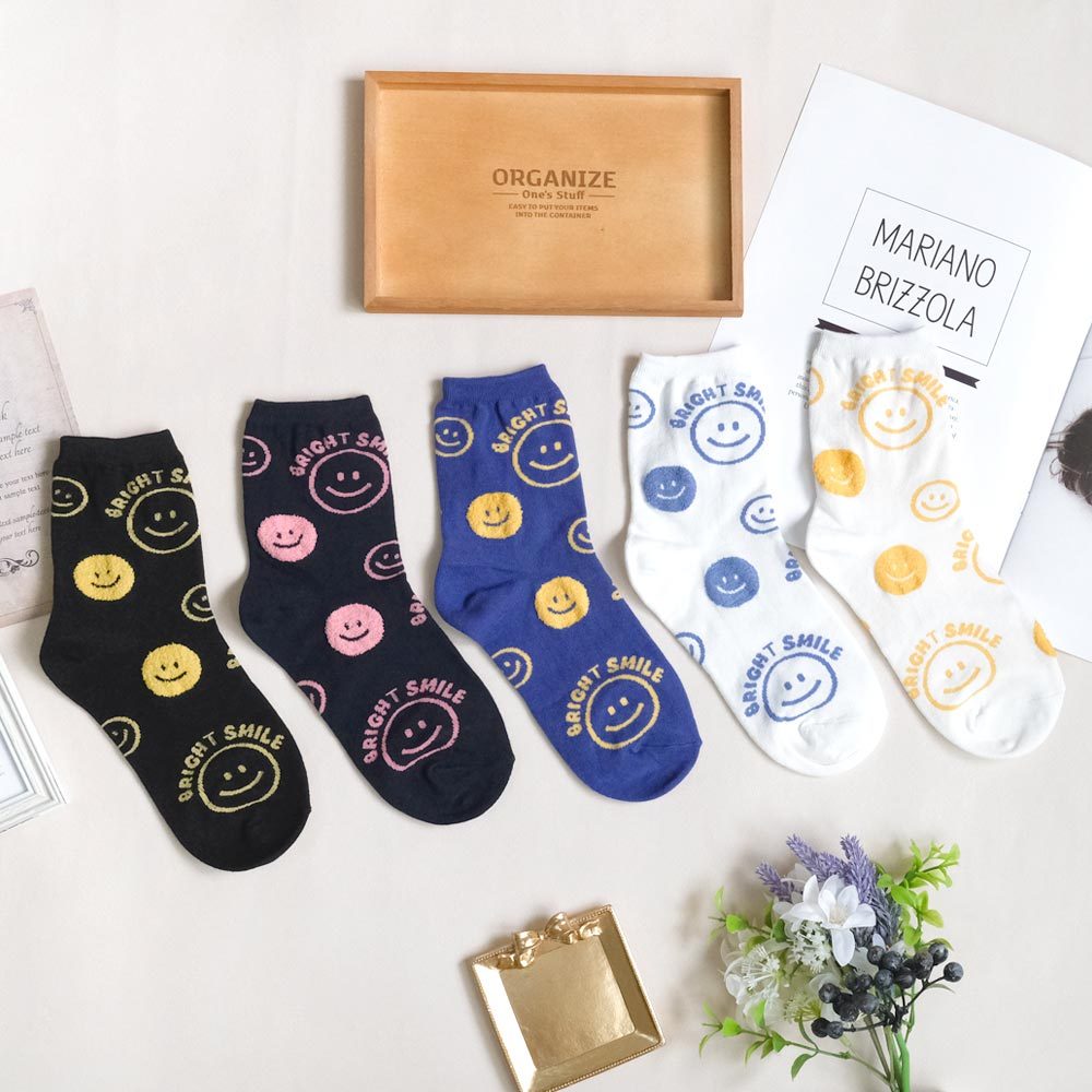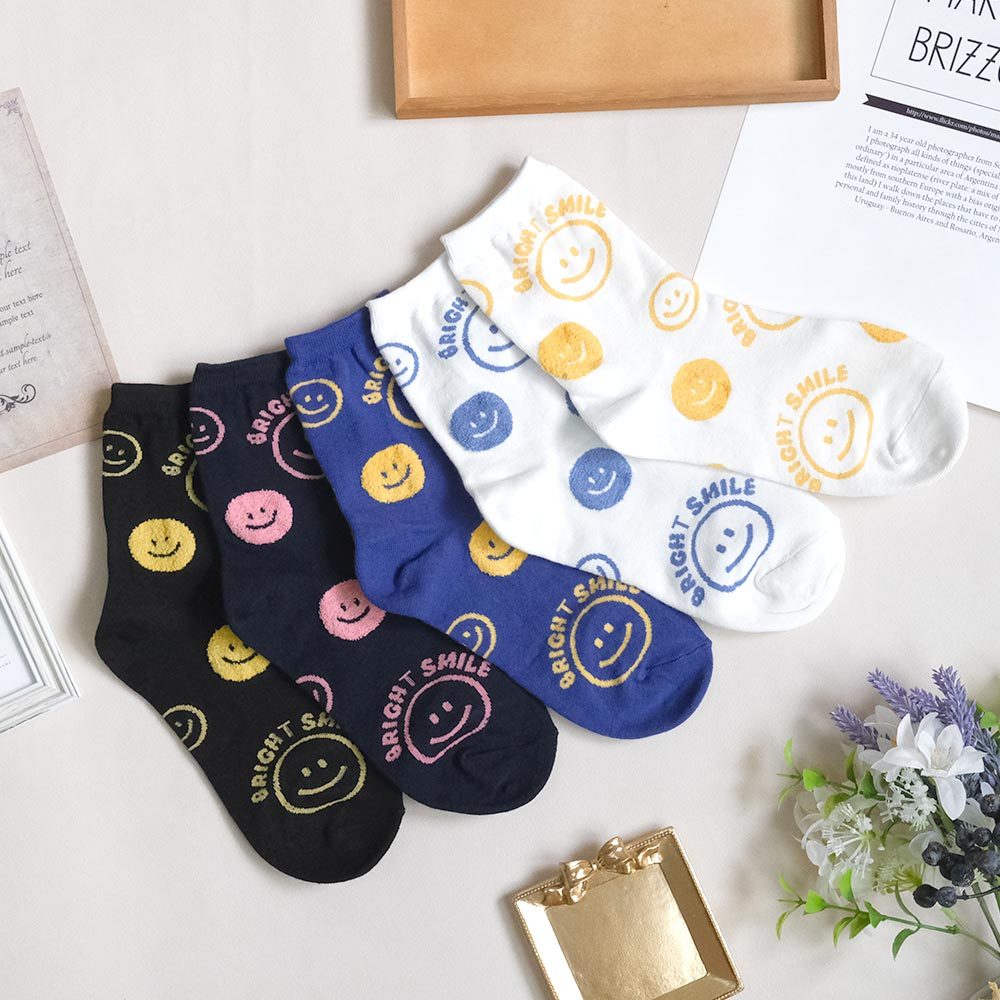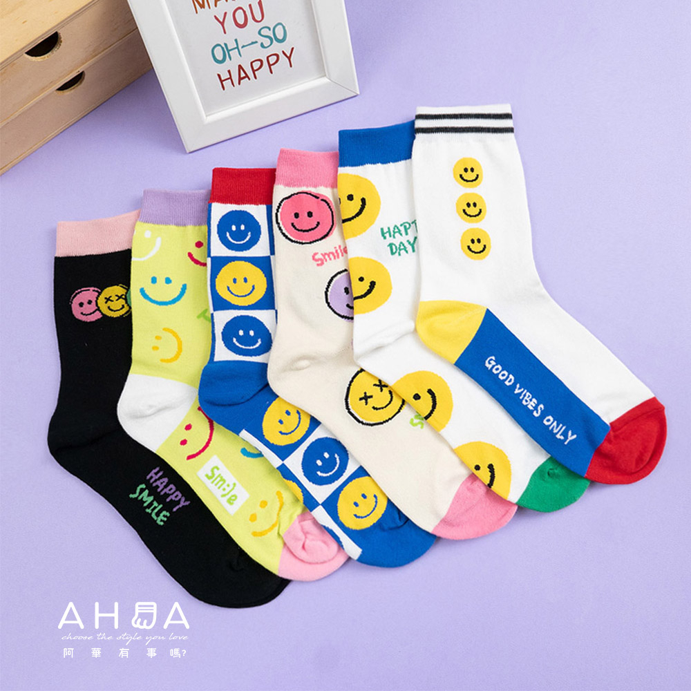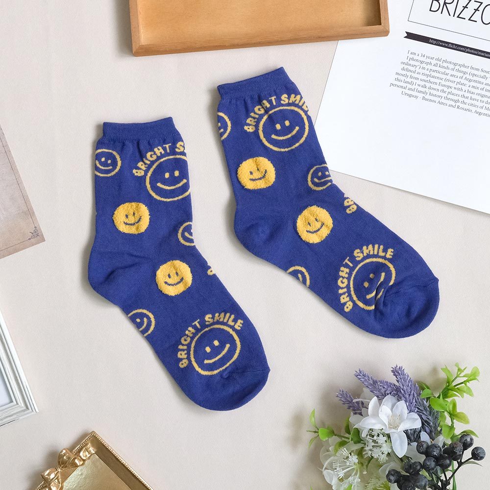 AHUA阿華有事嗎 BRIGHT SMILE滿版笑臉毛毛中筒襪 K2139 正韓襪子 百搭純棉襪 韓妞必備 少女襪白底黃笑臉|白底藍笑臉|藍紫底黃笑臉|深藍底粉笑臉|黑底黃笑臉SocksAHUA 韓國襪子品牌旗艦店