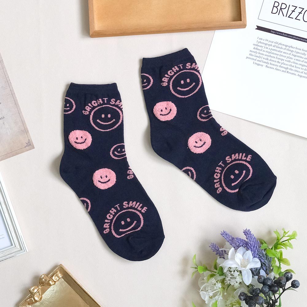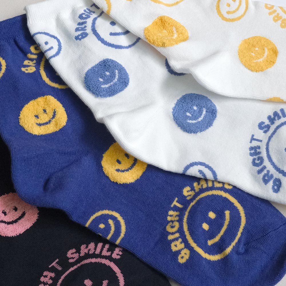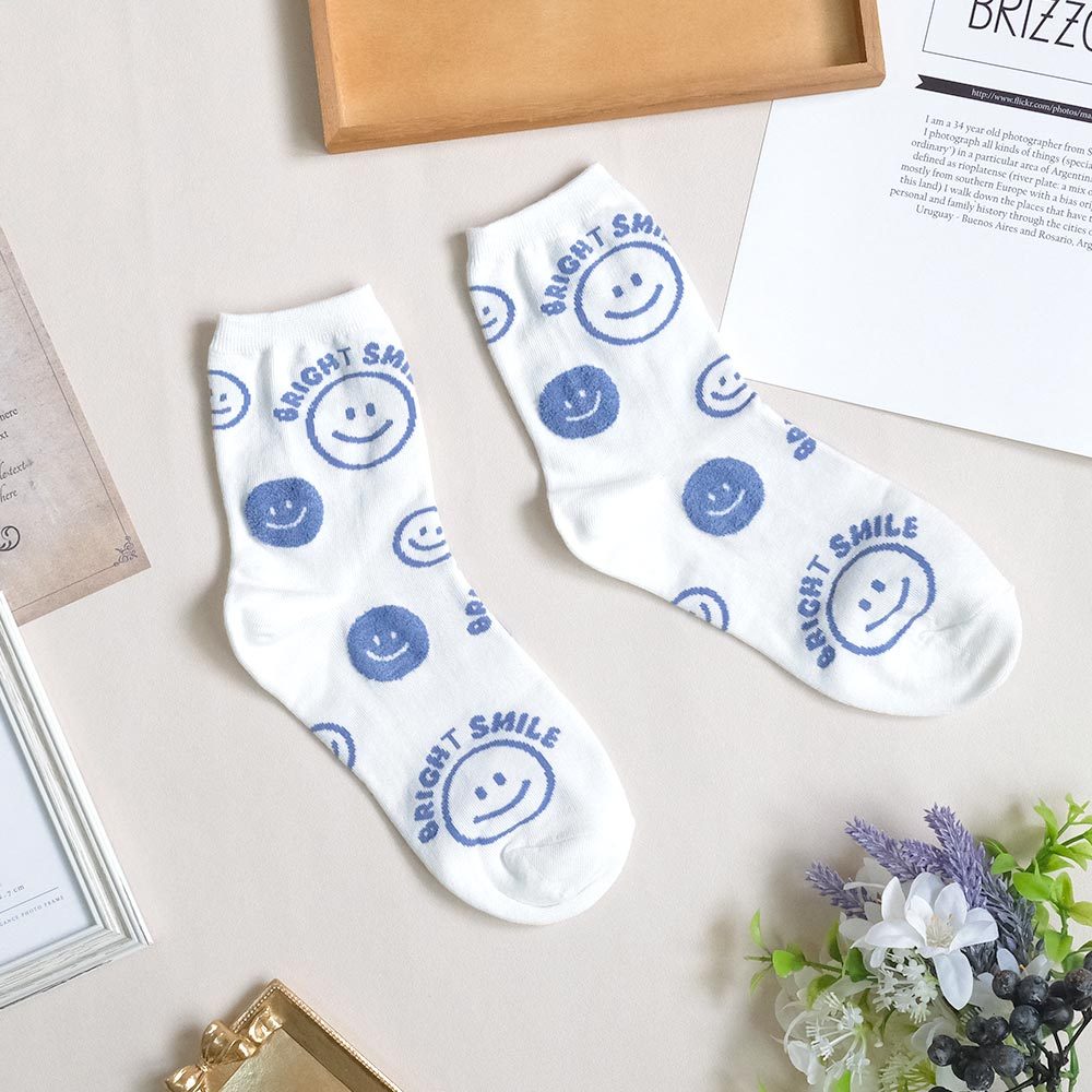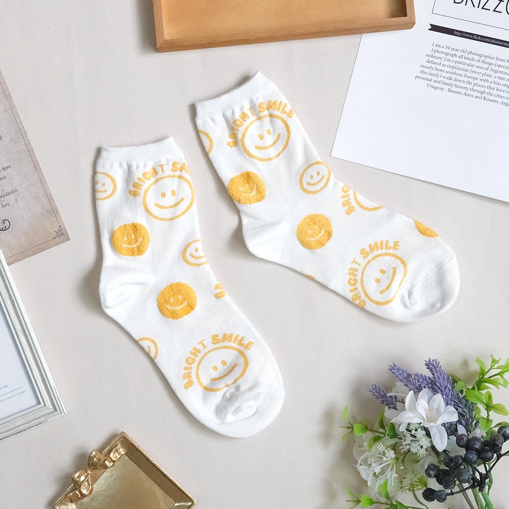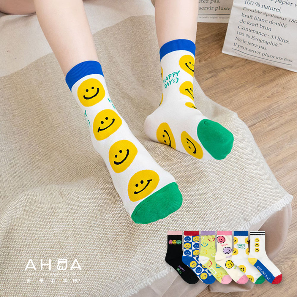 AHUA阿華有事嗎 BRIGHT SMILE滿版笑臉毛毛中筒襪 K2139 正韓襪子 百搭純棉襪 韓妞必備 少女襪白底黃笑臉|白底藍笑臉|藍紫底黃笑臉|深藍底粉笑臉|黑底黃笑臉SocksAHUA 韓國襪子品牌旗艦店