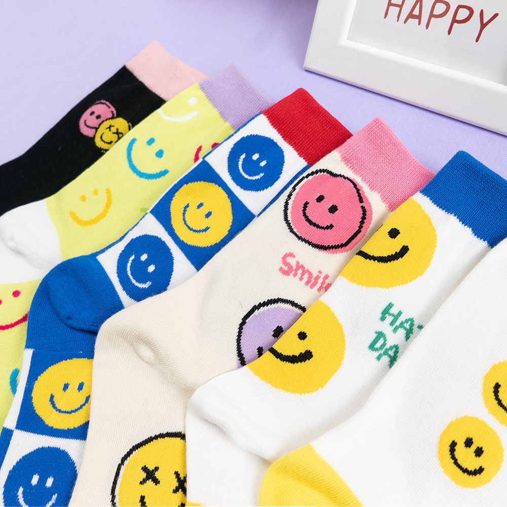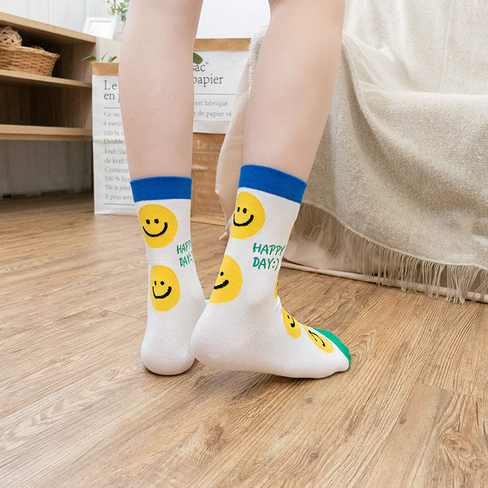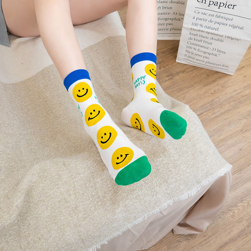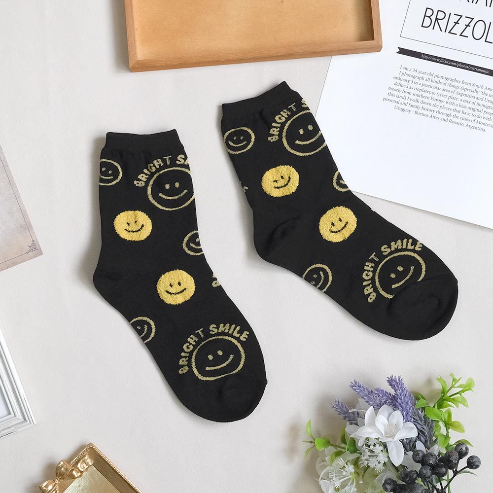 AHUA阿華有事嗎 BRIGHT SMILE滿版笑臉毛毛中筒襪 K2139 正韓襪子 百搭純棉襪 韓妞必備 少女襪白底黃笑臉|白底藍笑臉|藍紫底黃笑臉|深藍底粉笑臉|黑底黃笑臉SocksAHUA 韓國襪子品牌旗艦店