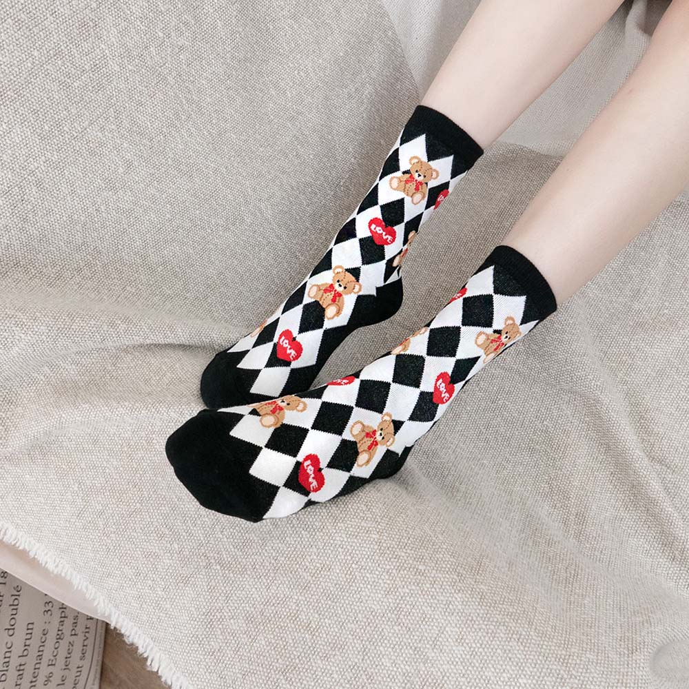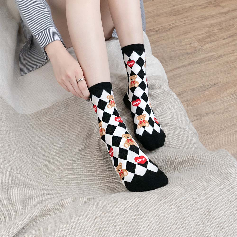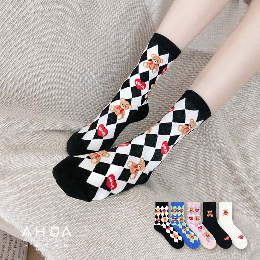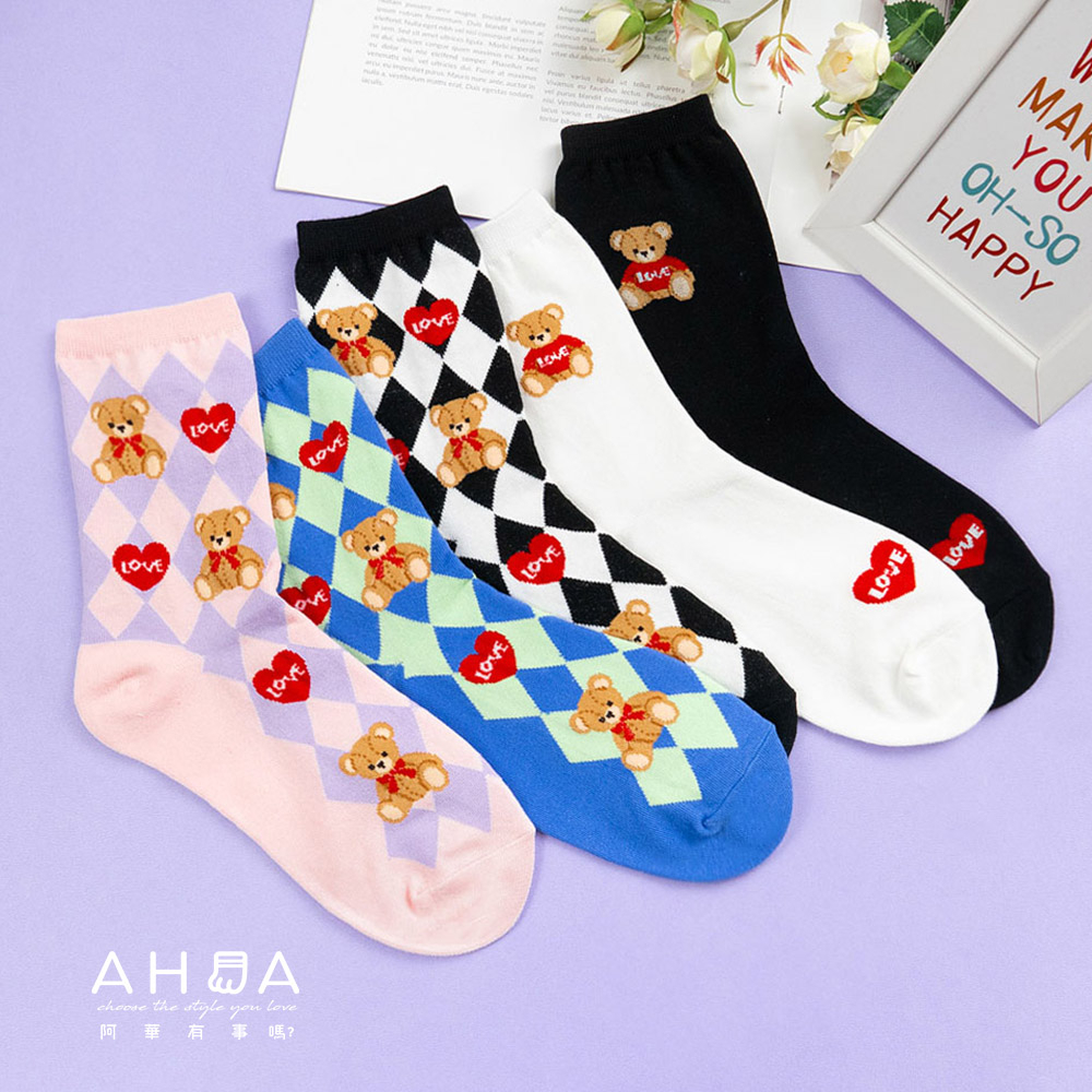 AHUA阿華有事嗎 韓國襪子 LOVE泰迪熊中筒襪 K1659 襪子推薦 流行襪首選 長襪 可愛 日系襪子粉底紫格|藍底綠格|黑底白格|白底|黑底SocksAHUA 韓國襪子品牌旗艦店