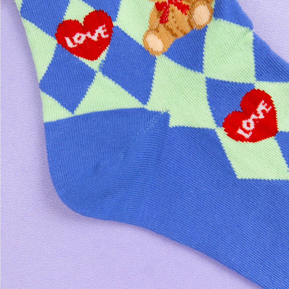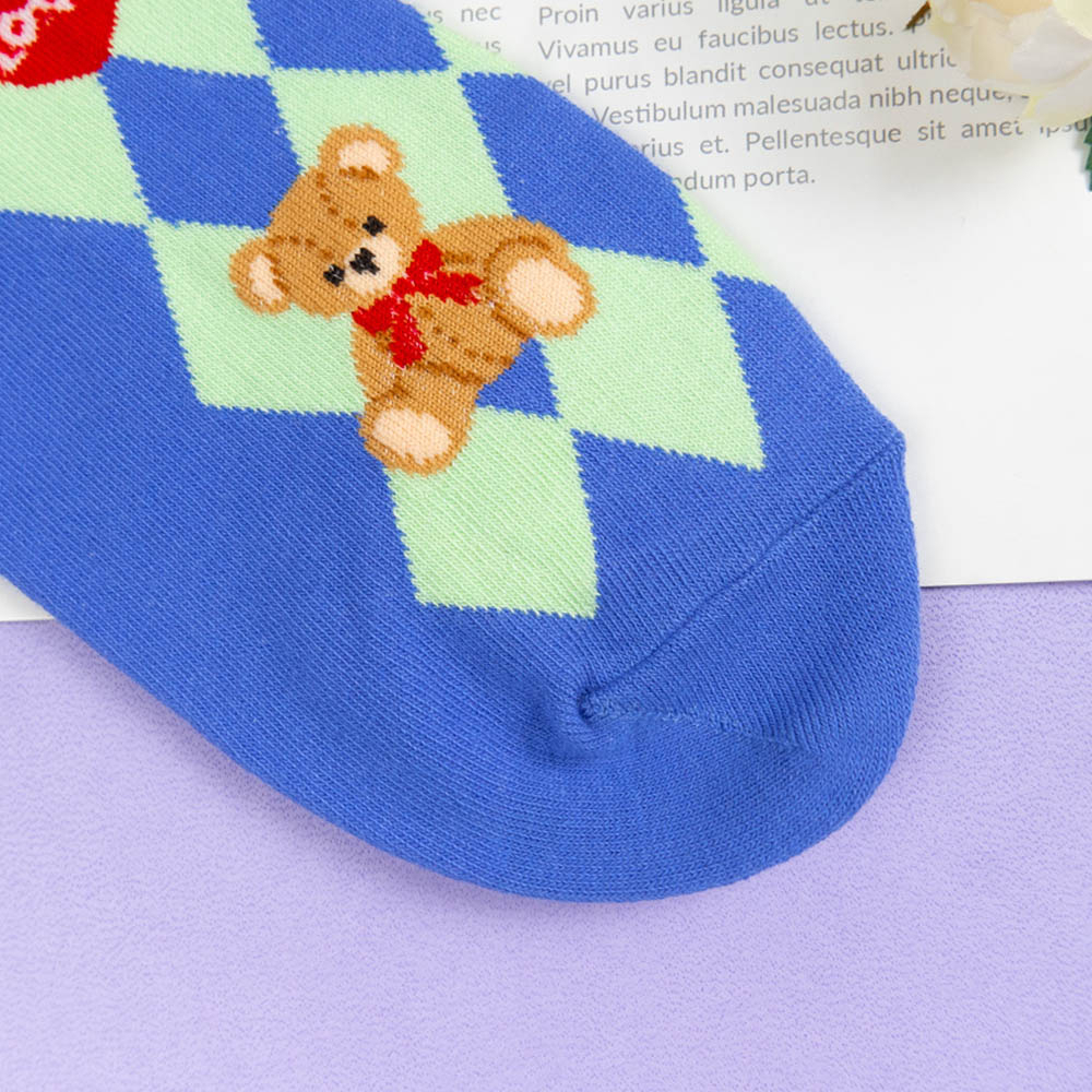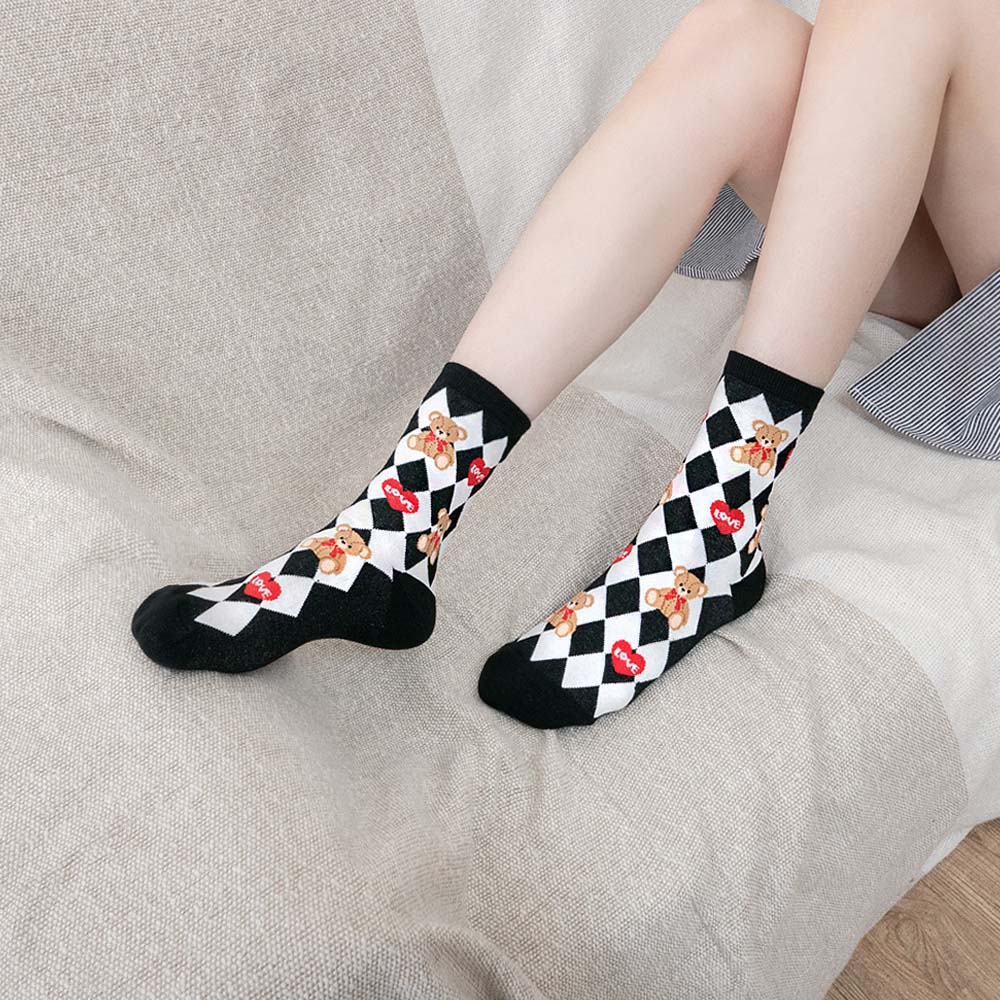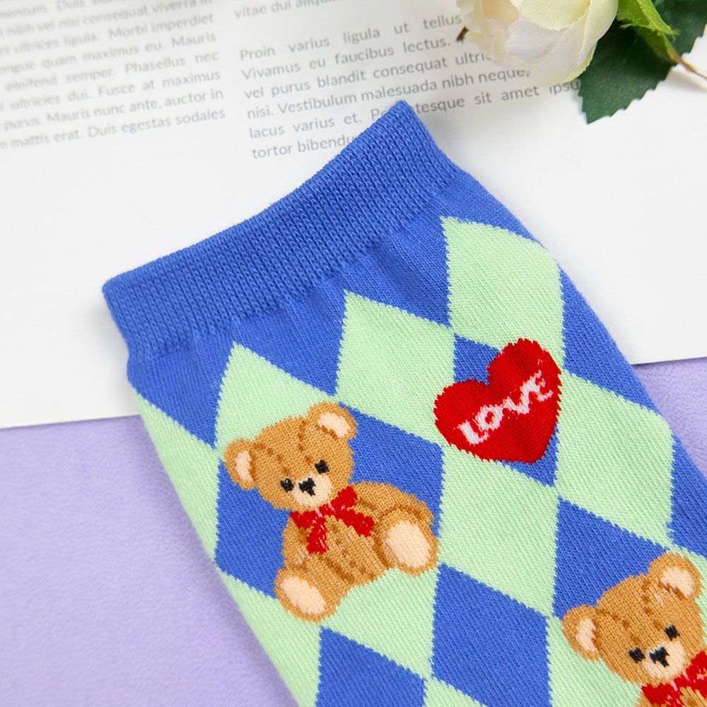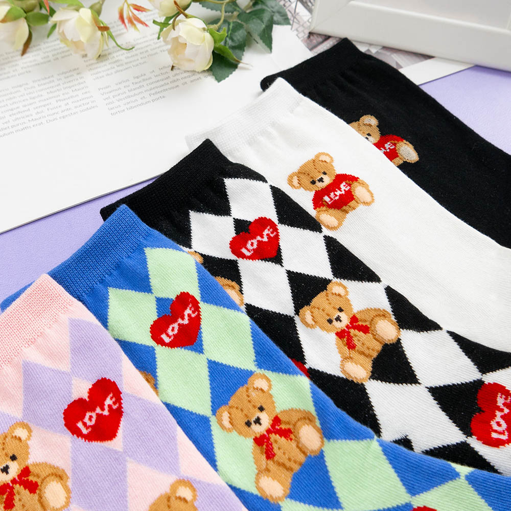 AHUA阿華有事嗎 韓國襪子 LOVE泰迪熊中筒襪 K1659 襪子推薦 流行襪首選 長襪 可愛 日系襪子粉底紫格|藍底綠格|黑底白格|白底|黑底SocksAHUA 韓國襪子品牌旗艦店