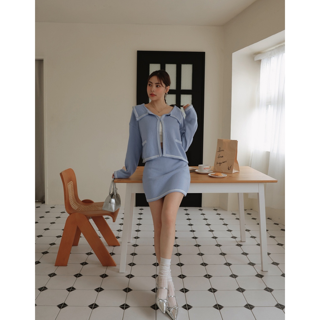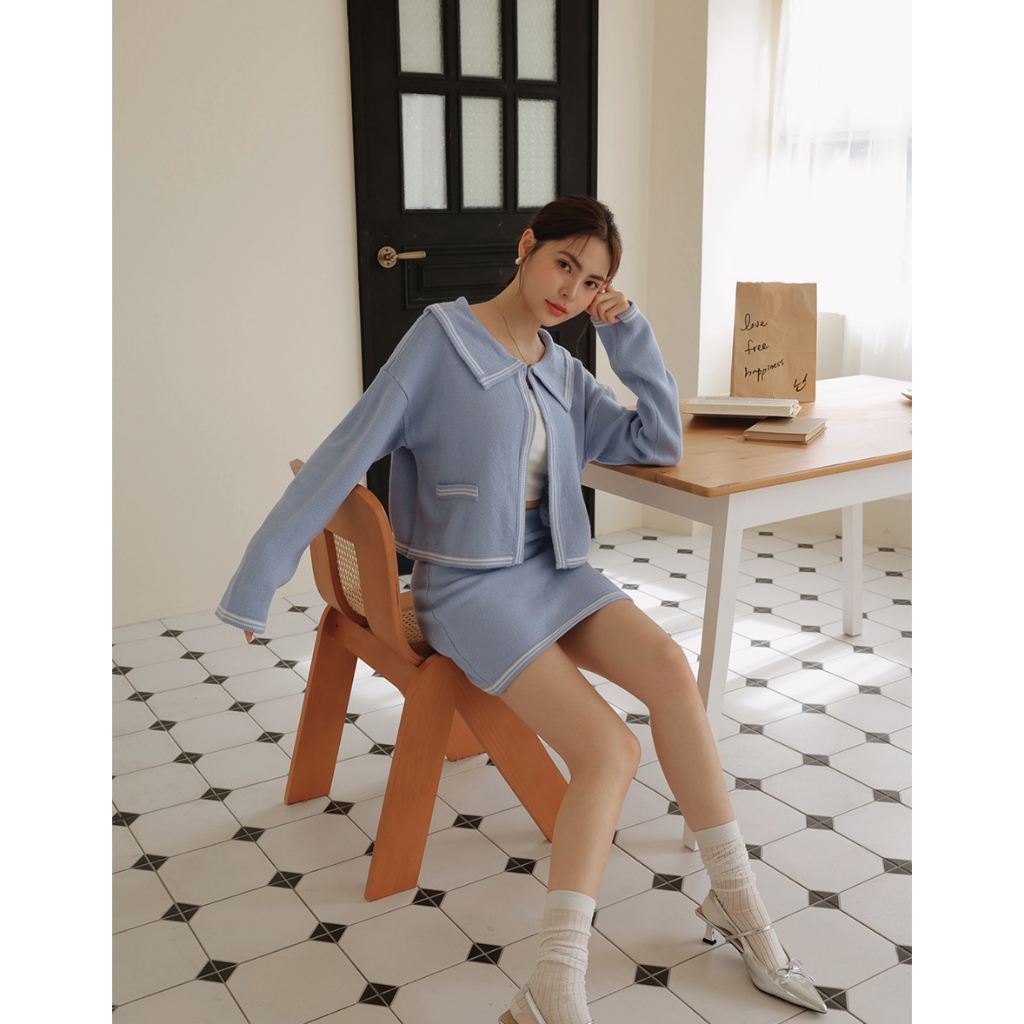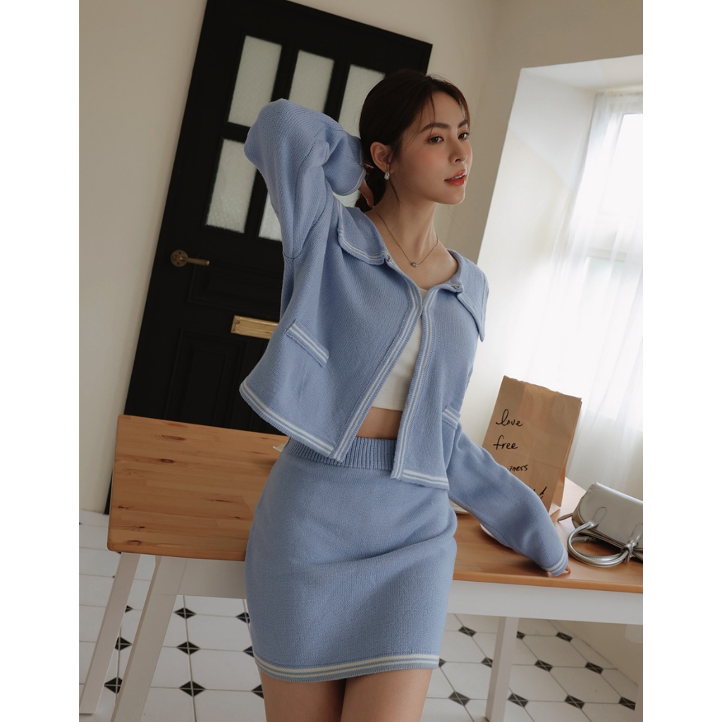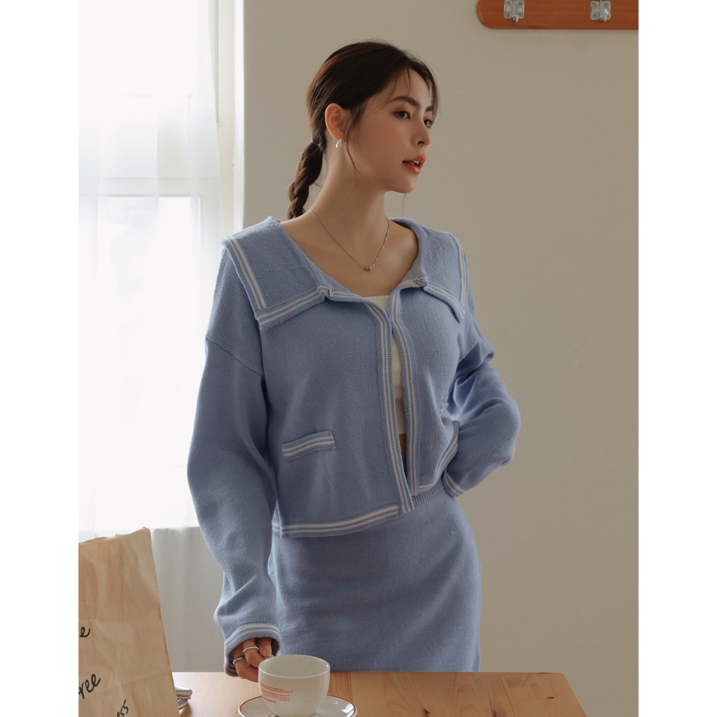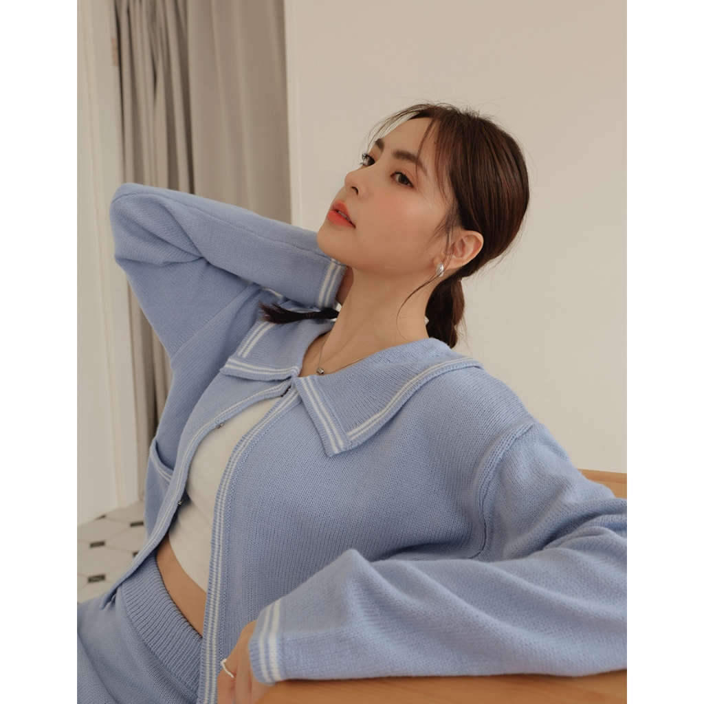 AIR SPACE LADY 法式領片配色勾釦針織外套 (藍/灰) 女裝 現貨藍,S|藍,M|灰,S|灰,MAIR SPACE