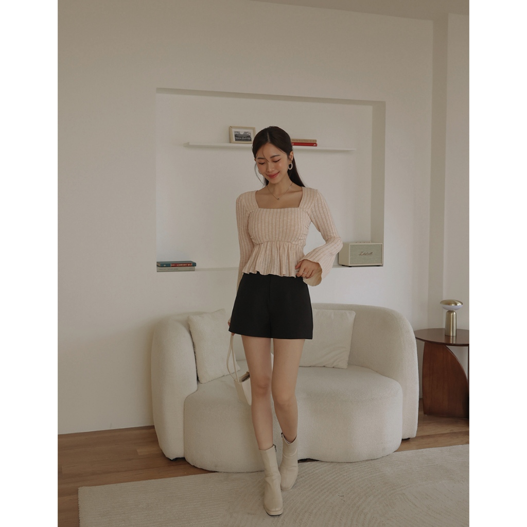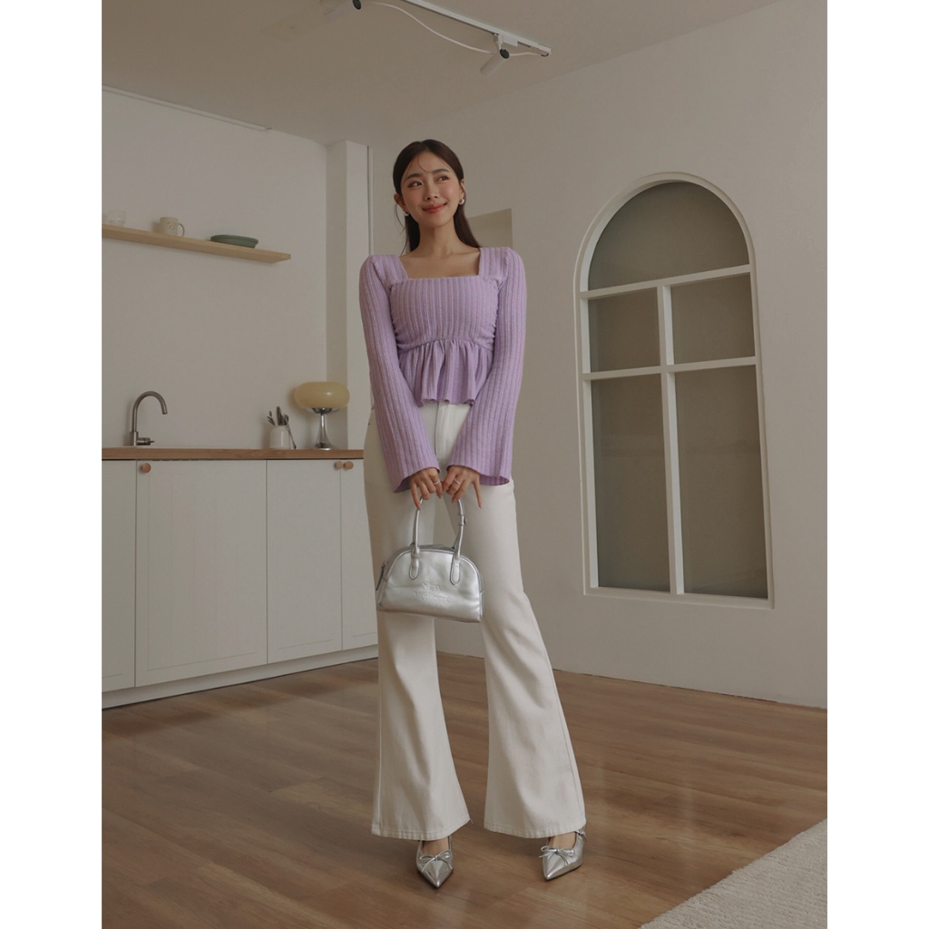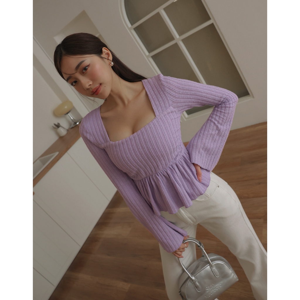 AIR SPACE LADY 方領荷葉傘擺針織上衣(杏/紫) 女裝 現貨杏,S|杏,M|杏,L|紫,S|紫,M|紫,LAIR SPACE