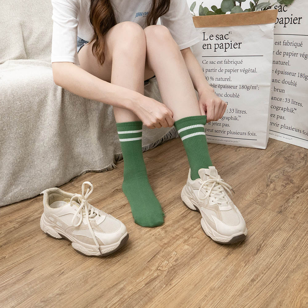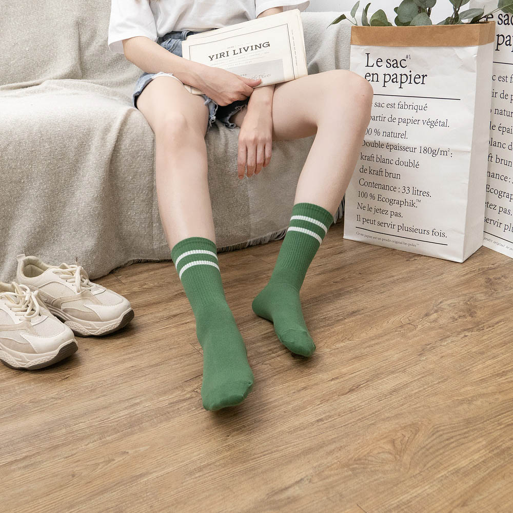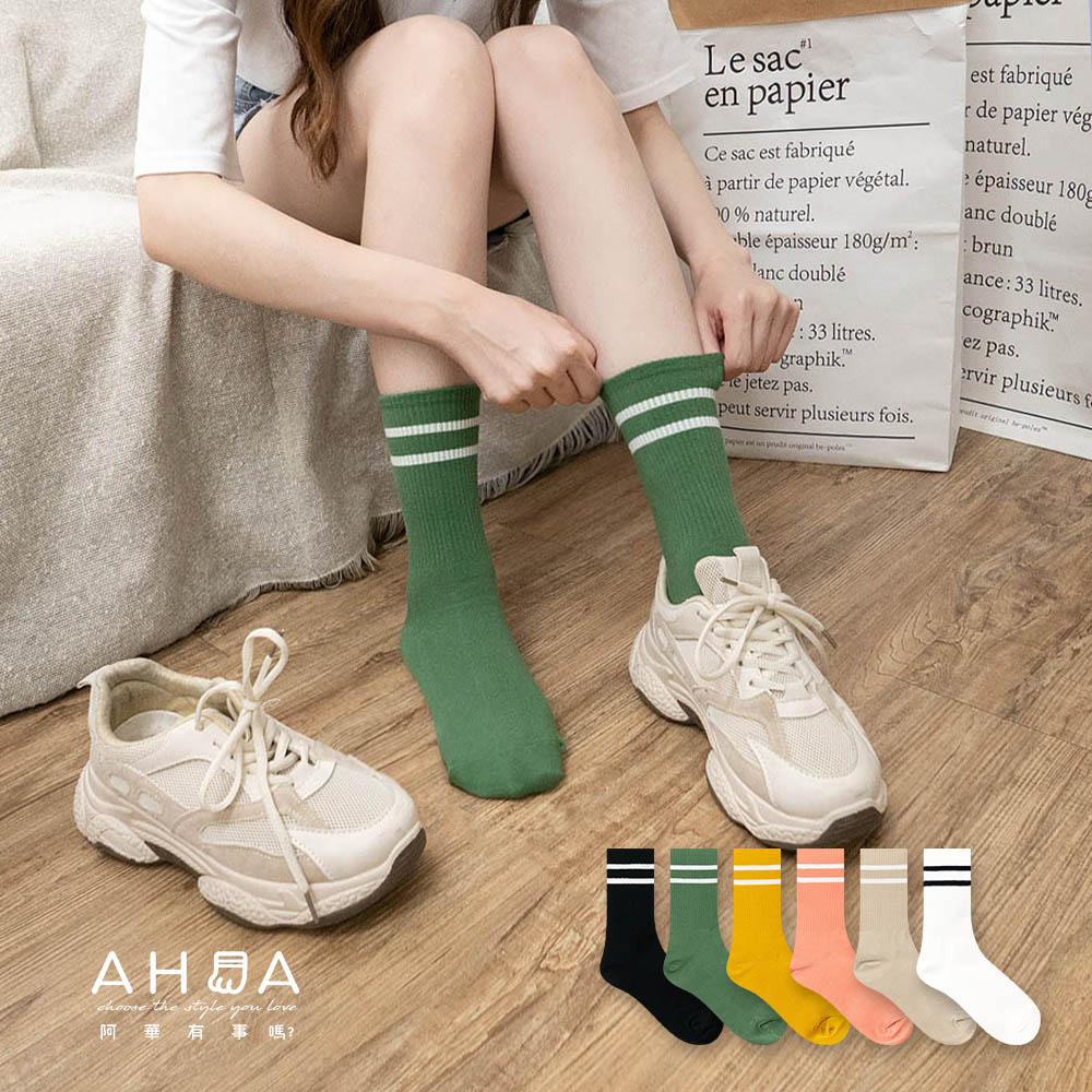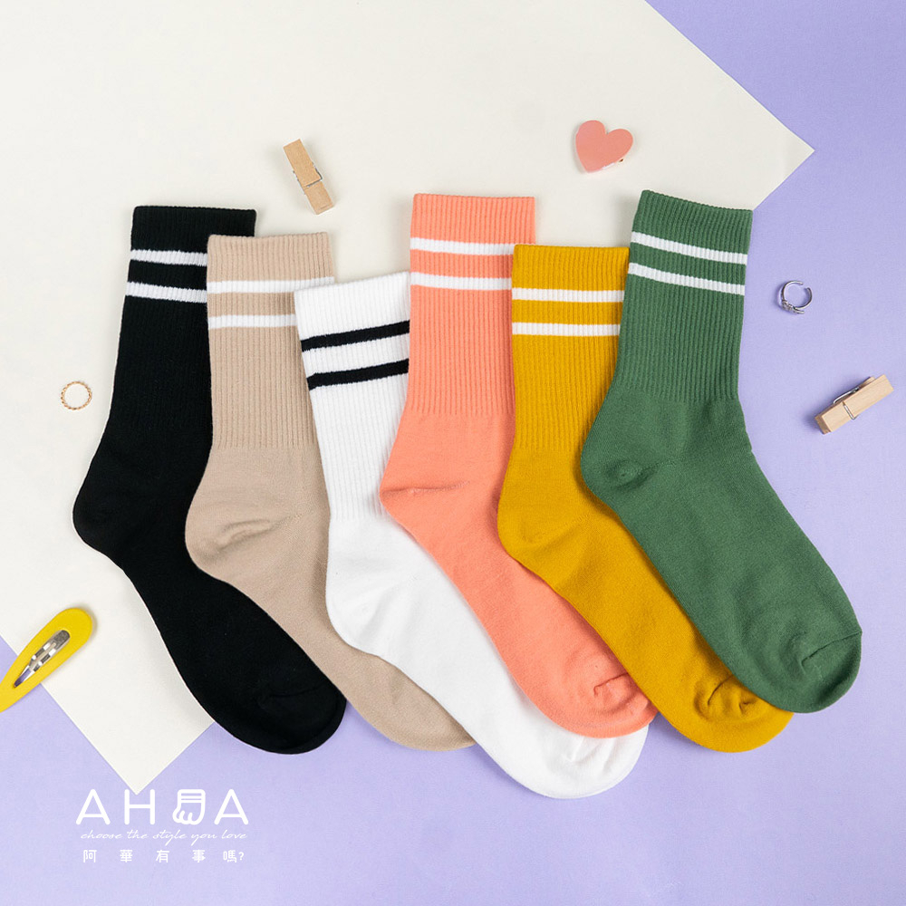 AHUA 韓國襪子 純色雙條紋中筒襪 K1695 襪子推薦 女生襪子 女襪 條紋襪子 運動襪 長襪 阿華有事嗎咖啡底|綠底|黑底|白底|粉橘底|薑黃底SocksAHUA 韓國襪子品牌旗艦店