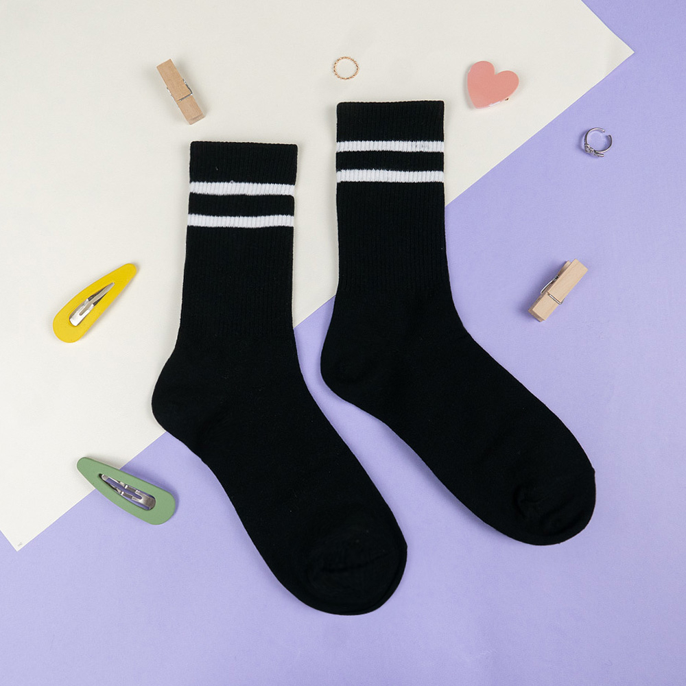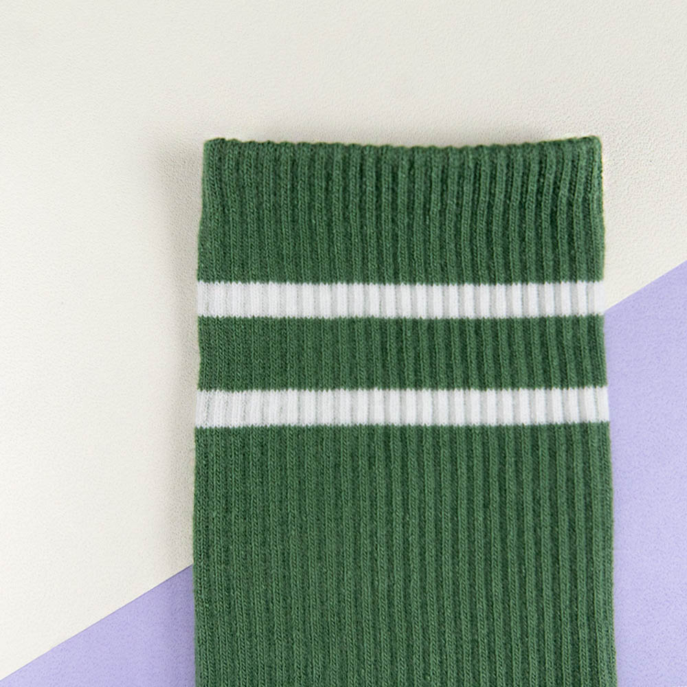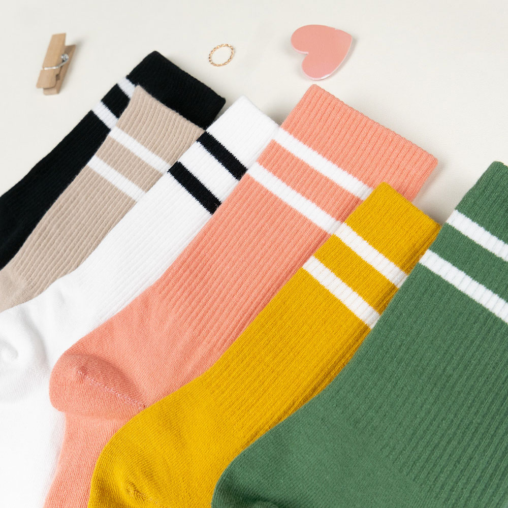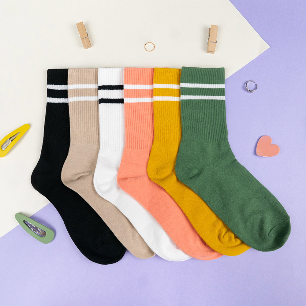 AHUA 韓國襪子 純色雙條紋中筒襪 K1695 襪子推薦 女生襪子 女襪 條紋襪子 運動襪 長襪 阿華有事嗎咖啡底|綠底|黑底|白底|粉橘底|薑黃底SocksAHUA 韓國襪子品牌旗艦店