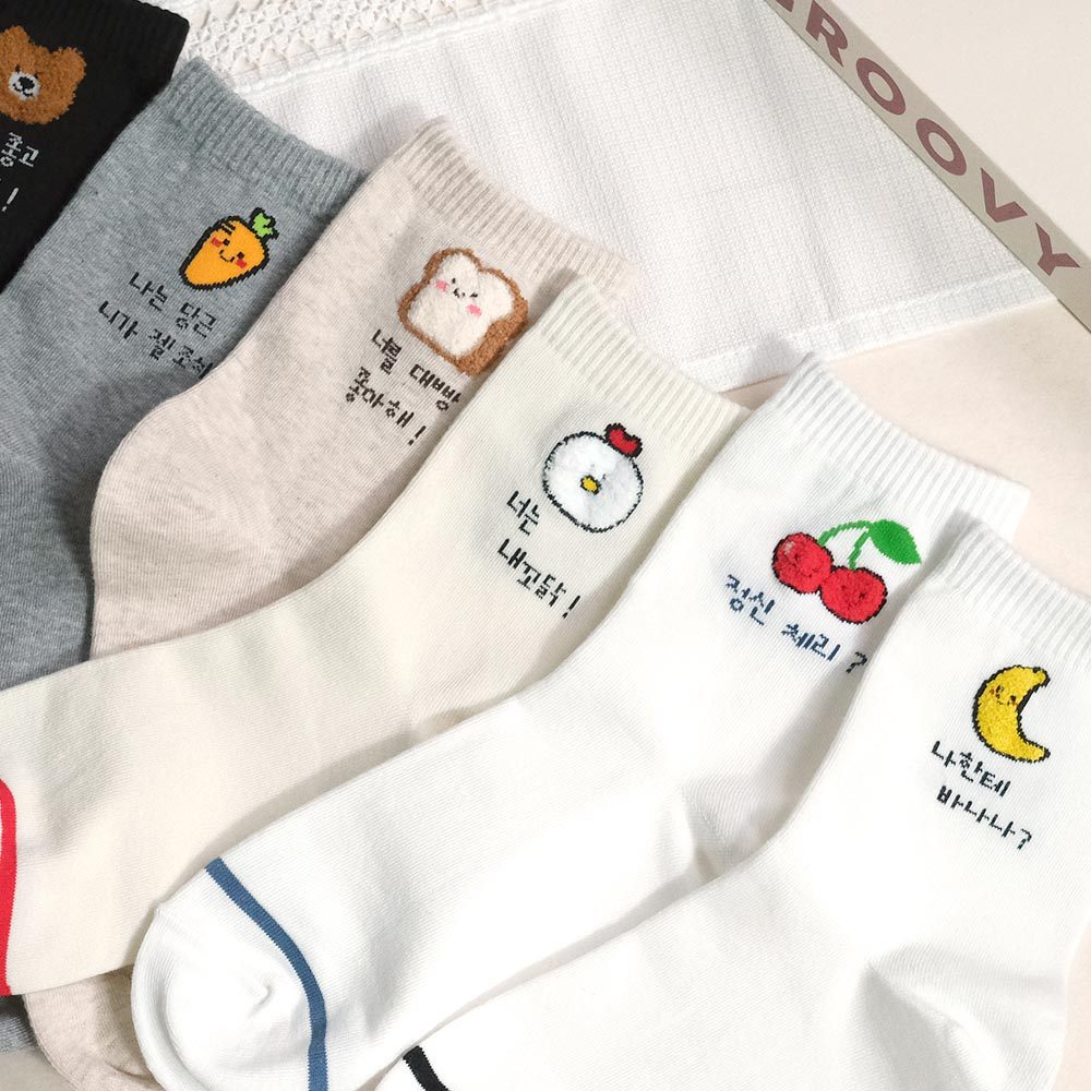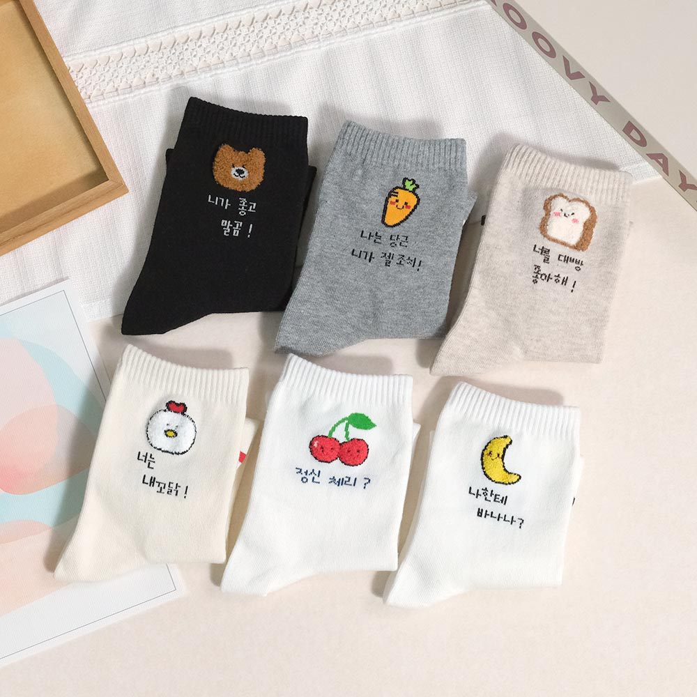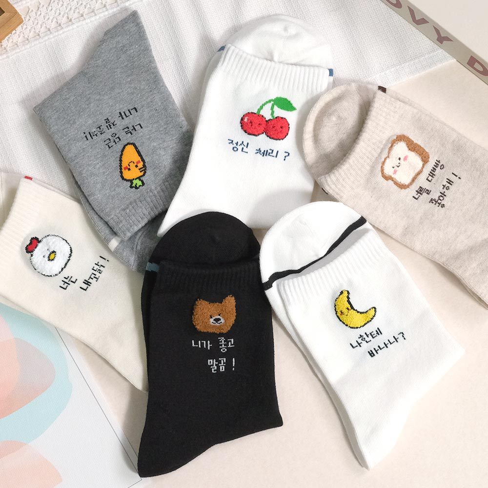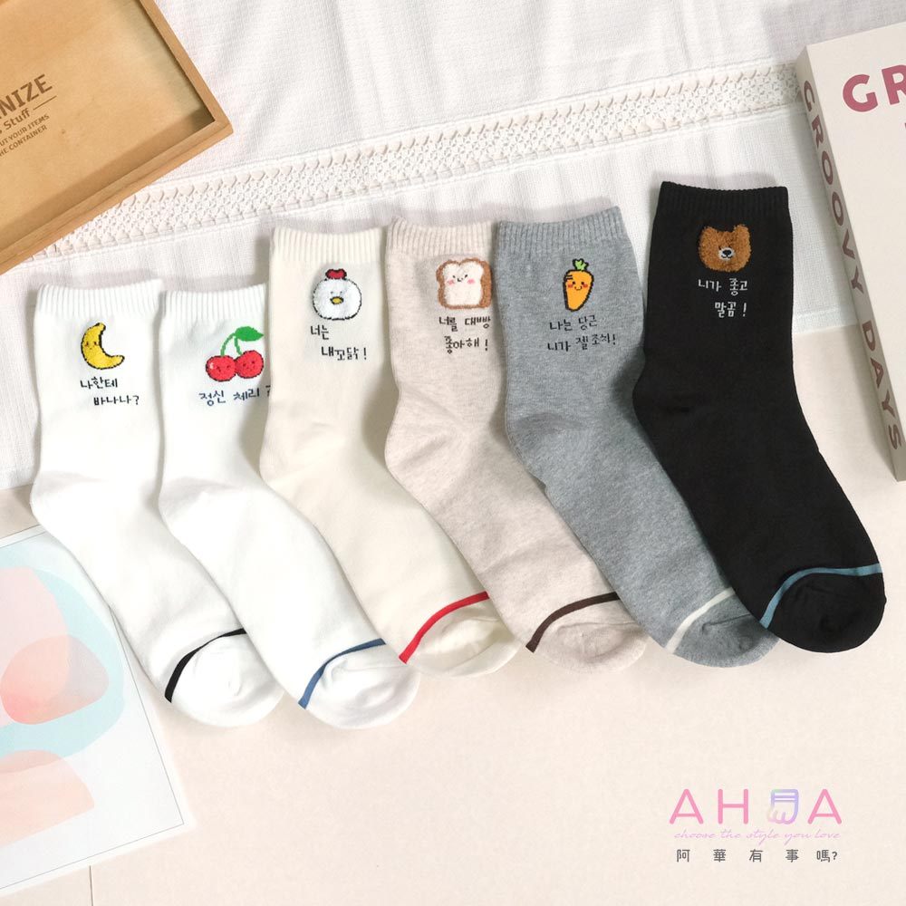 AHUA 阿華有事嗎 立體毛毛小圖韓語留言中筒襪 K2304 正韓襪子 百搭純棉襪 韓妞必備 少女襪白底香蕉|白底櫻桃|米黃底公雞|米白底吐司|灰底胡蘿蔔|黑底熊熊SocksAHUA 韓國襪子品牌旗艦店