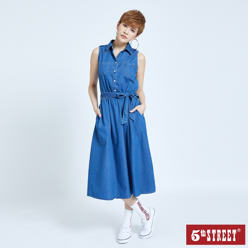 【5th STREET】 女裝 無袖綁帶長牛仔洋裝-中古藍 (990049)S|M5thStreet 官方旗艦店