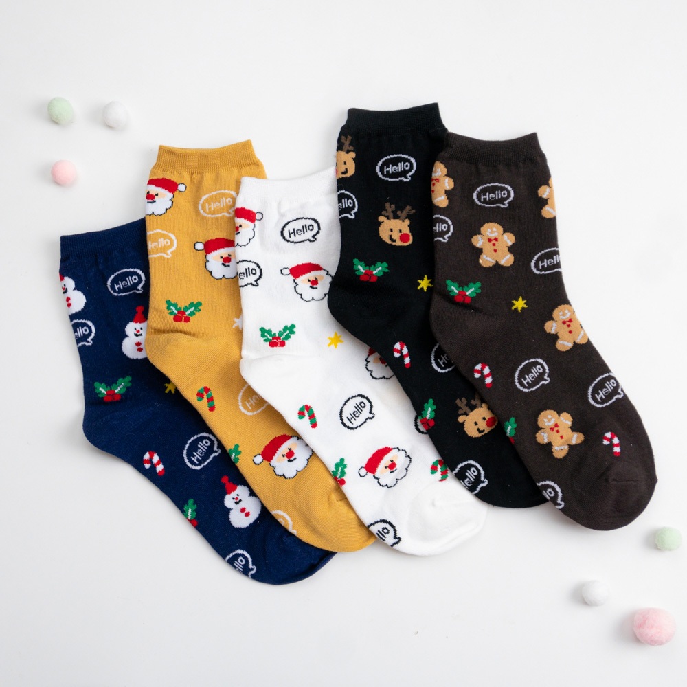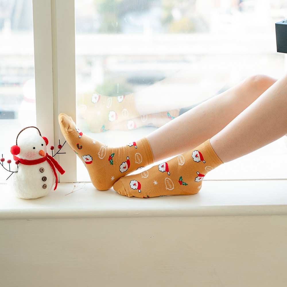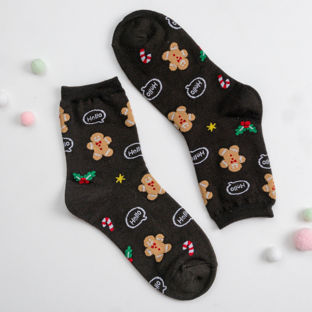 AHUA阿華有事嗎 韓國襪子 滿版Hello聖誕人物小圖中筒襪K1916 韓妞必備 百搭純棉襪 聖誕襪 交換禮物咖底薑餅人|黑底麋鹿|白底聖誕老人|薑黃底聖誕老人|深藍底雪人SocksAHUA 韓國襪子品牌旗艦店