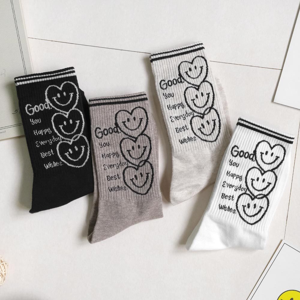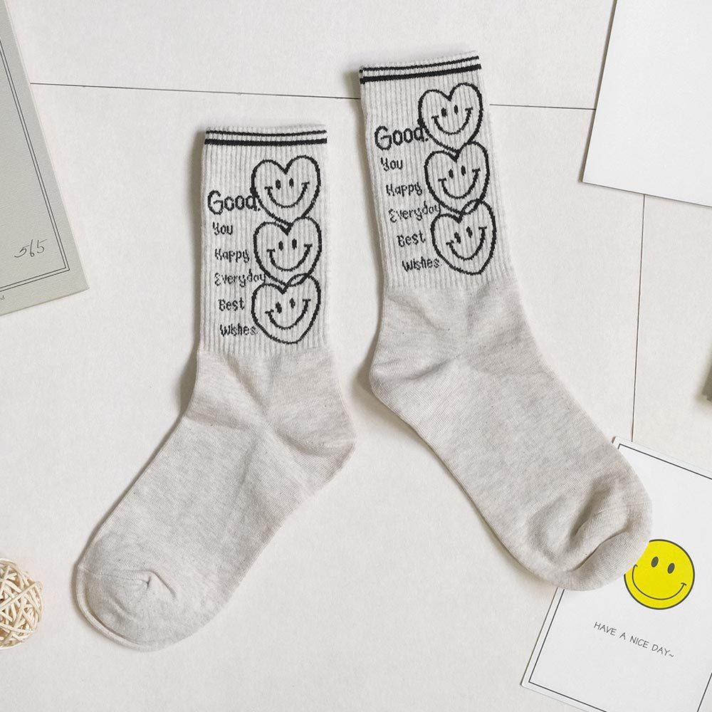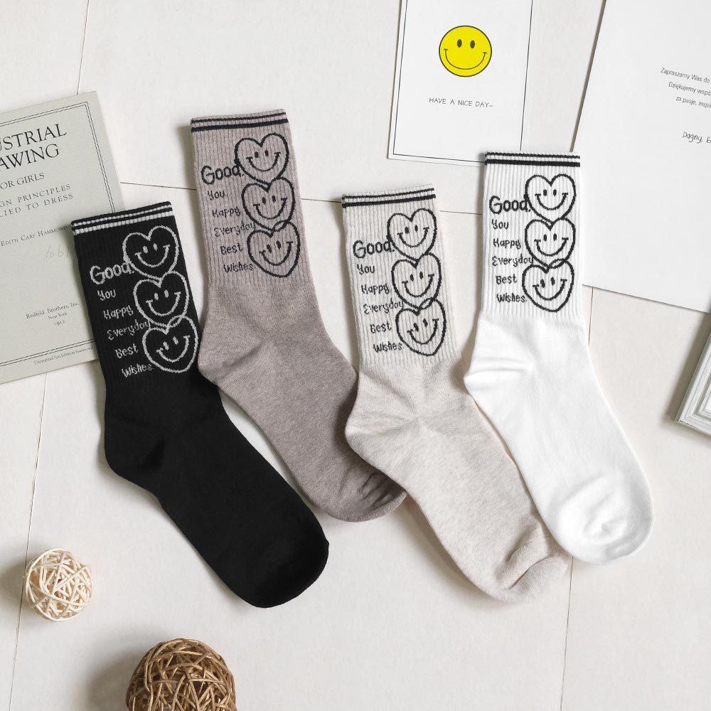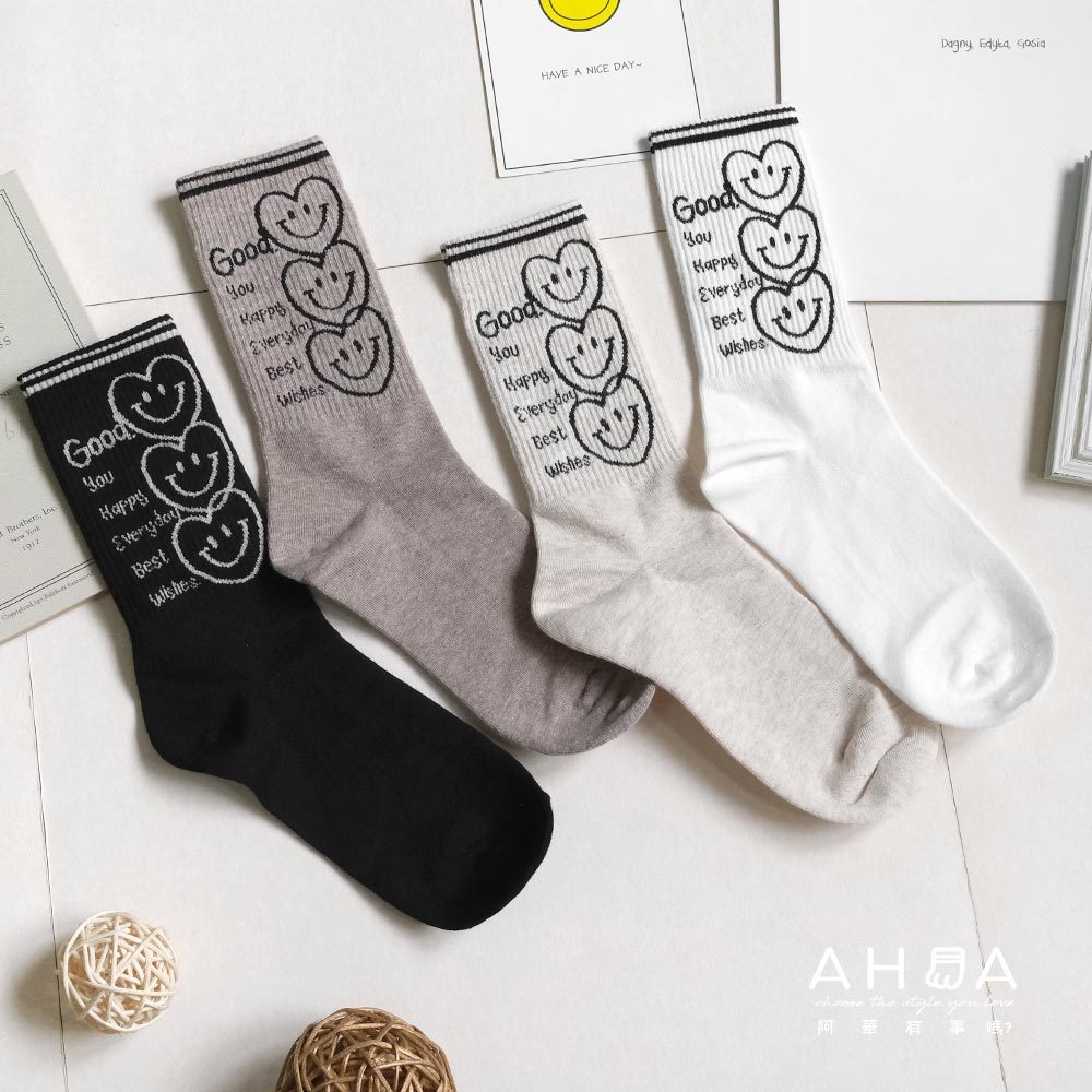 AHUA阿華有事嗎 最好的祝福三個微笑愛心中長筒襪 K2186 正韓襪子 百搭純棉襪 韓妞必備 少女襪白底|米白底|咖啡底|黑底SocksAHUA 韓國襪子品牌旗艦店