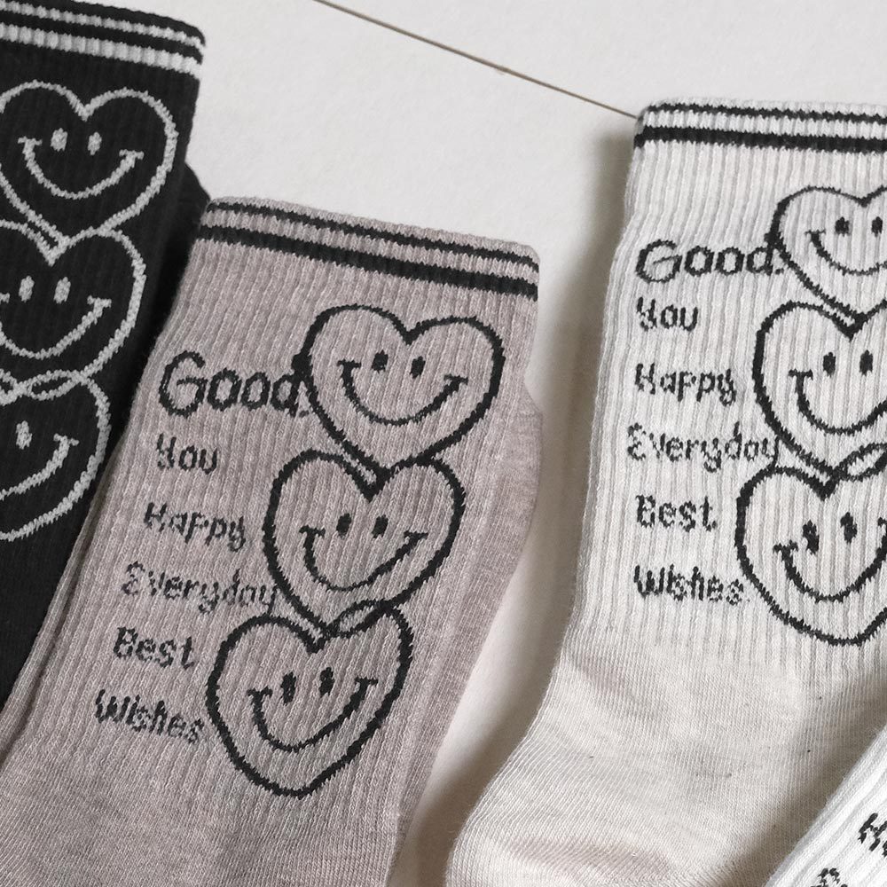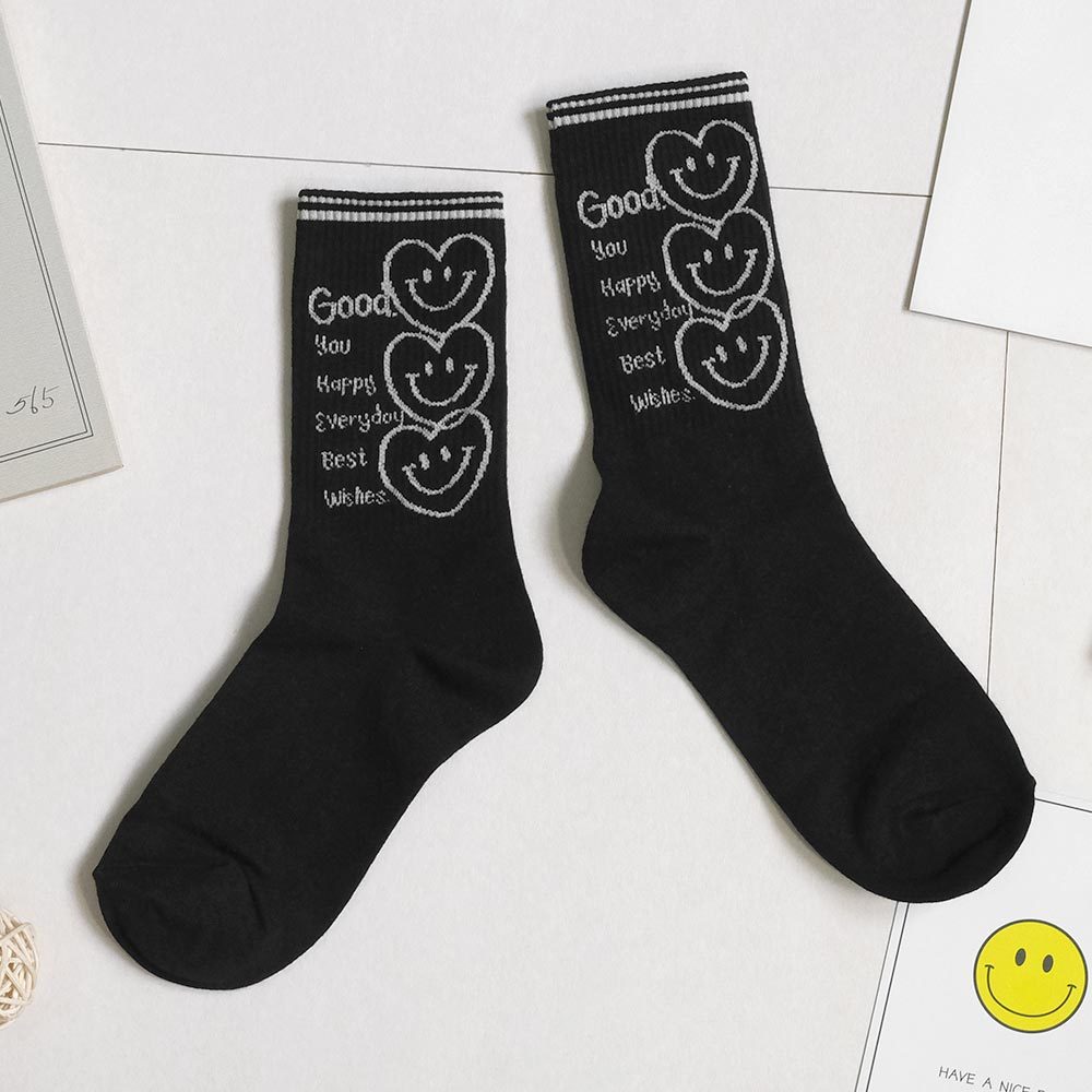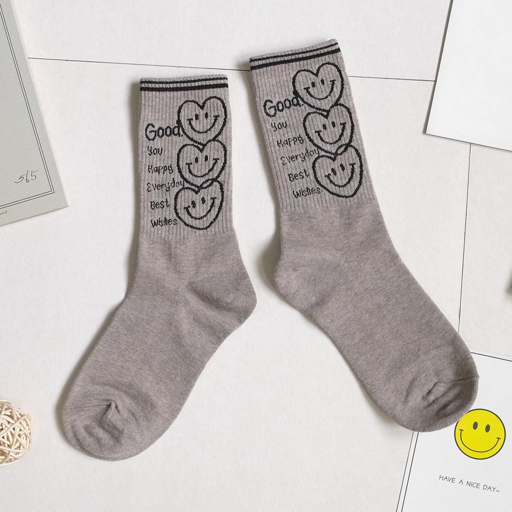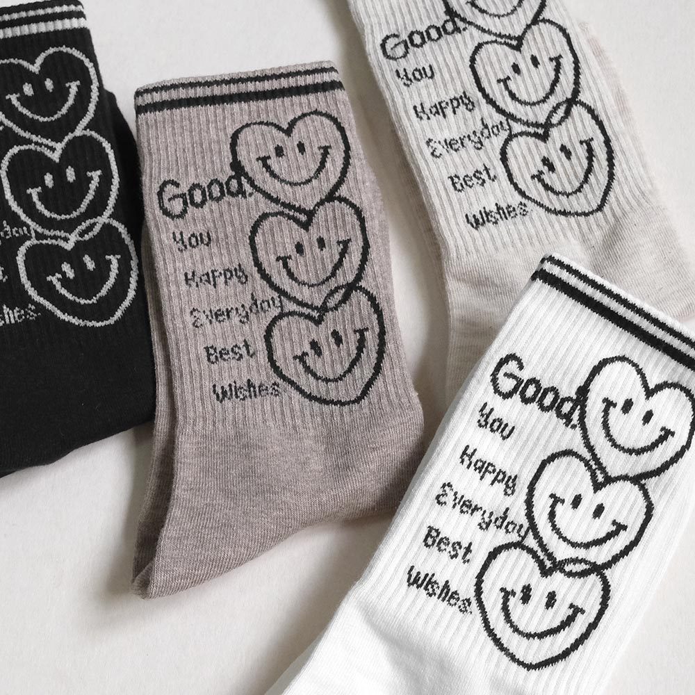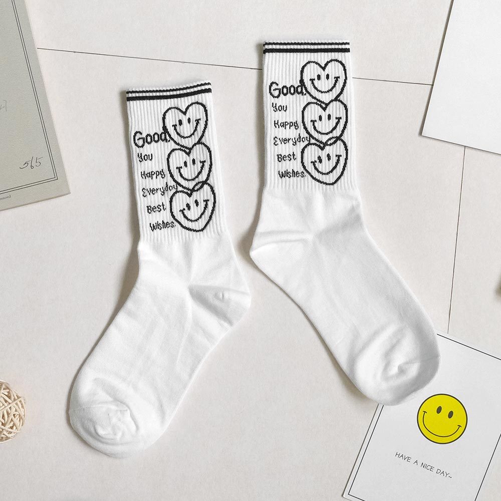 AHUA阿華有事嗎 最好的祝福三個微笑愛心中長筒襪 K2186 正韓襪子 百搭純棉襪 韓妞必備 少女襪白底|米白底|咖啡底|黑底SocksAHUA 韓國襪子品牌旗艦店
