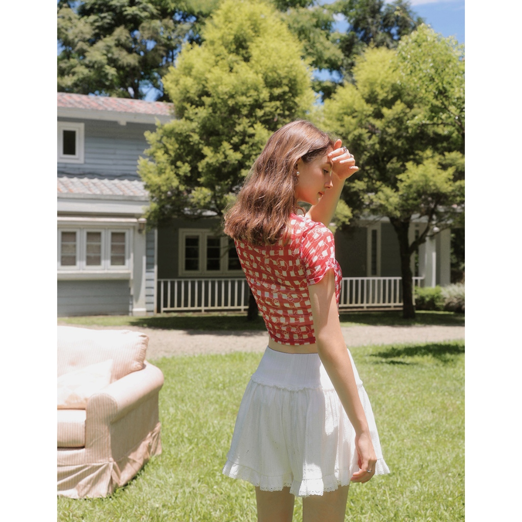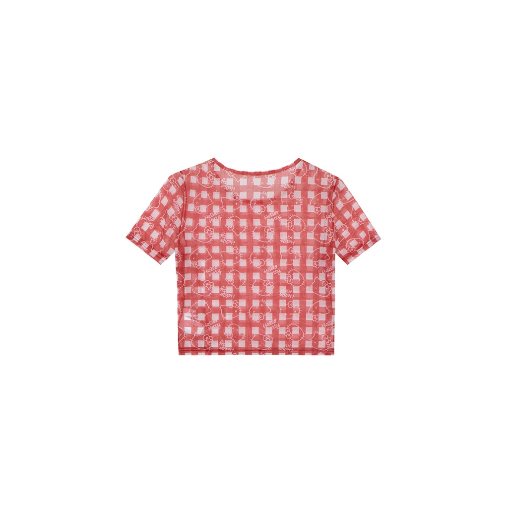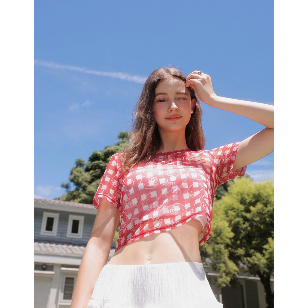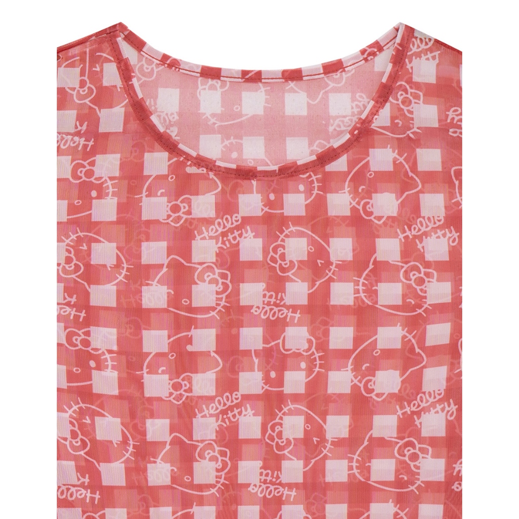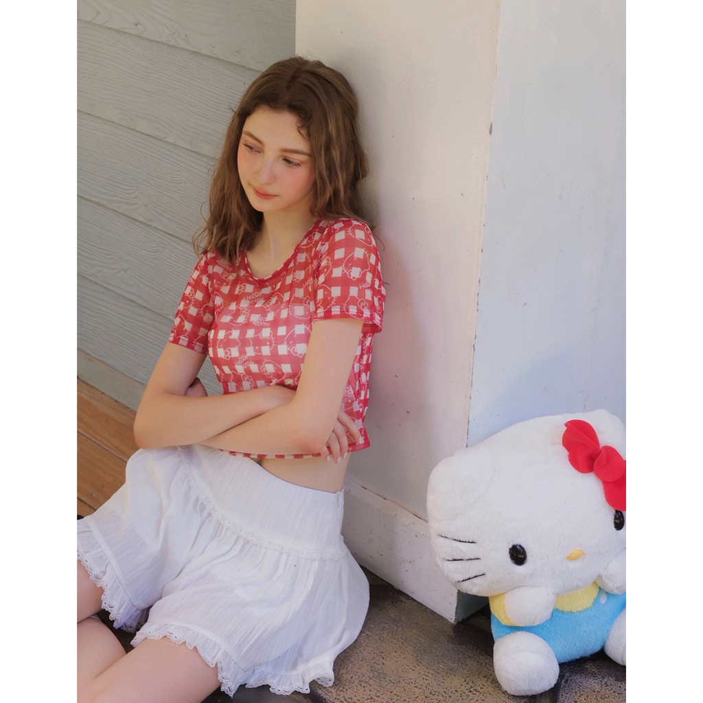 AIR SPACE 【三麗鷗聯名】Hello Kitty印刷格紋透膚短版上衣(紅) 女裝 現貨紅,S|紅,M|紅,LT-shirtsAIR SPACE