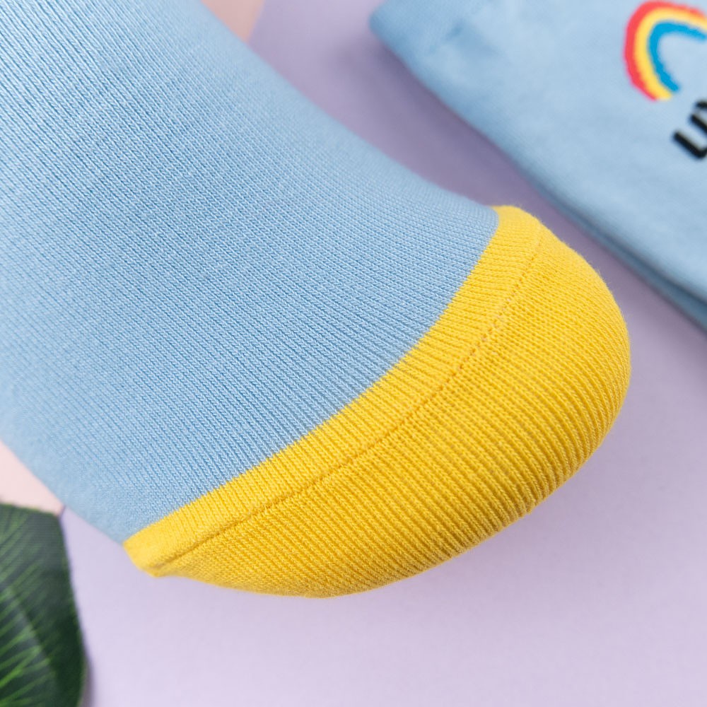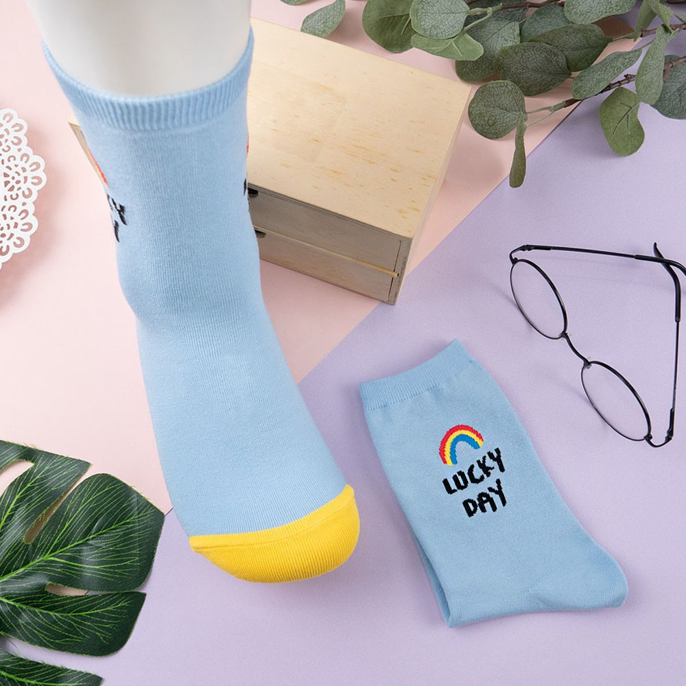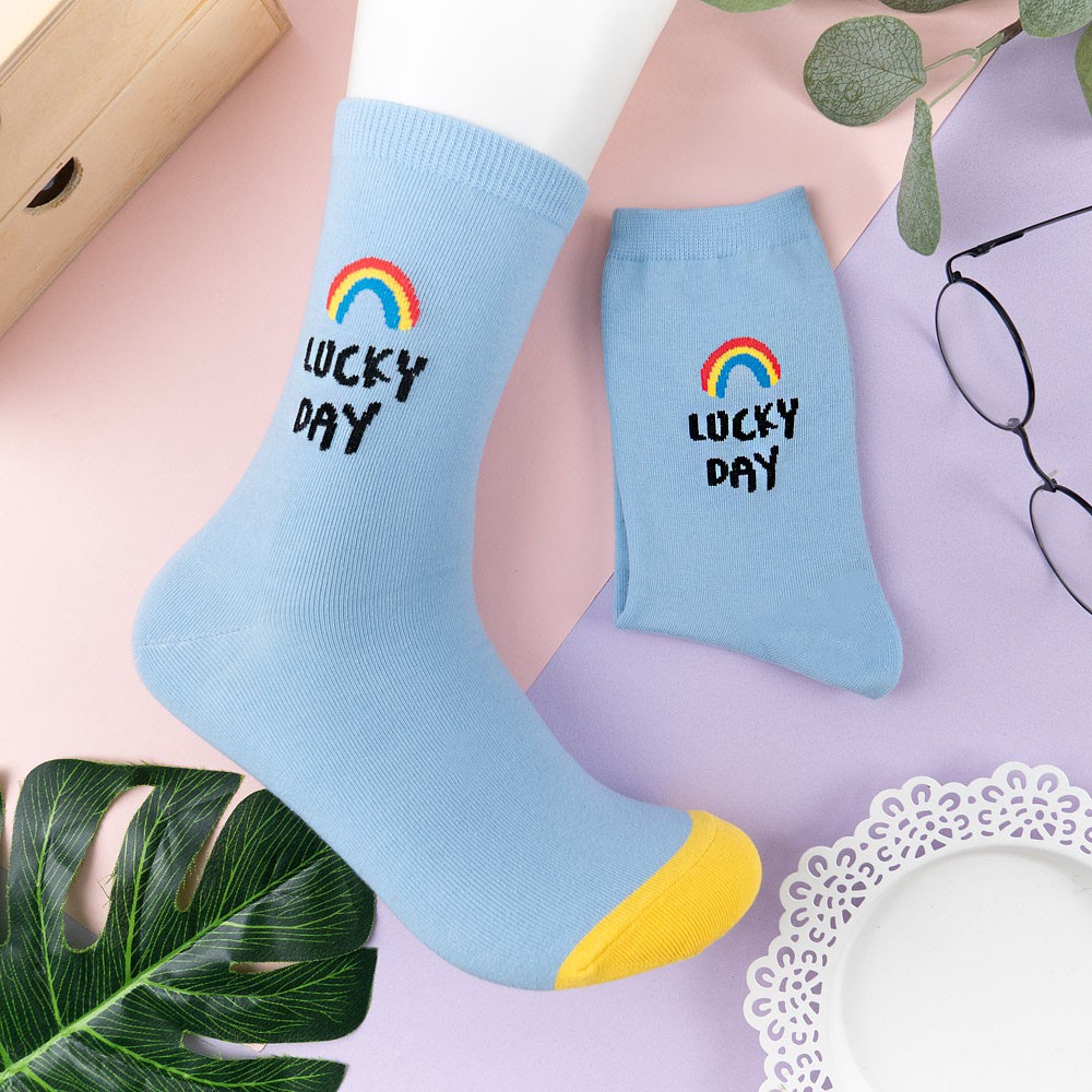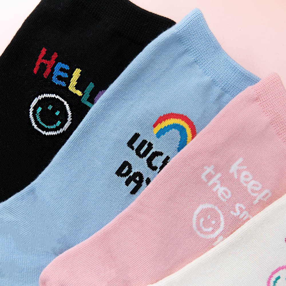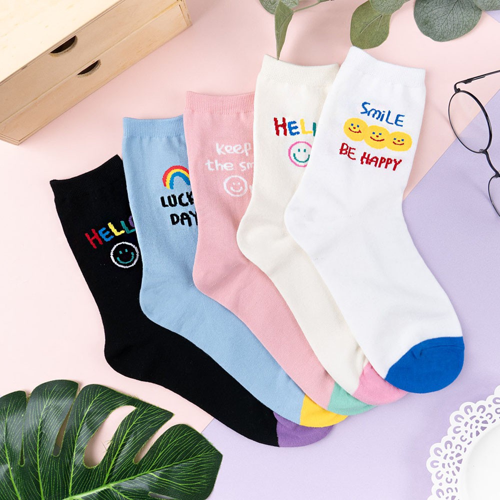 阿華有事嗎AUHA 韓國襪子 彩色微笑英文中筒襪 K1049 少女襪 韓妞必備長襪 百搭純棉襪白底藍前跟|黑底紫前跟|米白底粉前跟|粉底綠前跟|藍底黃前跟SocksAHUA 韓國襪子品牌旗艦店