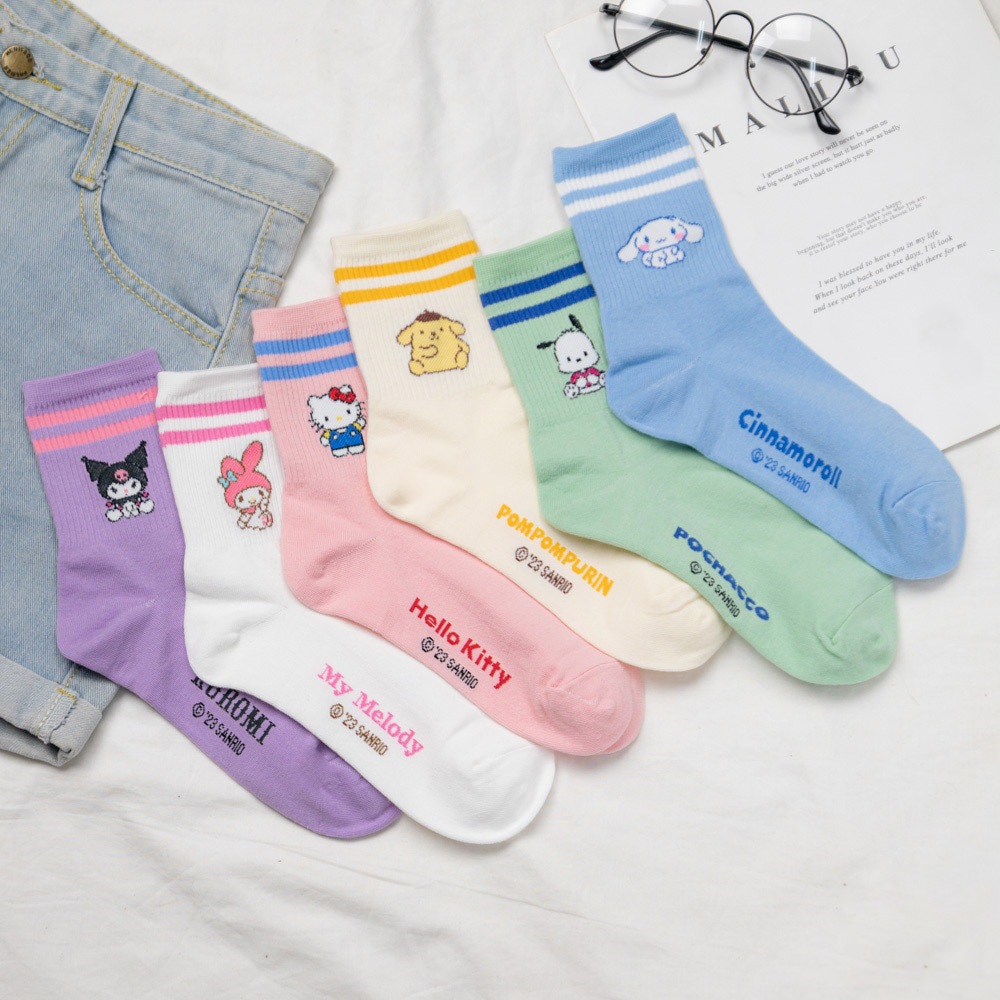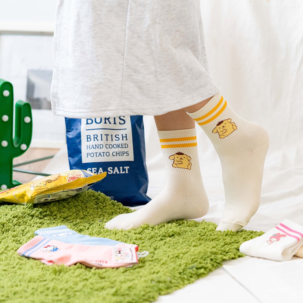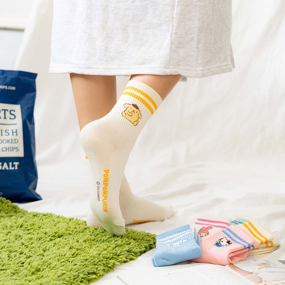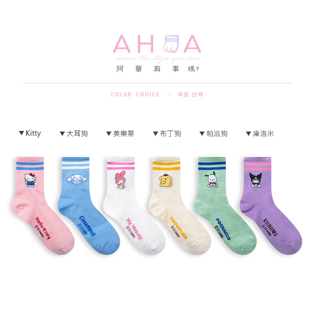 AHUA阿華有事嗎 韓國襪子 三麗鷗雙條紋人物中筒襪 女生襪子 K1873 韓妞必備 百搭純棉襪 卡通 日系 可愛美樂蒂|布丁狗|Kitty|帕洽狗|大耳狗|酷洛米SocksAHUA 韓國襪子品牌旗艦店