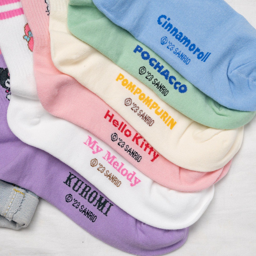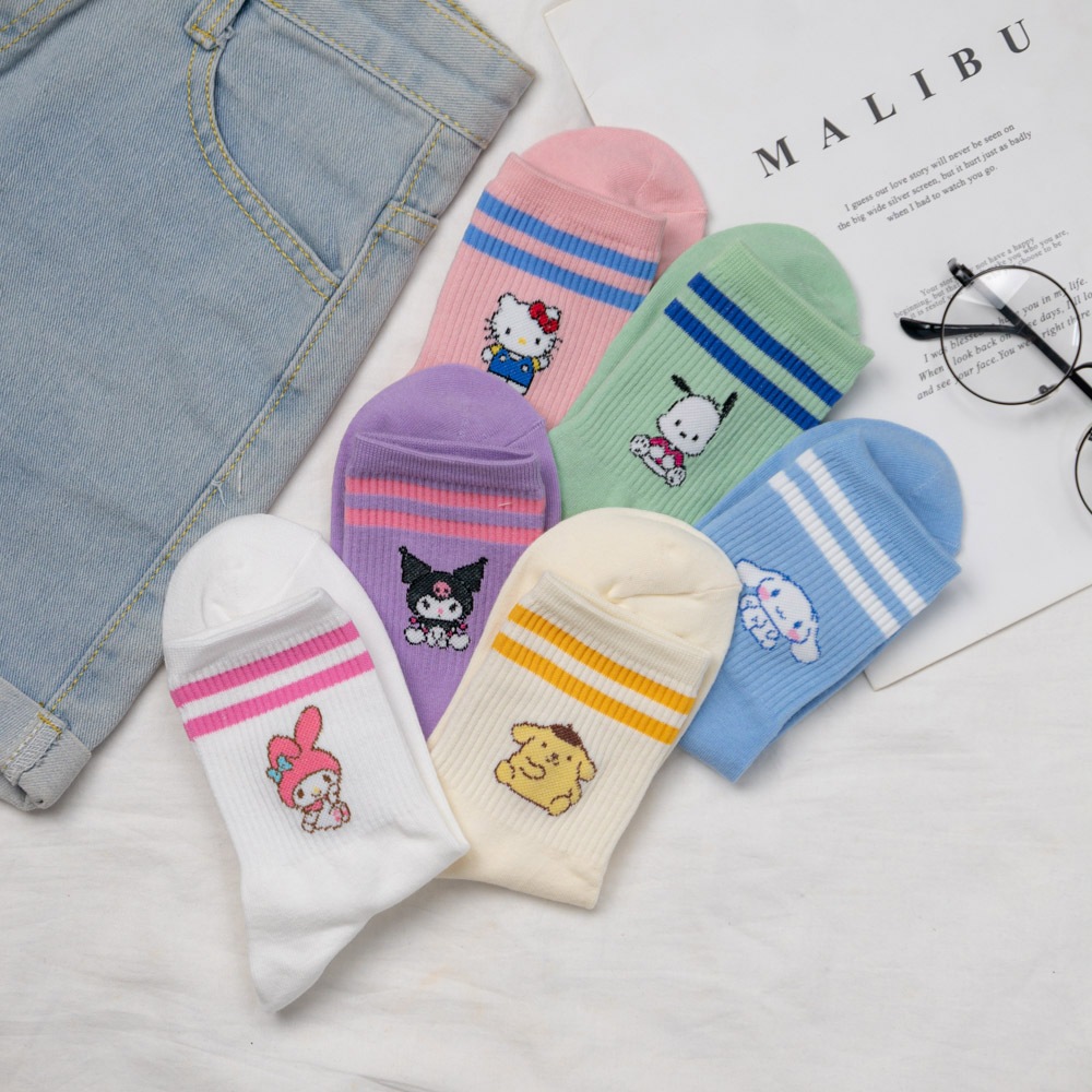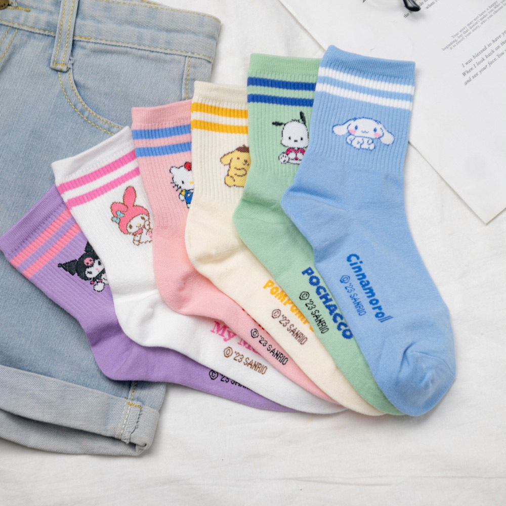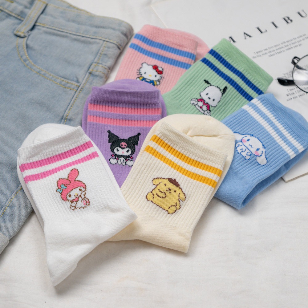 AHUA阿華有事嗎 韓國襪子 三麗鷗雙條紋人物中筒襪 女生襪子 K1873 韓妞必備 百搭純棉襪 卡通 日系 可愛美樂蒂|布丁狗|Kitty|帕洽狗|大耳狗|酷洛米SocksAHUA 韓國襪子品牌旗艦店
