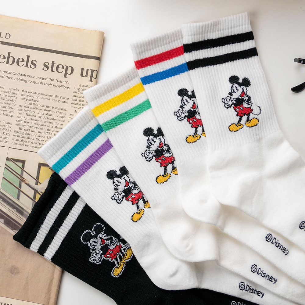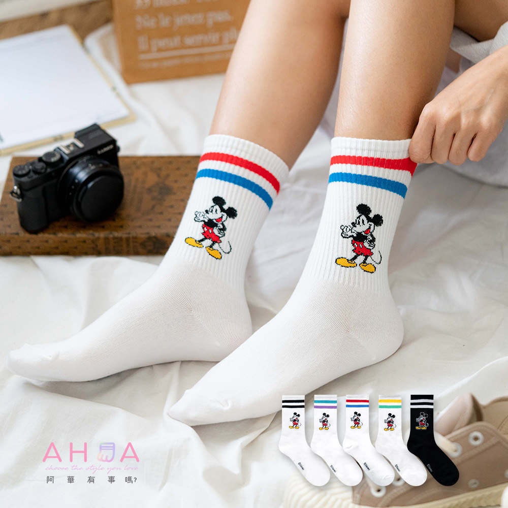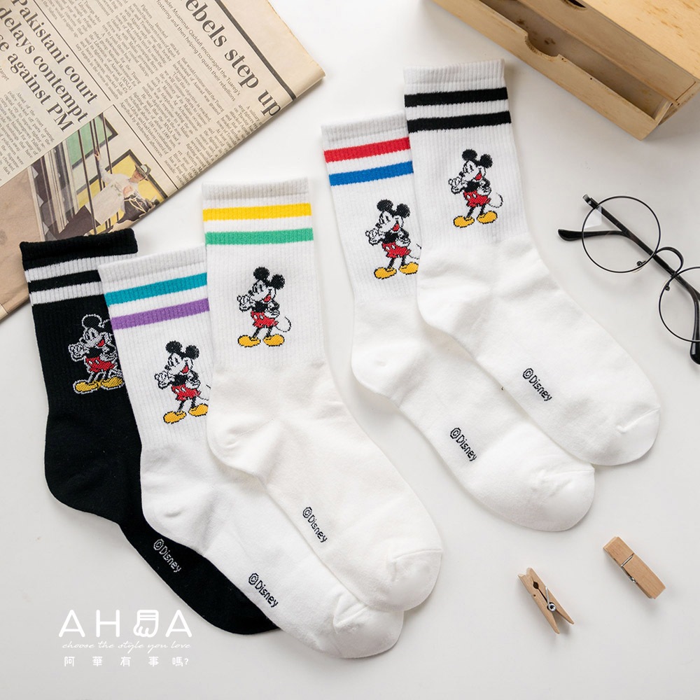 AHUA阿華有事嗎 韓國襪子 迪士尼雙條紋全身米奇中筒襪 K1880 韓妞必備 百搭純棉襪 卡通人物 日系 可愛 運動風黑條紋|紅藍條紋|黃綠條紋|藍綠紫條紋|黑底白條紋SocksAHUA 韓國襪子品牌旗艦店