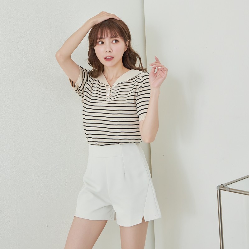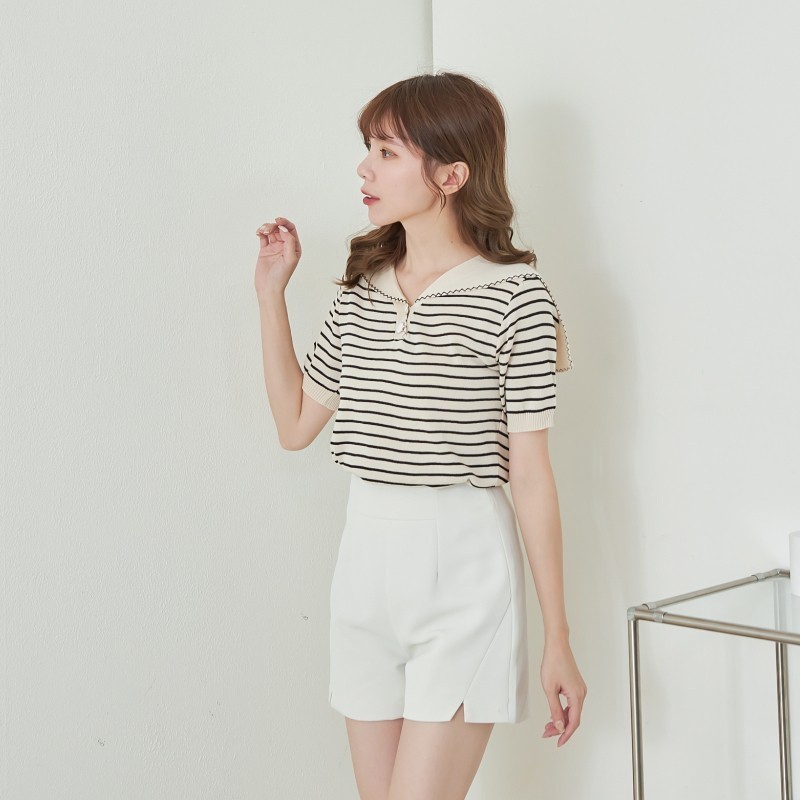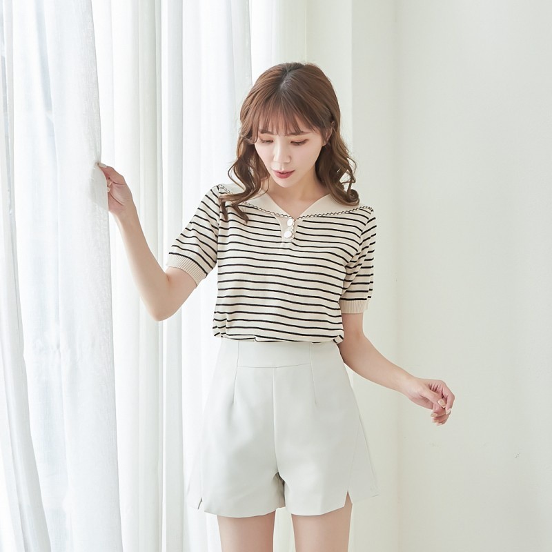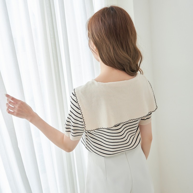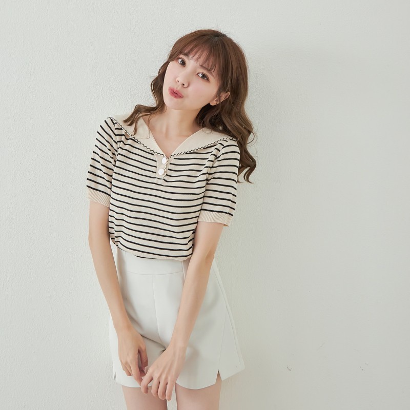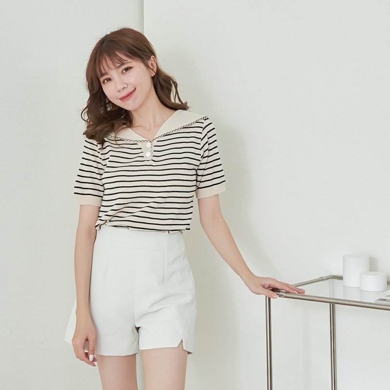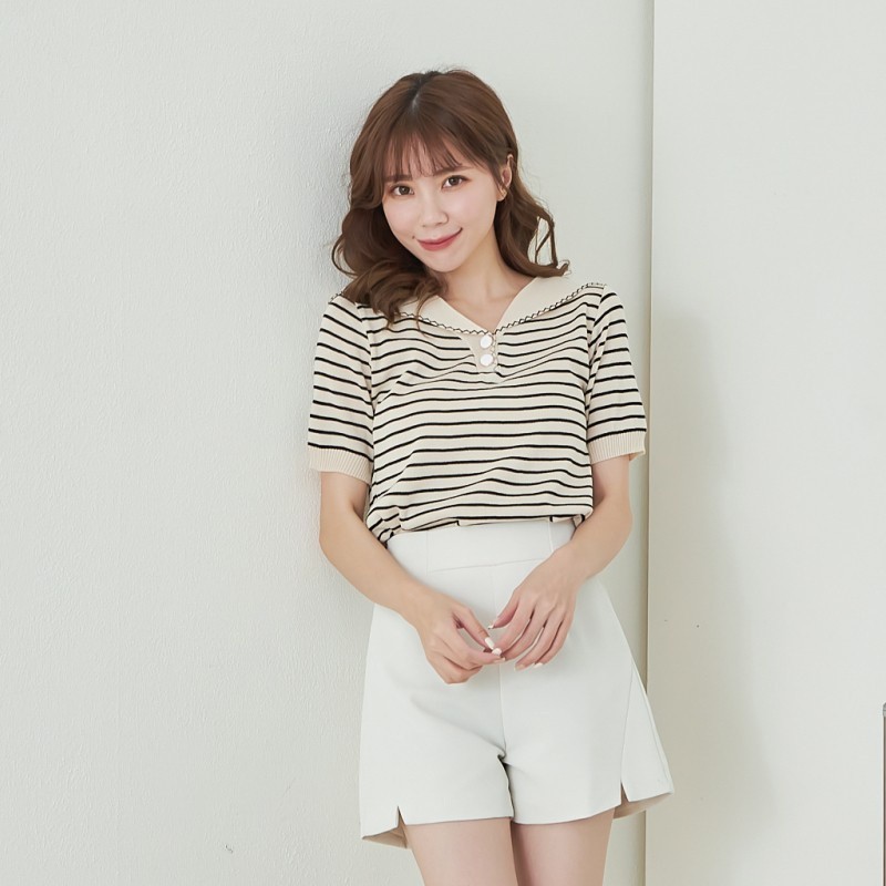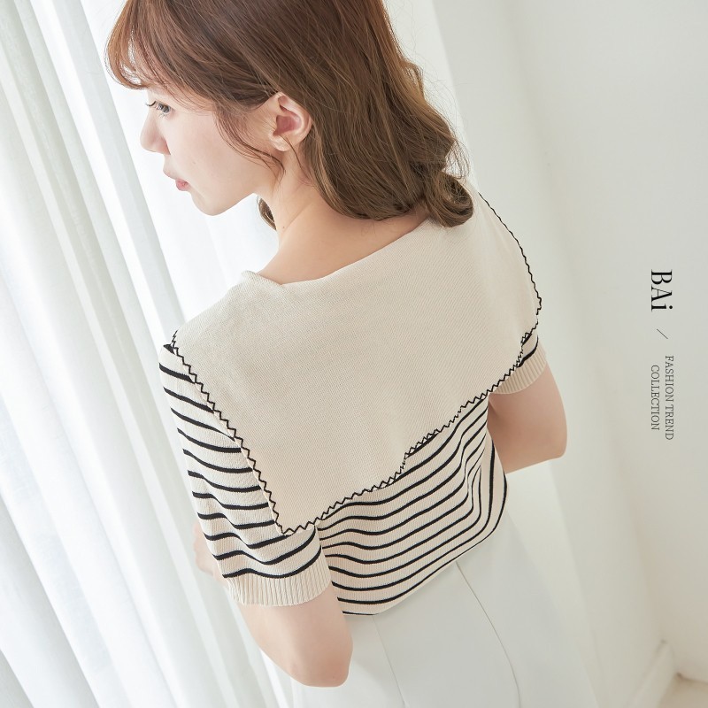 BAi白媽媽 針織衫/橫條雙釦披肩領短袖-台灣現貨 隔日到貨【350329】杏(22)BAi白媽媽 品牌旗艦店
