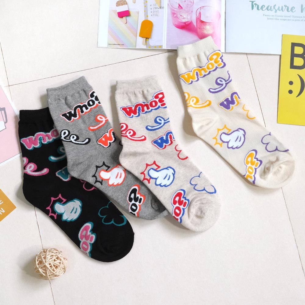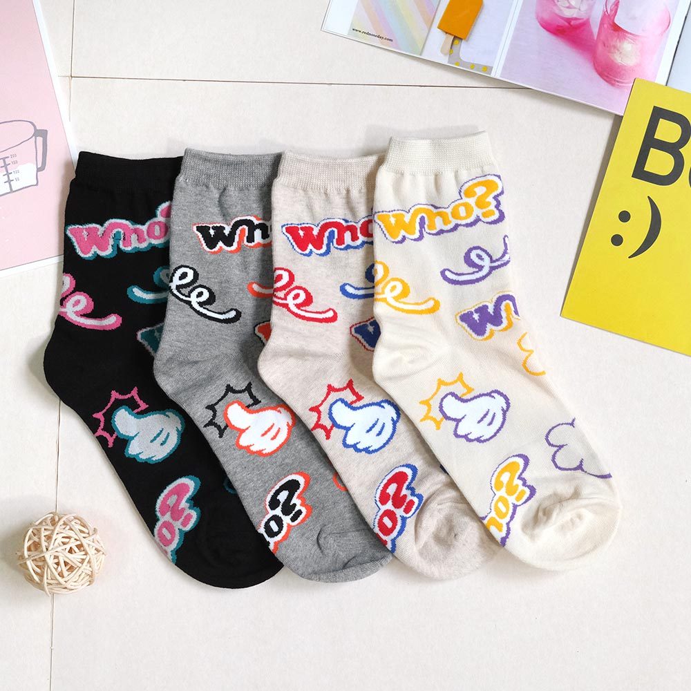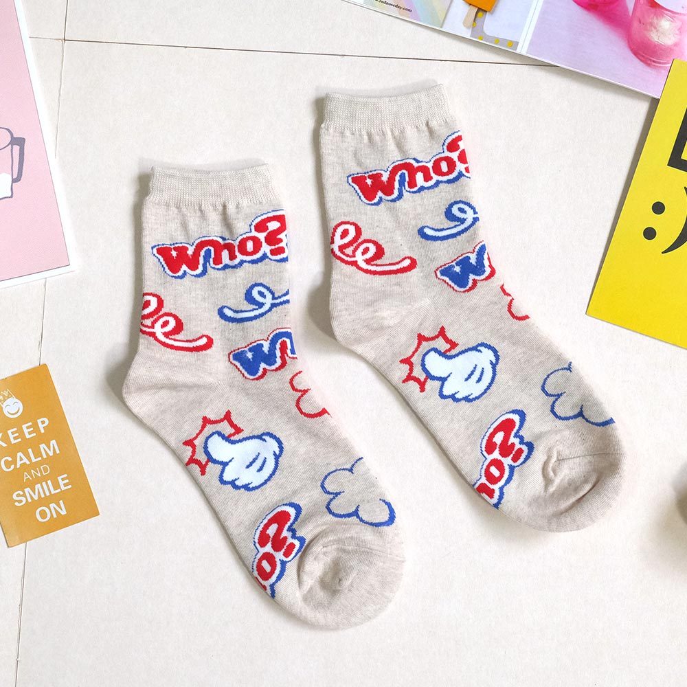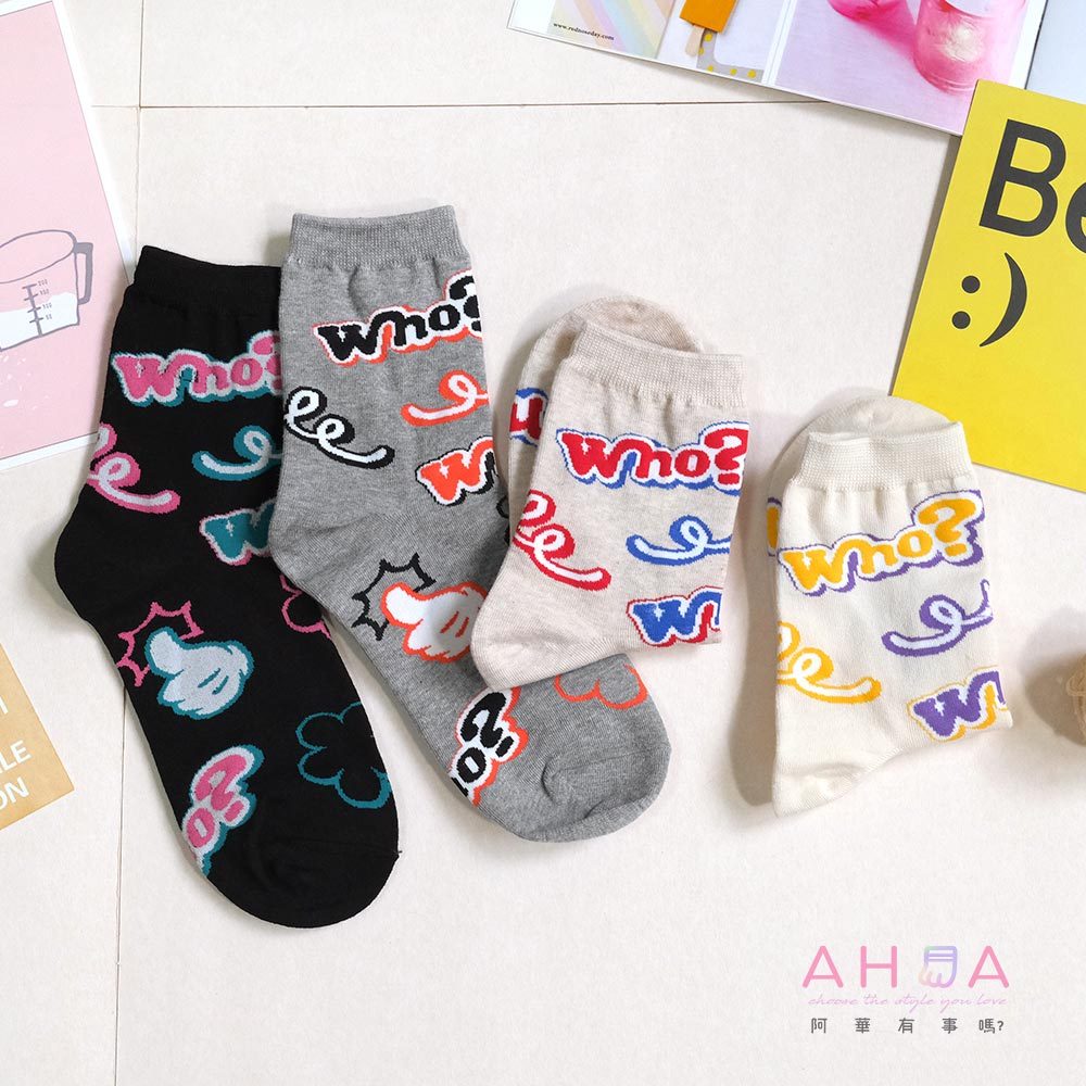 AHUA阿華有事嗎 滿版Who?比讚塗鴉中筒襪 K2177 正韓襪子 百搭純棉襪 韓妞必備 少女襪米黃底|米白底|灰底|黑底SocksAHUA 韓國襪子品牌旗艦店