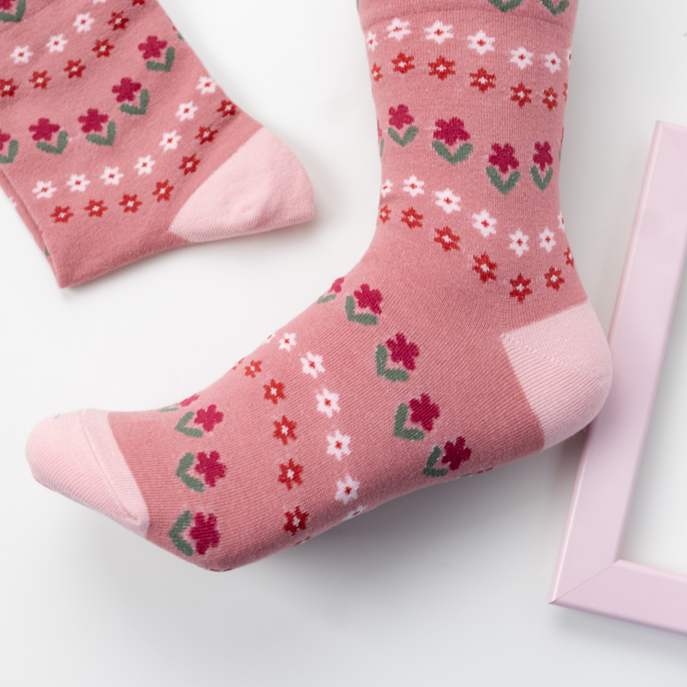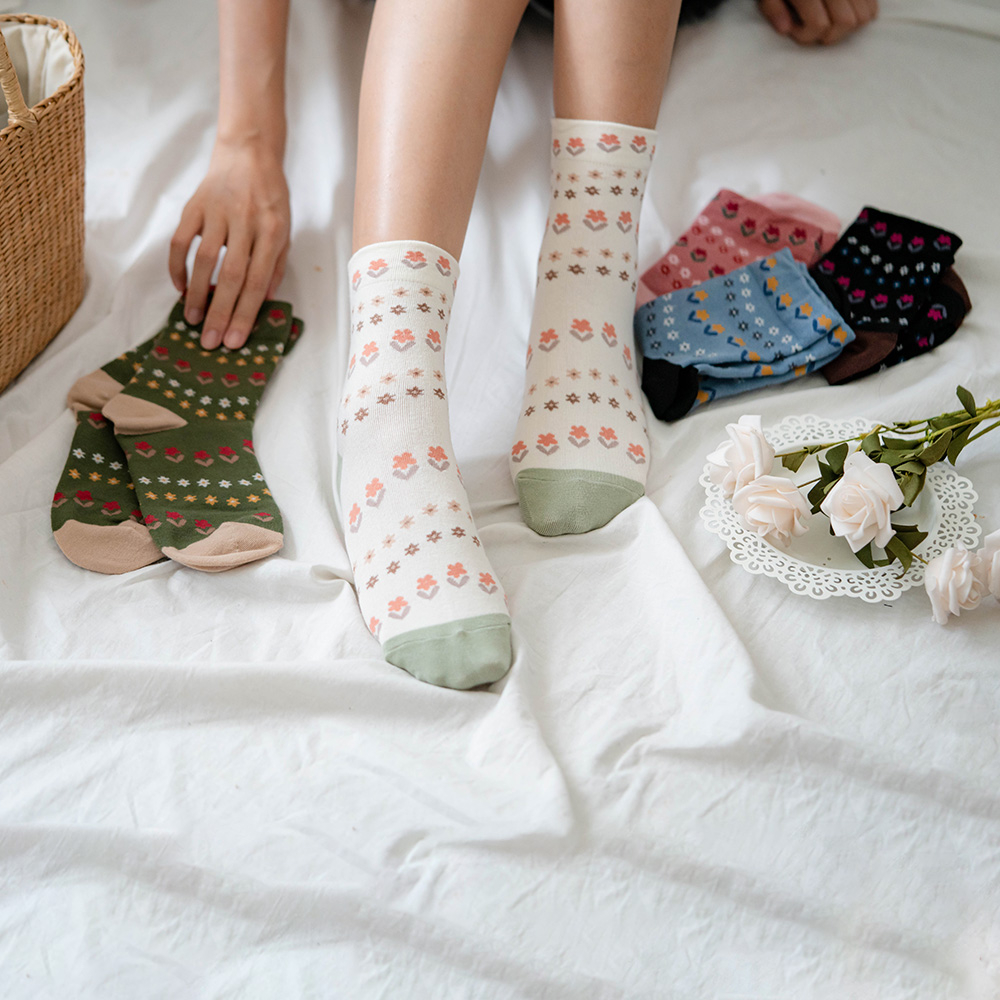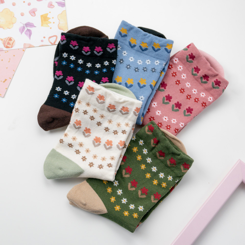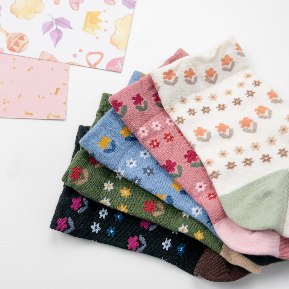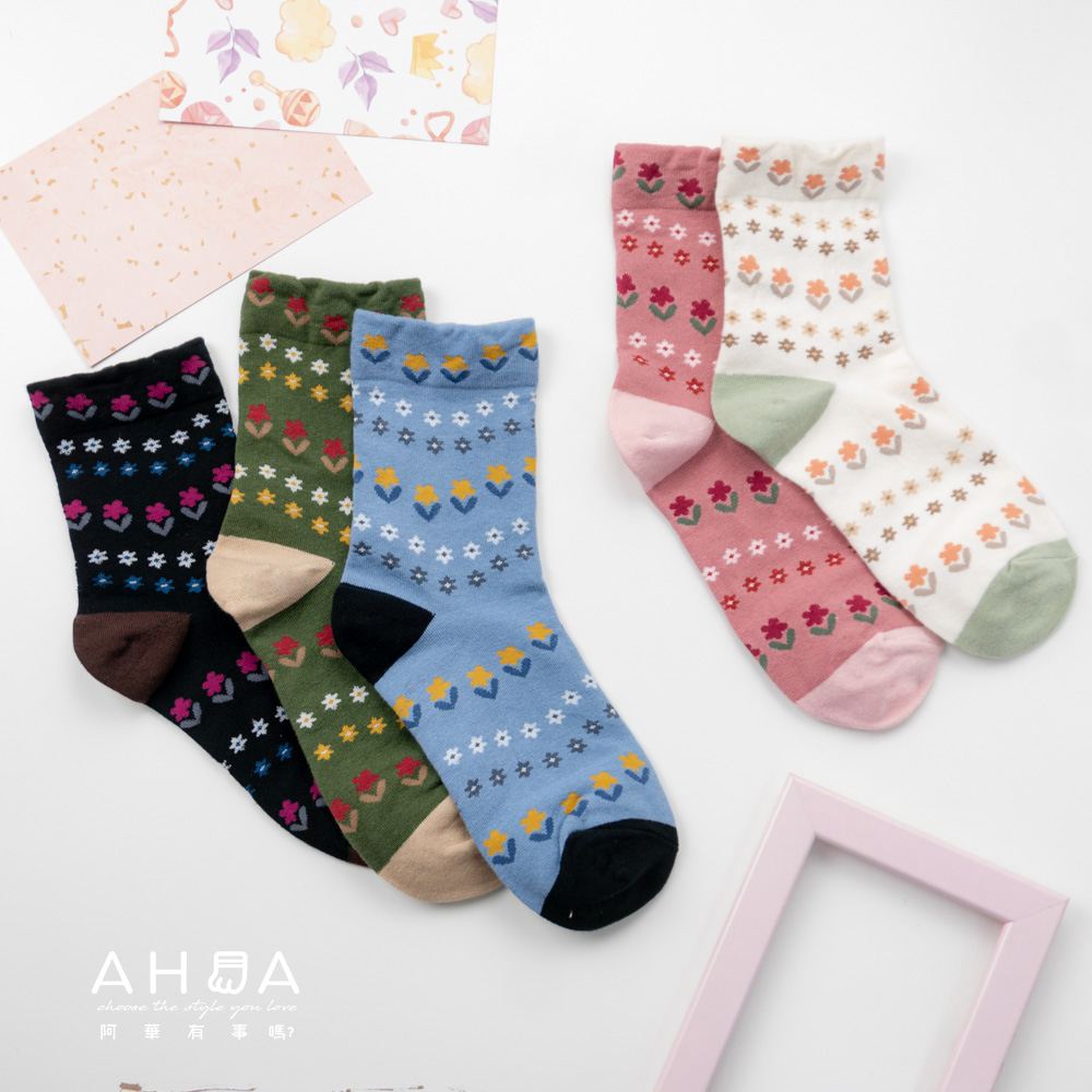 AHUA阿華有事嗎 韓國襪子 滿版波浪花朵中筒襪 K1840 韓妞必備 百搭純棉襪 韓系 日系 可愛 碎花粉底|綠底|藍底|黑底|米白底SocksAHUA 韓國襪子品牌旗艦店