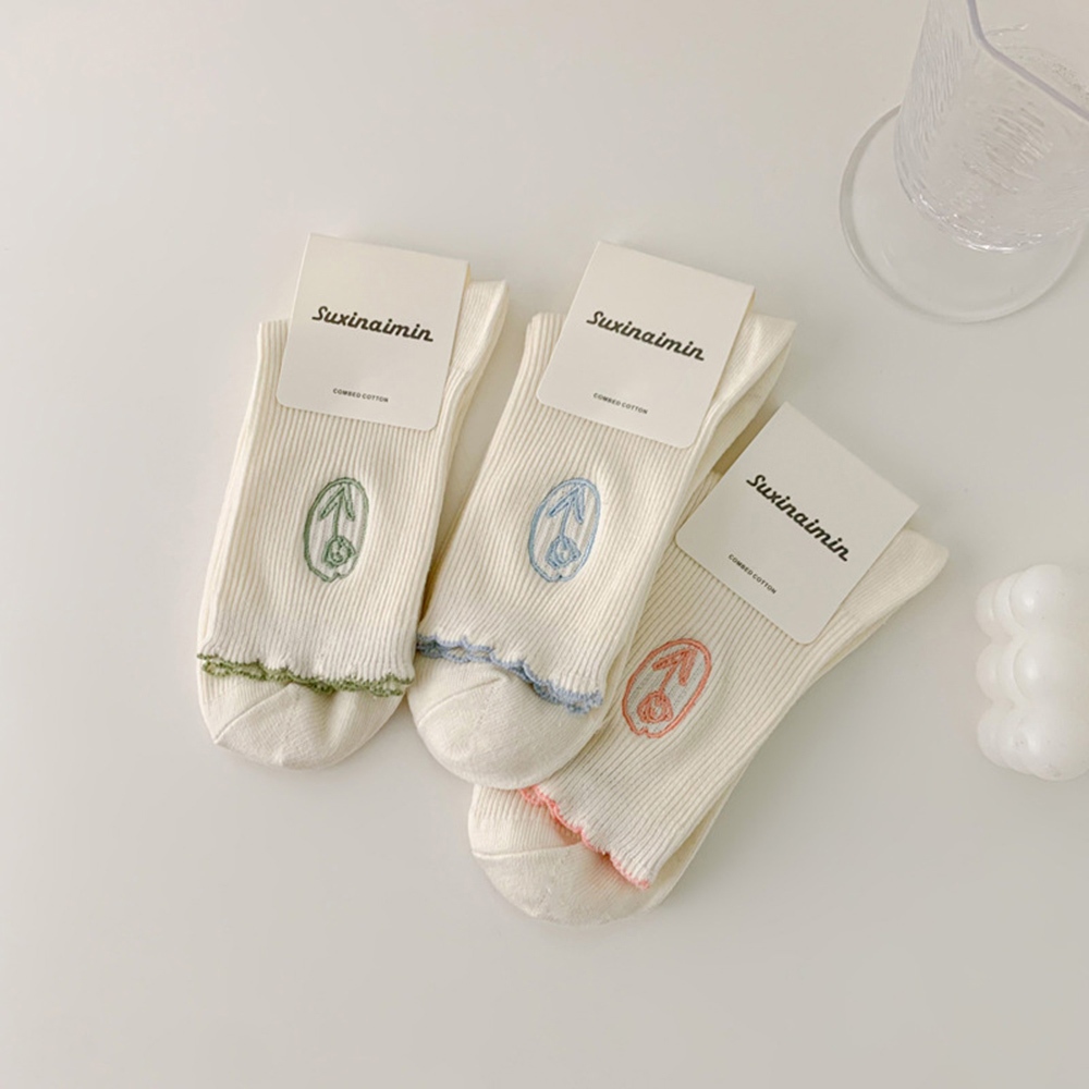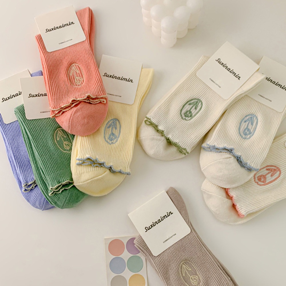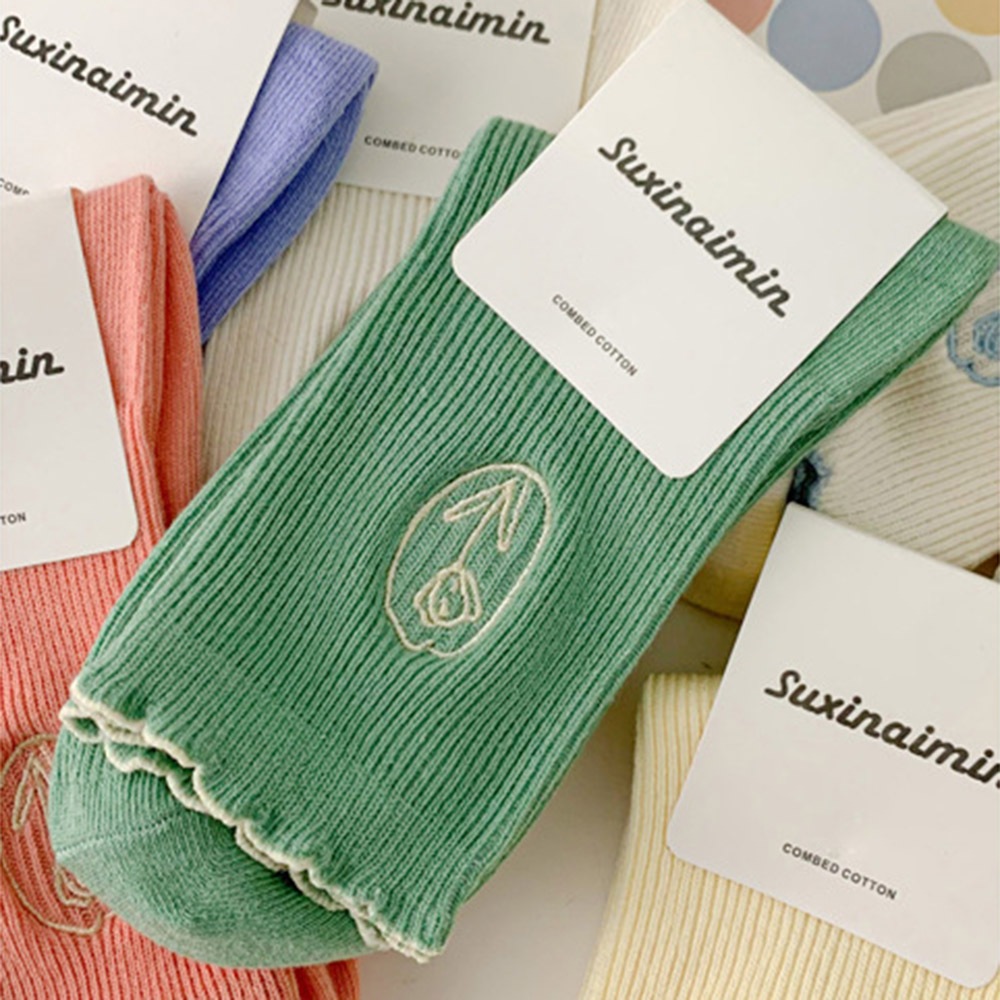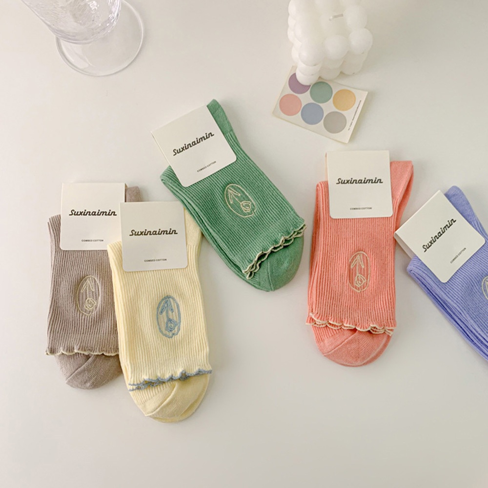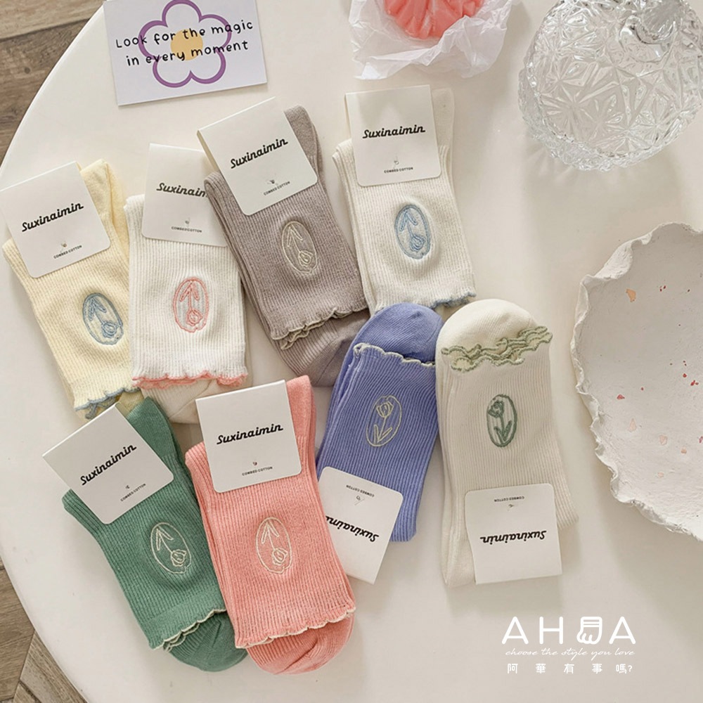 AHUA阿華有事嗎 奶油系刺繡鬱金香花邊中筒襪 S0514 韓妞必備 百搭純棉襪 韓系襪子 少女襪奶茶底|黃底|綠底|粉底SocksAHUA 韓國襪子品牌旗艦店