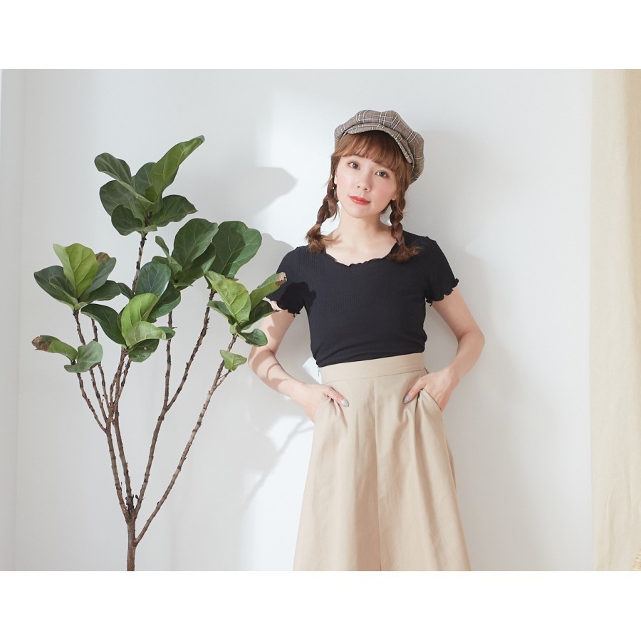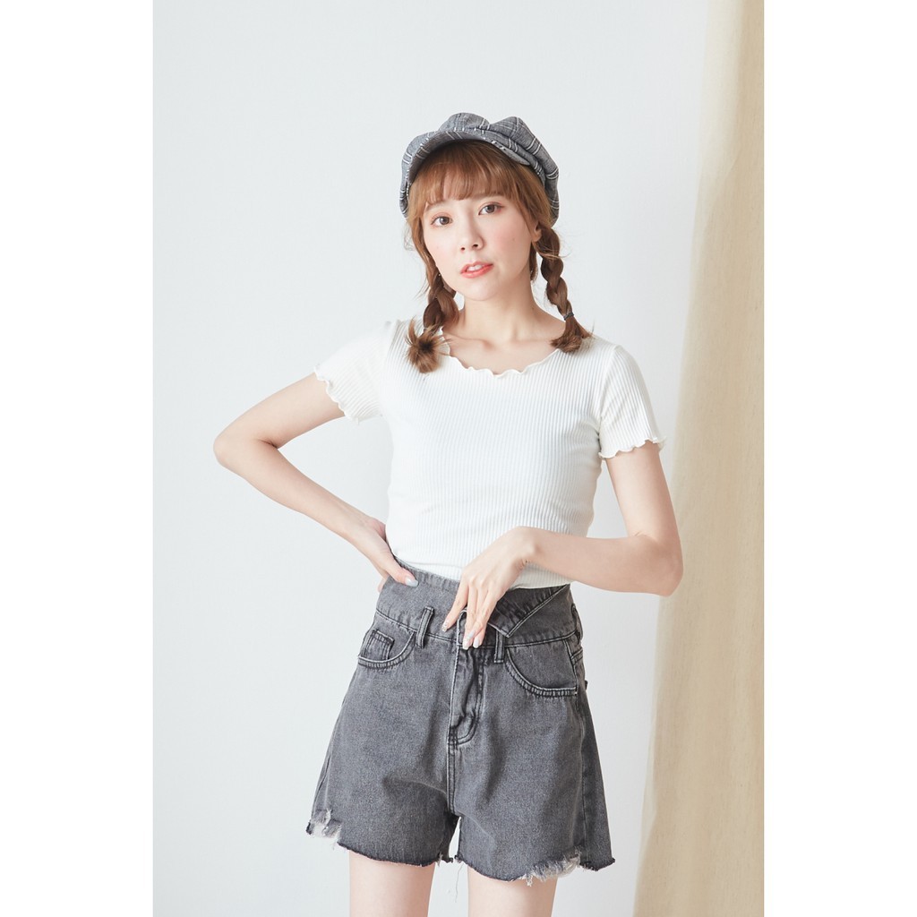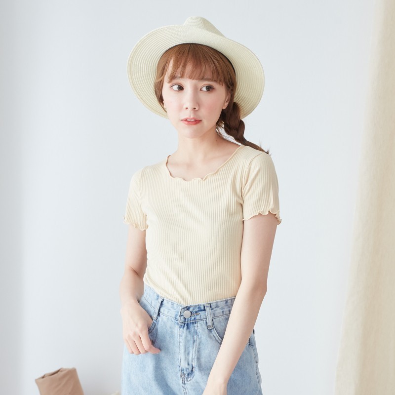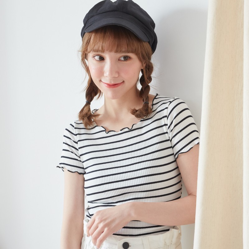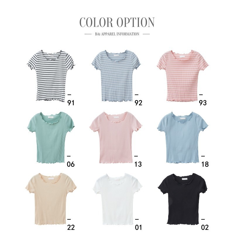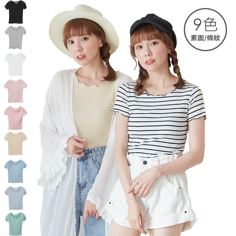 BAi白媽媽 木耳邊上衣/素色橫條坑紋短版T恤-台灣現貨 隔日到貨【350321】米白(01)|黑(02)|綠(06)|粉(13)|藍綠(18)|深杏(22)|米白條(91)|藍灰條(92)|粉條(93)T-shirtsBAi白媽媽 品牌旗艦店