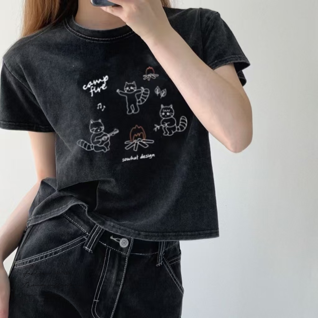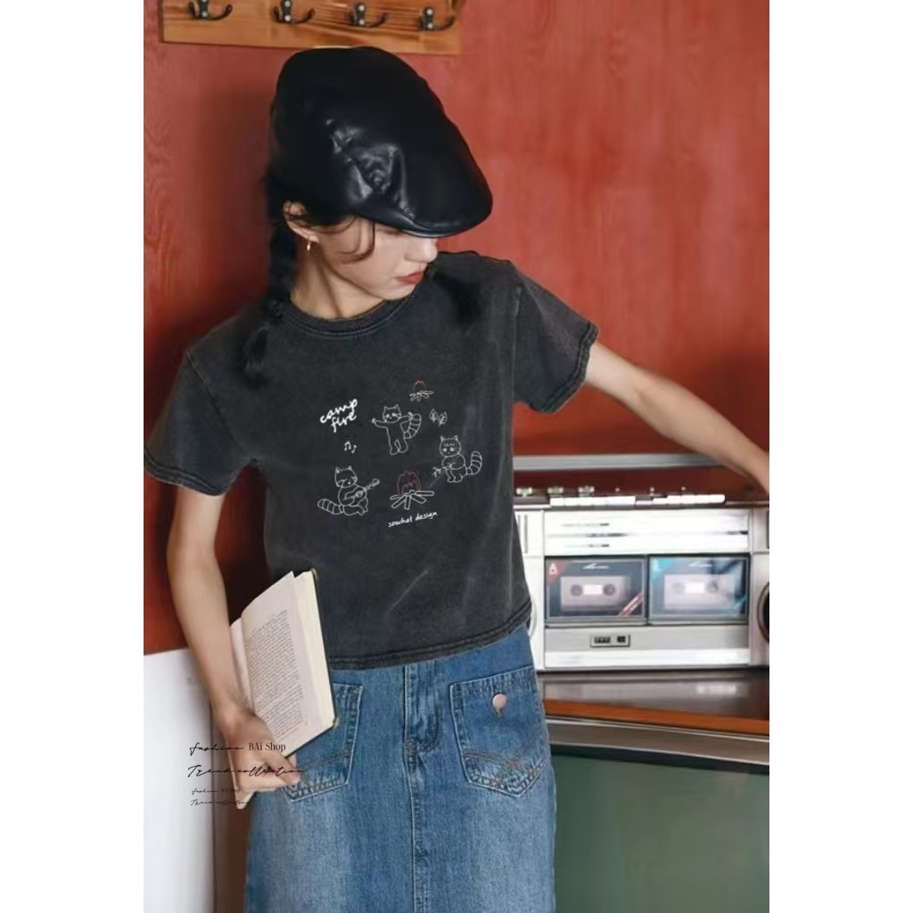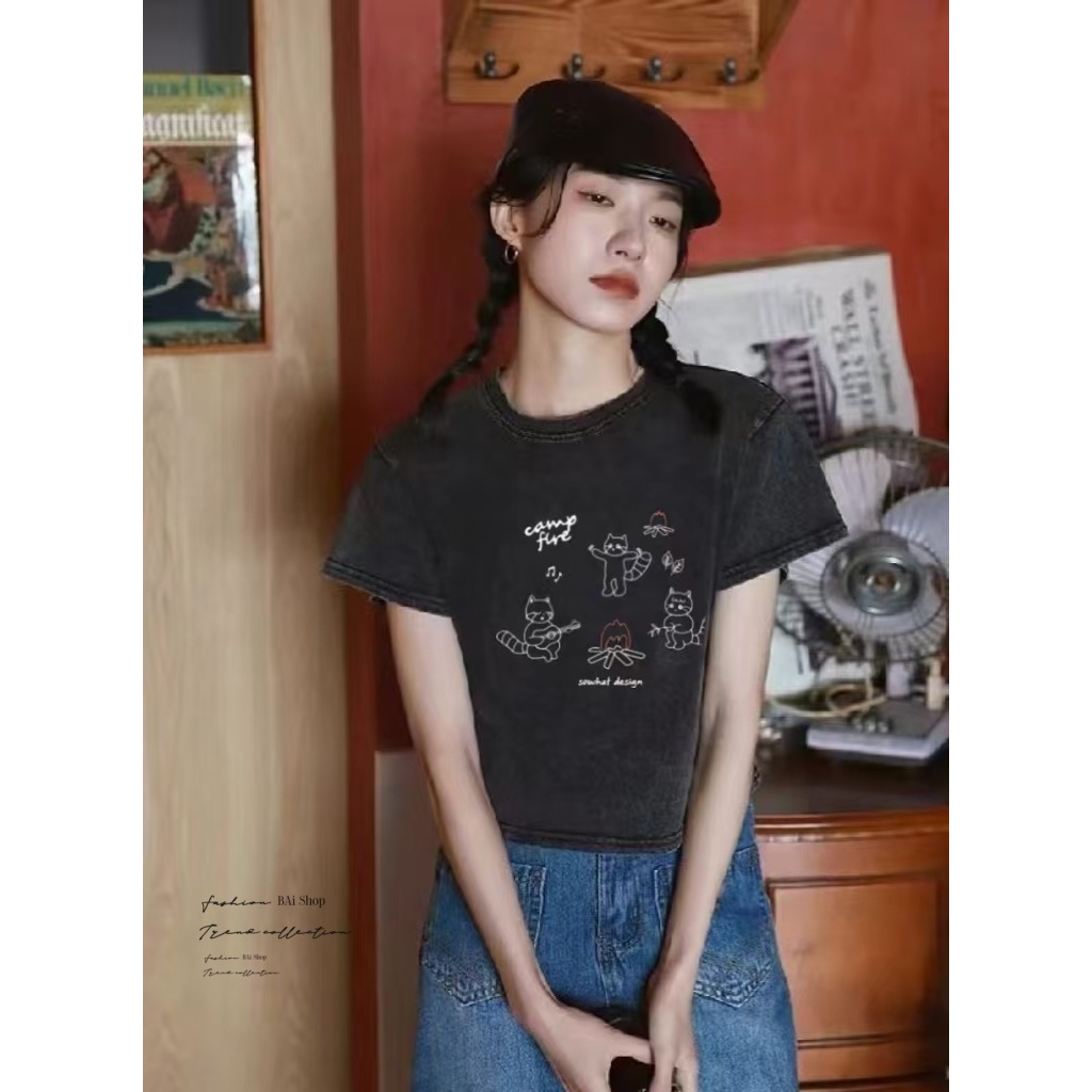 BAi白媽媽 印圖水洗牛仔棉T/丹寧短版短袖T恤-台灣現貨 隔日到貨【350365】黑(02)T-shirtsBAi白媽媽 品牌旗艦店