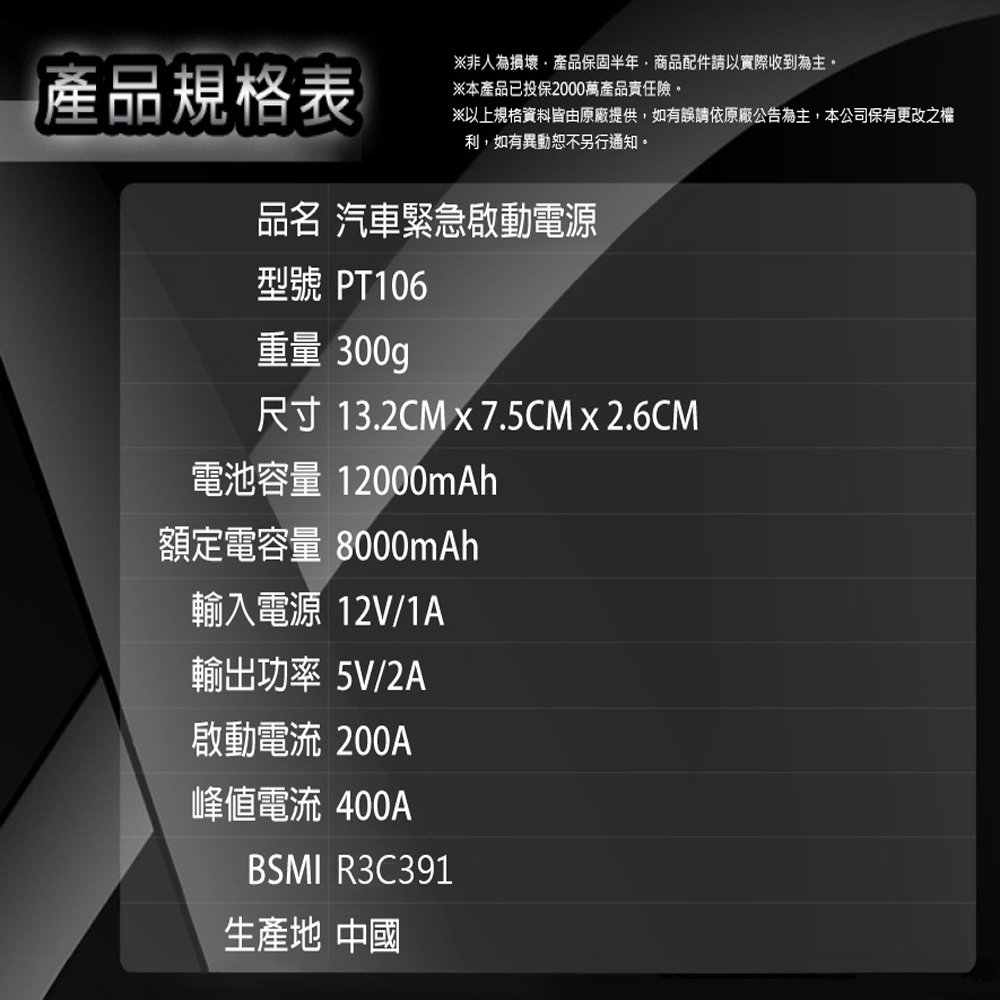 【任e行】PT-106 12000mAh 行動電源 救車電源PT106救車電源(黑色)|PT106救車電源(白色)|PT106救車電源(黑色)+打氣機|PT106救車電源(白色)+打氣機Powerbanks & BatteriesBK.3C 露營旗艦店
