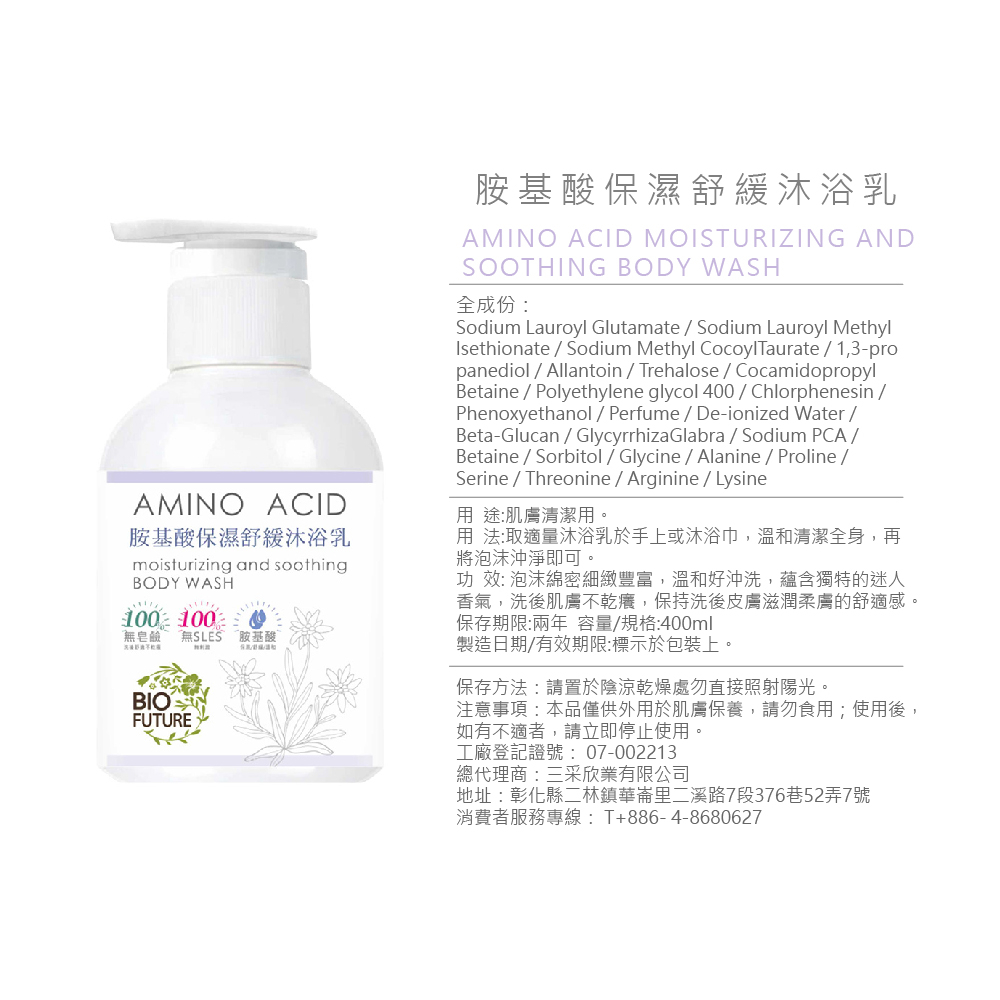 BIOFUTURE 苾菲絲 胺基酸保濕舒緩沐浴乳 400ML 沐浴乳 洗澡胺基酸保濕舒緩沐浴乳 400MLBody Wash & SoapBIO FUTURE 苾菲絲