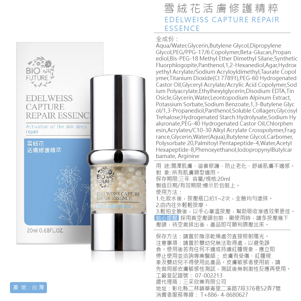 BIOFUTURE 苾菲絲 雪絨花活膚修護精萃20ml 彈性潤澤 深度修護 延緩肌膚老化 淡化細紋20mlFacial Serum & EssenceBIO FUTURE 苾菲絲