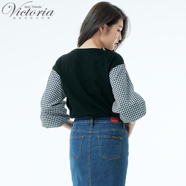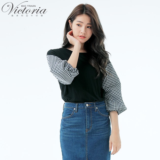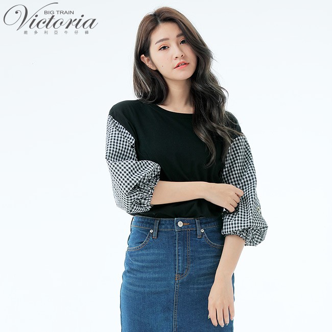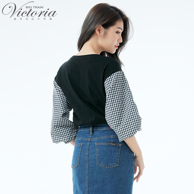 VICTORIA 異材質拼接愛心繡七分花苞袖T-黑S|MT-shirtsBIG TRAIN 官方旗艦店