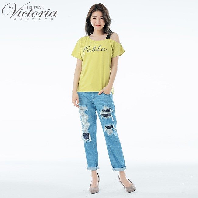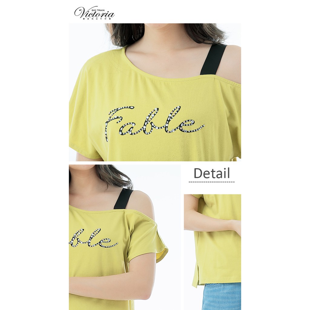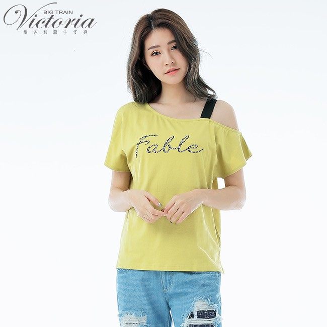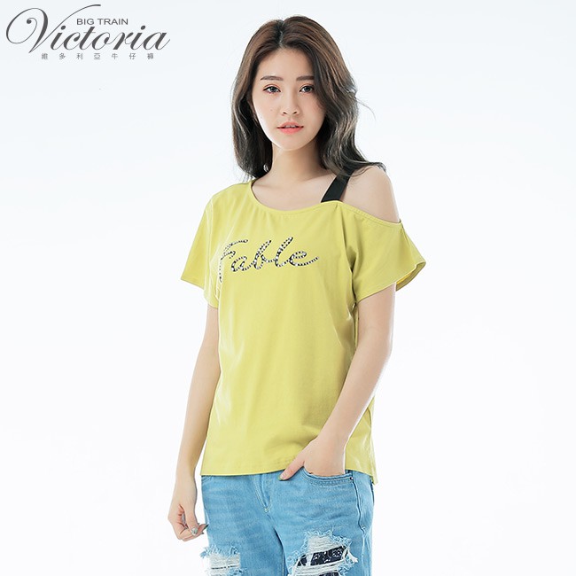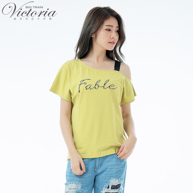 VICTORIA 不對稱領貼片文字短袖T-芥黃V85451-36S|MT-shirtsBIG TRAIN 官方旗艦店