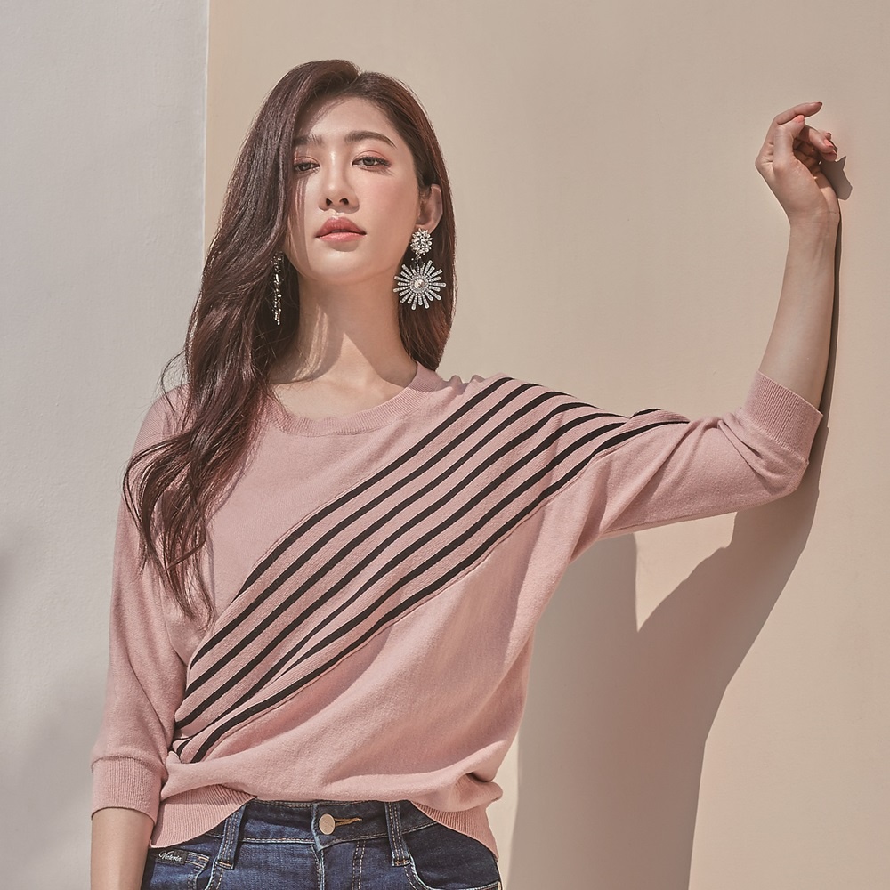 VICTORIA 不對稱條紋落肩短袖線衫 粉V65134