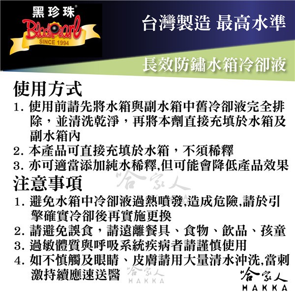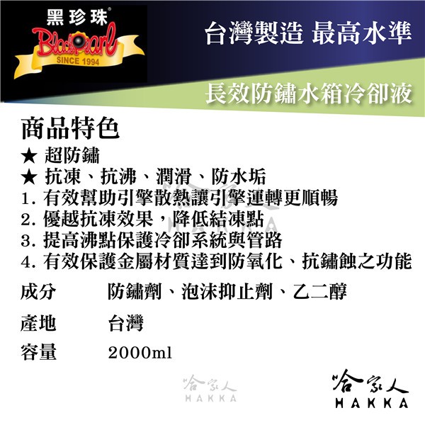 【 黑珍珠 】長效防鏽水箱冷卻液 高濃度水箱精 2000 ml 防鏽 防凍 潤滑 防水垢 散熱 防氧化 附發票 哈家人【 黑珍珠 】長效防鏽水箱冷卻液 高濃度水箱精 2000 ml 防鏽 防凍 潤滑 防水垢 散熱 防氧化 附發票 哈家人Antifreezes & Coolants【 哈家人 】油Shop